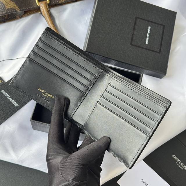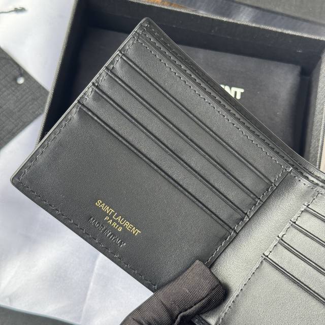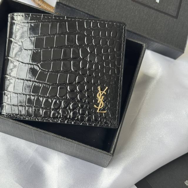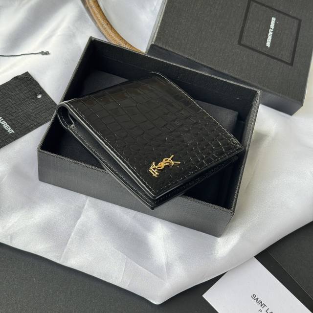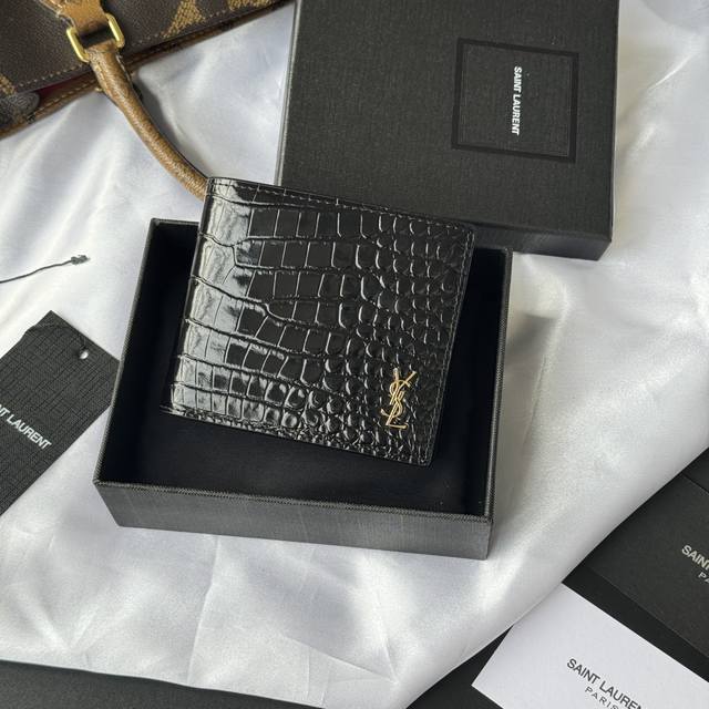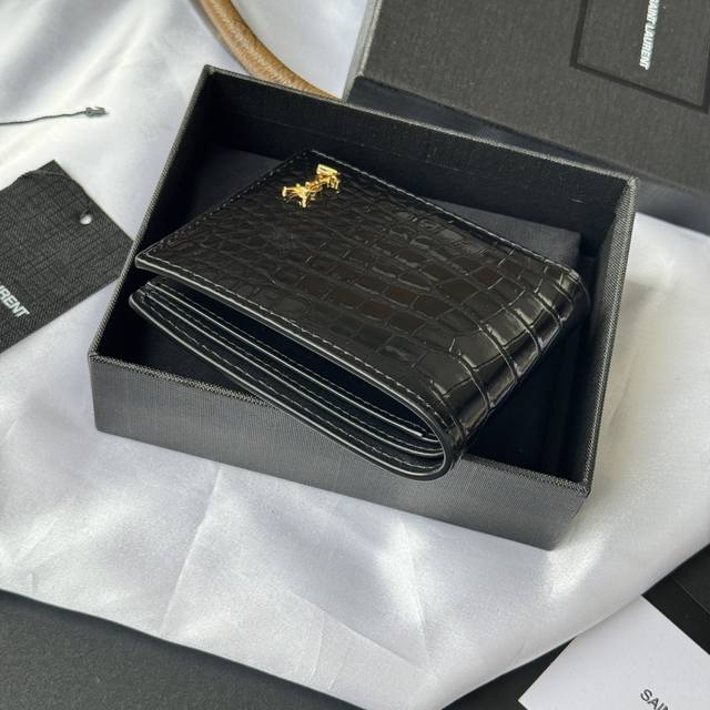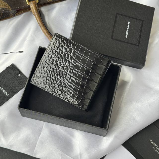 Authentic YSL Men's Wallet, Black Crocodile Pattern, Made of Leather Monogram Bi-fold Wallet with Card and Bill Storage, Adorned with Metal YSL Logo. Interior: Two bill compartments, eight card slots, and two bill compartments. Model: 607727. Dimensions: 11*9.5*2.5Cm.
