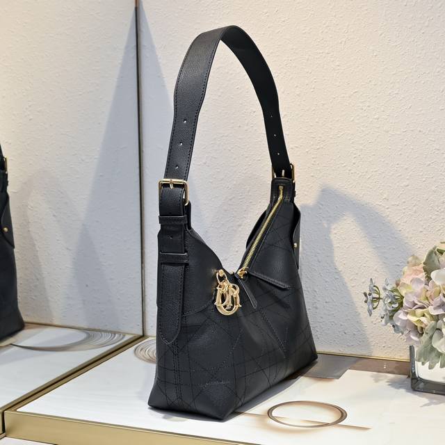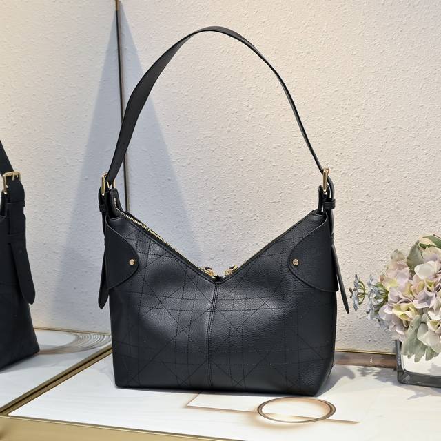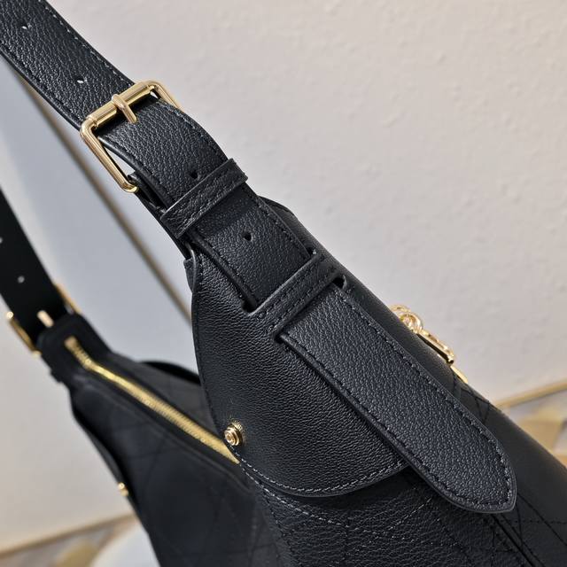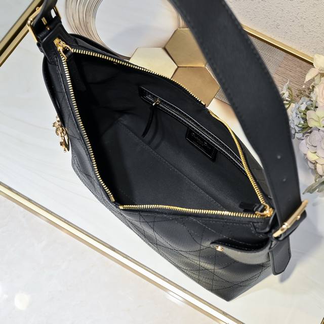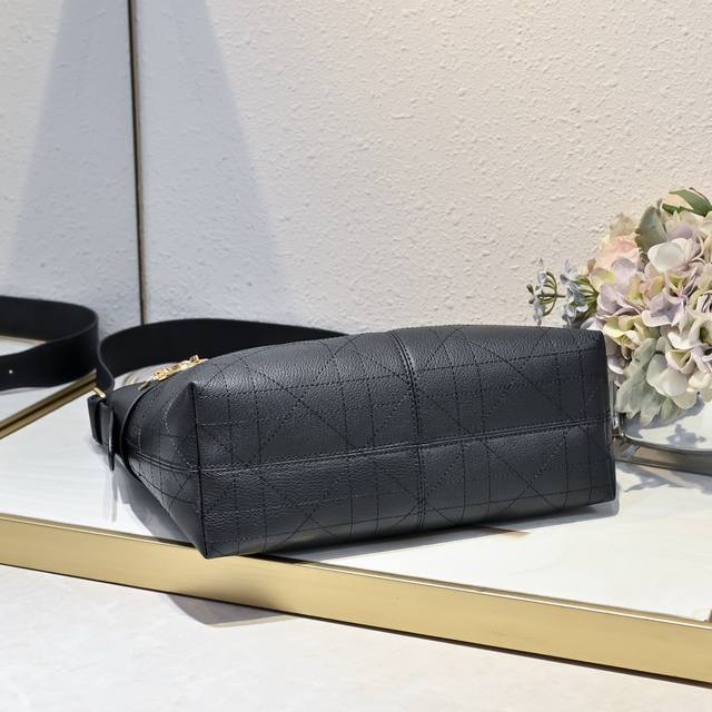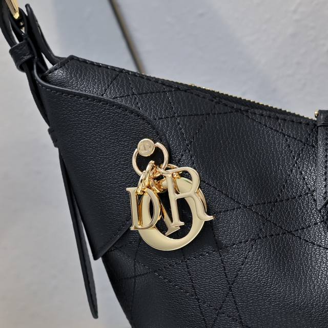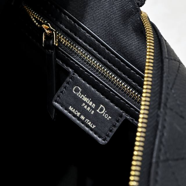 Black Large. This Dior Voyage handbag is a new addition to the 2026 Early Spring Ready-to-Wear collection, blending soft lines and elegant details to create a harmonious silhouette. Crafted from black pleated calfskin, it features flat, oversized cannage stitching, a fresh interpretation of Dior's classic pattern. The soft silhouette is enhanced by vintage gold-finished DIOR charms and meticulously crafted leather accents, giving it a more structured look. The main compartment features a secure and practical two-way zip closure. The medium size includes a top handle with an adjustable buckle, allowing for shoulder carrying, making it an ideal companion for everyday wear. Small size: 22 x 15 x 9.5 cm (Length x Height x Width) M2845; Large size: 28 x 18 x 12 cm (Length x Height x Width) M2846.