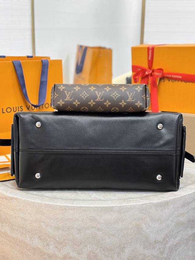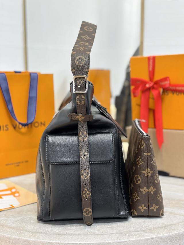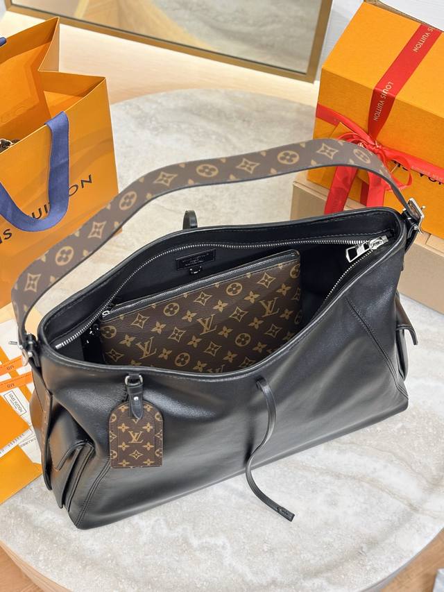 This Carry All Travel Bag handbag is crafted from supple cowhide leather, incorporating Monogram canvas elements into the brand name and interior lining. Its elegant design makes it an excellent choice for travel. Multiple pockets, including side compartments, highlight its functionality. The detachable and adjustable shoulder strap ensures a comfortable carrying experience. Size: 45X29X20Cm