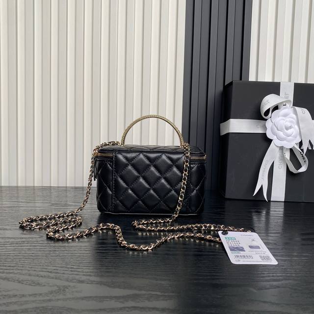 Chanel 124B Rhinestone Handle Makeup Bag Ap6290 It's so beautiful, I fell in love at first sight! The handle design is so exquisite, the rhinestones are sparkling and irresistible. The small bag size, combined with the unique spiral handle and lambskin leather, makes it playful yet elegant. The double C clasp on the bag is inlaid with small rhinestones