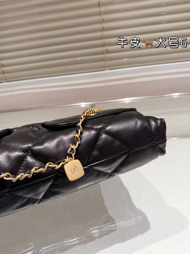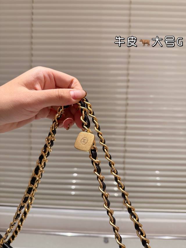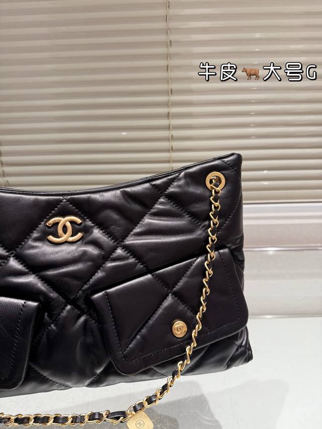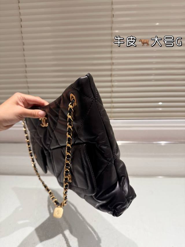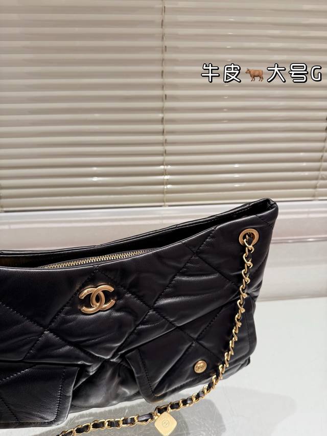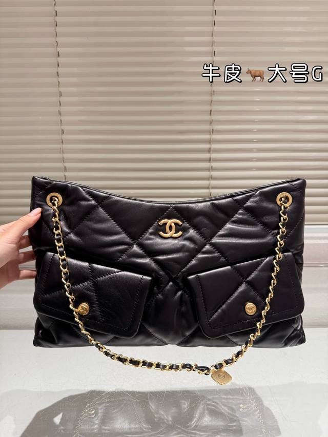 Chanel 25K Black Gold Hobo Shopping Bag (Made in Lambskin) This Chanel 25K black gold Hobo shopping bag features classic quilted stitching and double C hardware, with a highly recognizable chain and small gold plaque. Made of soft and durable lambskin, the black color is versatile and a must-have for autumn and winter! The bag has a relaxed and casual shape, ample capacity, and excellent storage with front and back pockets and compartments. Measuring approximately 39 x 8 x 26 cm, it's suitable for both work and leisure. The chain allows for hand-carrying or shoulder-carrying, making it flexible, versatile, practical, and stylish. A popular autumn/winter item, it also holds its value well!
