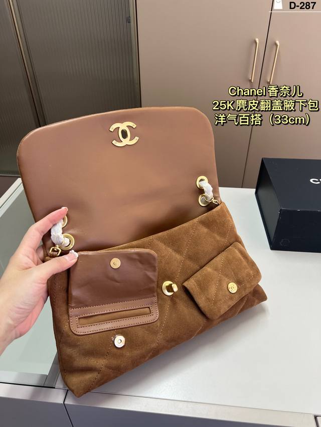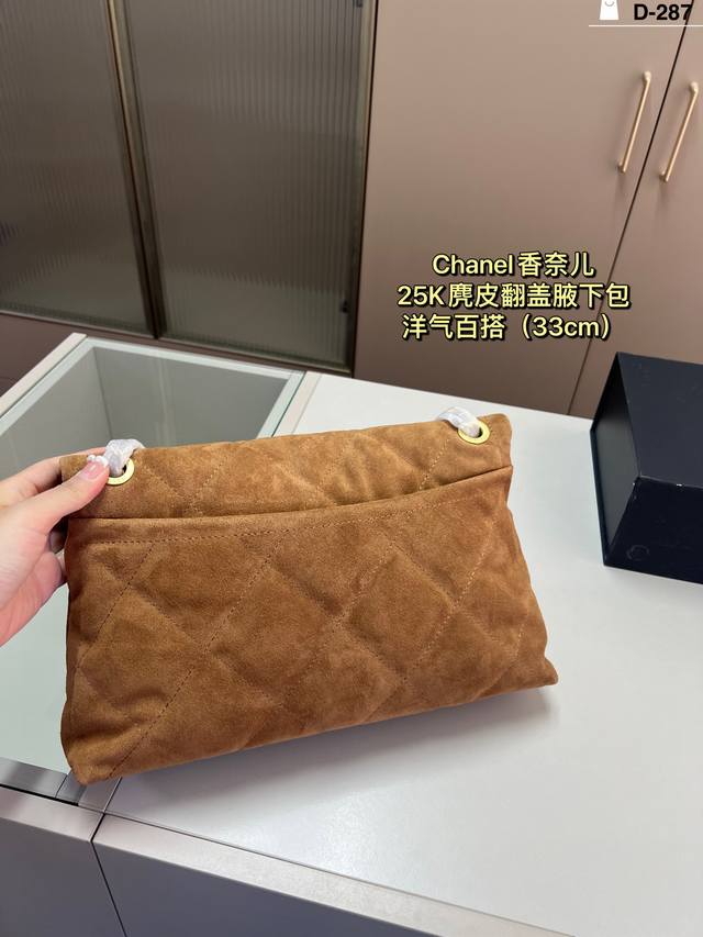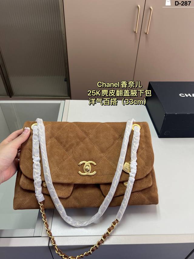 Chanel 25K flap shoulder bag. This bag combines all the classic elements of Chanel: quilted design, leather chain, and the double C logo. Size D-287: 33
