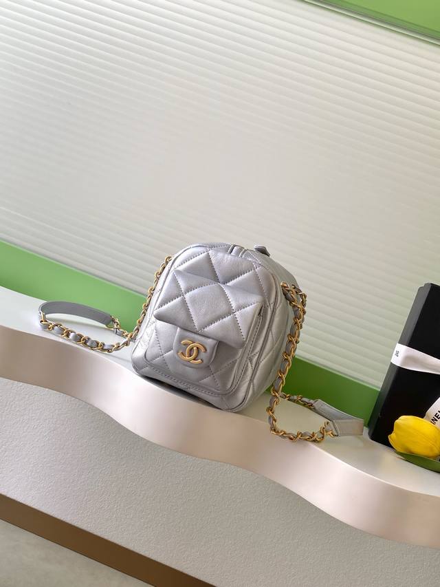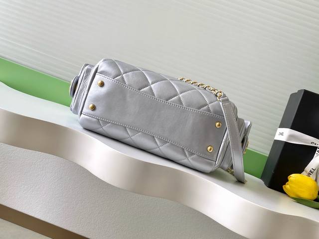 Chanel 25K lambskin bowling bag. The pebbled leather bowling bag with brushed hardware exudes a vintage feel. Two small side pockets add a touch of design flair. The interior is incredibly spacious; it's a practical choice for autumn and winter. Style number As5792. Dimensions: 15.5-24-11.5 mm. Comes with packaging.