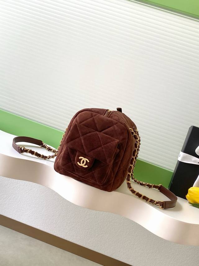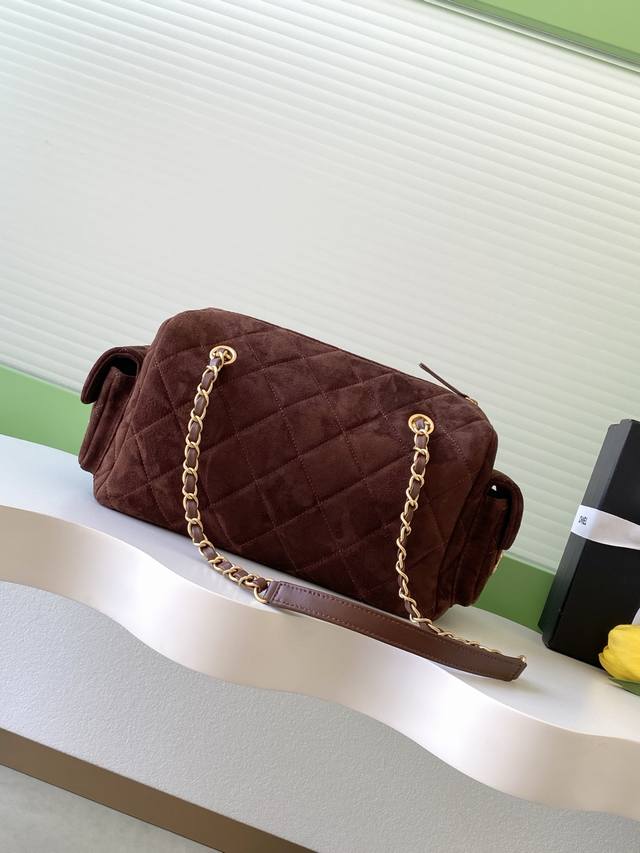 Chanel 25K nubuck leather bowling bag. The pebbled leather bowling bag with brushed hardware exudes a retro feel. Two small side pockets add a touch of design flair. The interior is incredibly spacious; it's a really practical choice for autumn and winter. Style number As5791. Dimensions: 18.5-27-13.5 cm. Comes with packaging.