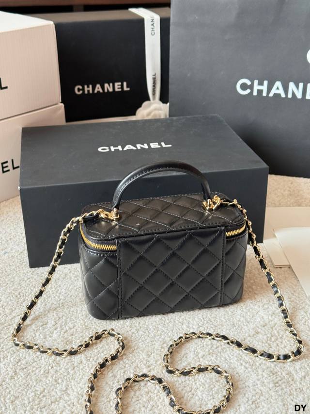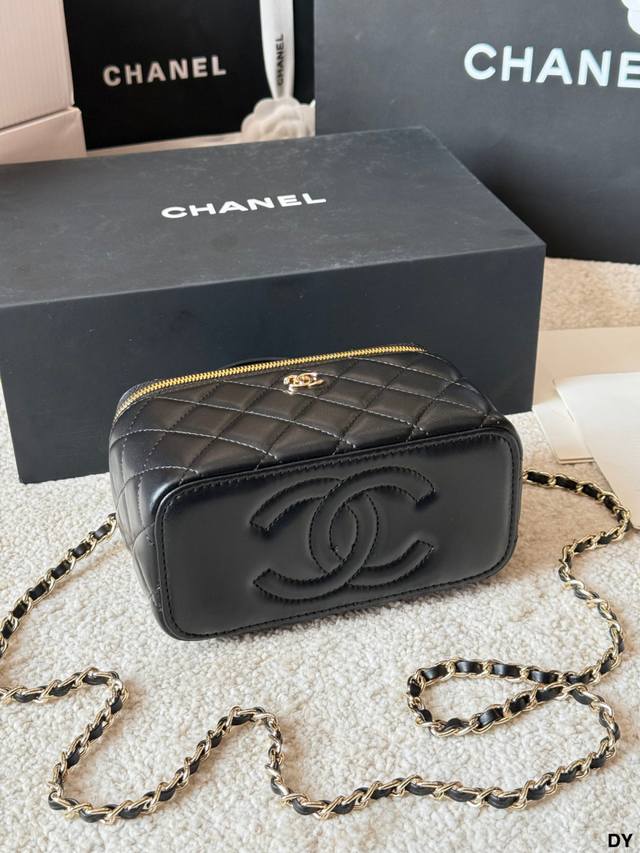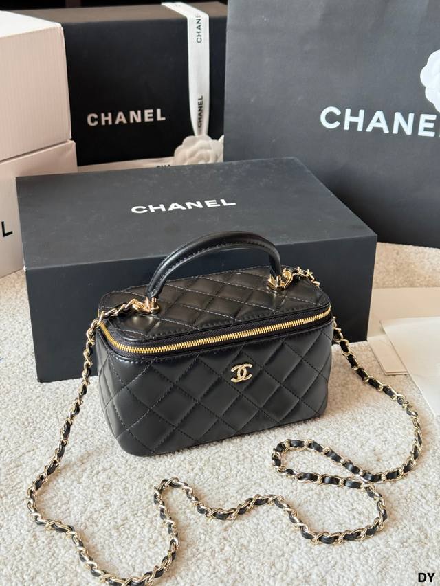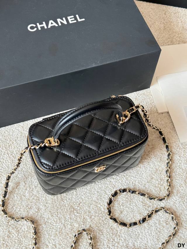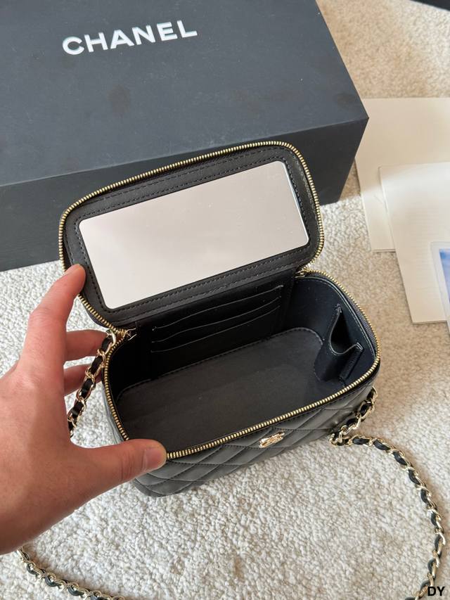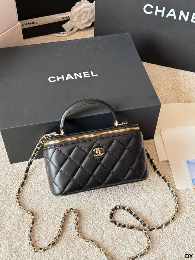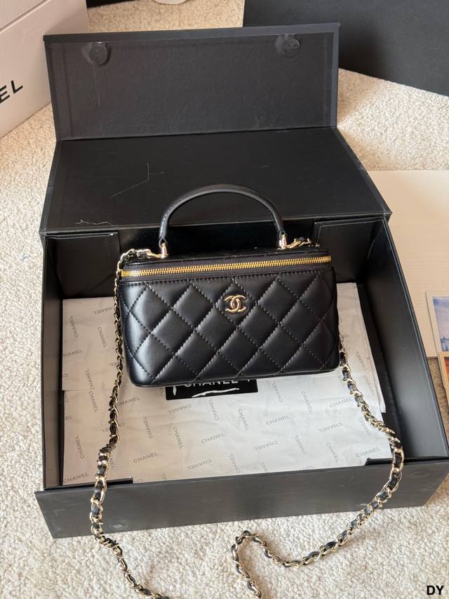 ) This Chanel long box makeup bag features black lambskin leather with classic quilted stitching and a highly recognizable gold double C logo. It has a top handle and a leather-threaded chain shoulder strap, making it versatile for hand-carrying or crossbody wear. Measuring approximately 18 x 12 cm, it includes an interior mirror for convenient storage of cosmetics and small items. Perfect for everyday outings and afternoon tea, this practical and stylish Chanel classic is a must-have. (