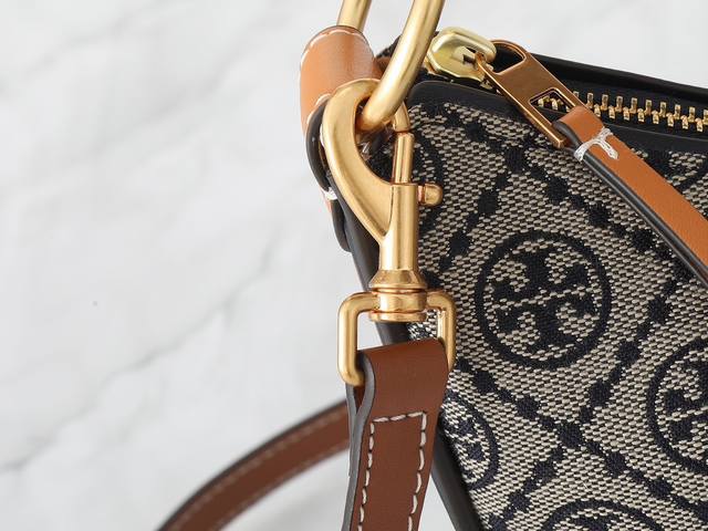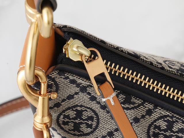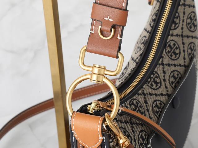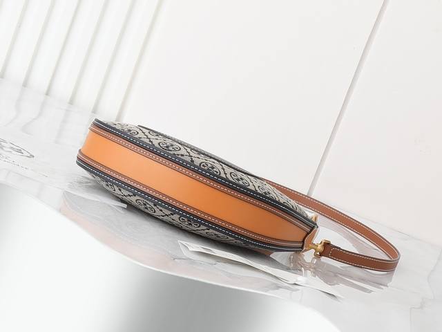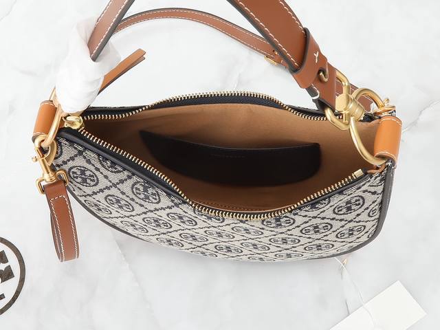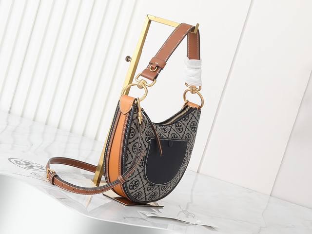 Classic Collection, New Arrival with Attention to Detail: Tory Burch's classic Tmonogram pattern, inspired by traditional Pennsylvania quilting, is meticulously crafted from woven jacquard fabric, exuding timeless charm and distinctive personality. The iconic Tmonogram pattern is reinterpreted with new proportions, textures, and thicknesses. This lightweight crescent bag is crafted from woven jacquard, showcasing ingenuity and exquisite craftsmanship. It features a soft faux suede lining and an interior pocket for organized storage of essentials. An external compartment provides ample space for small items, ensuring easy access. It can be worn as a shoulder bag or crossbody with the detachable strap. Every design detail emphasizes practicality and functionality. 20cm high, 25cm long, 5cm deep. Jacquard leather trim, brass hardware, zip closure.