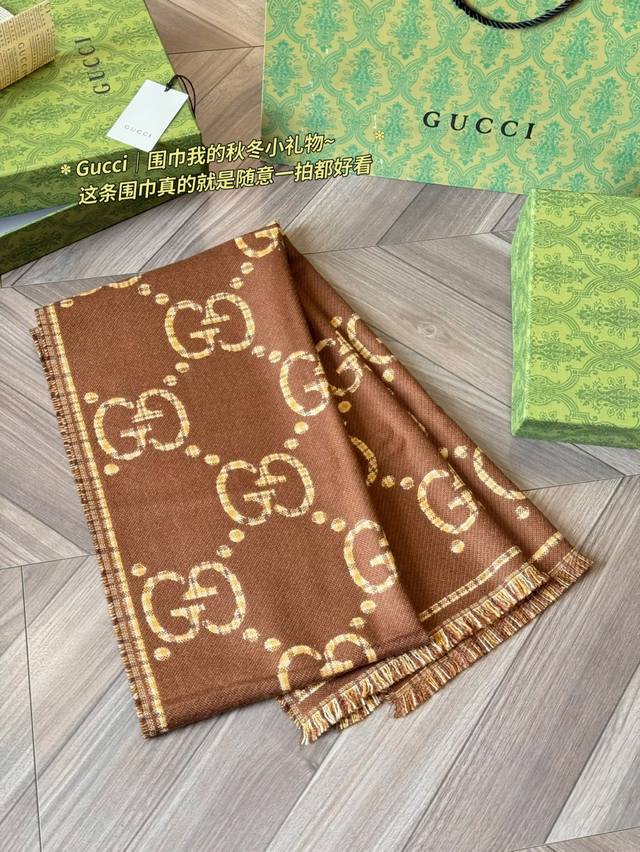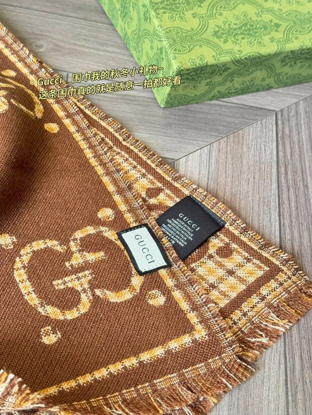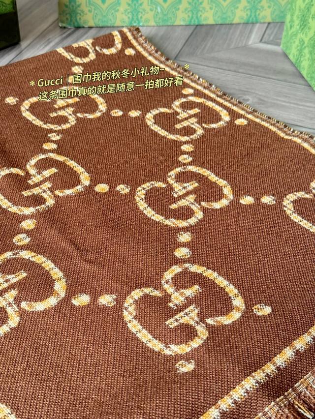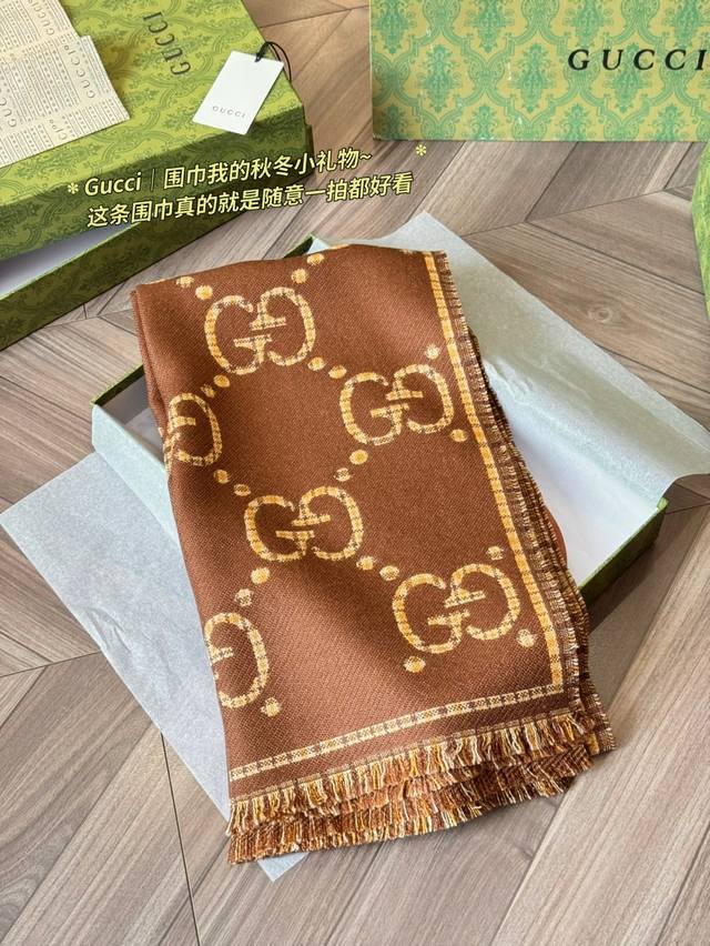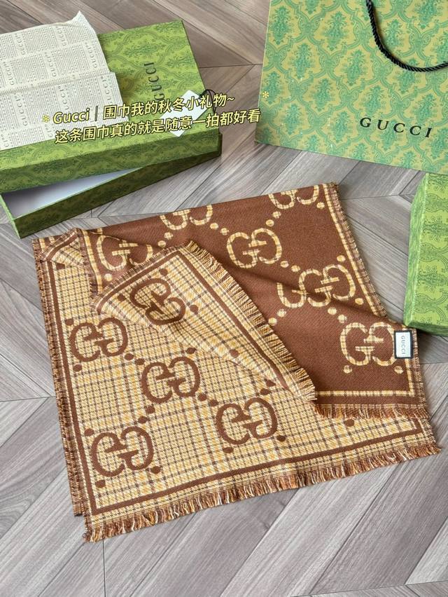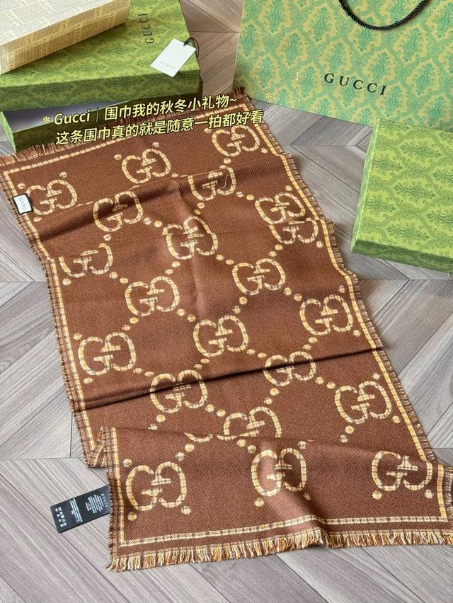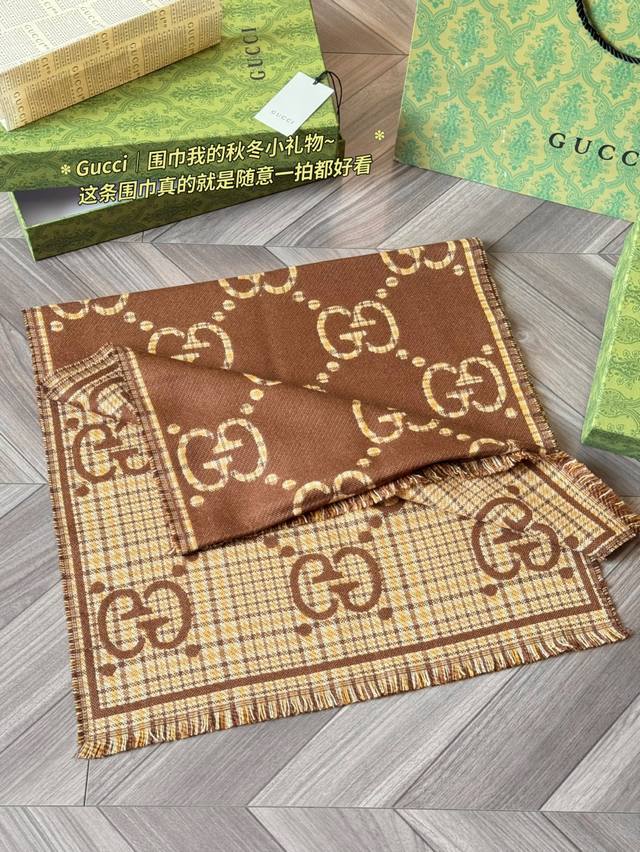 Classic Original Cashmere Gucci Gg Jacquard Wool Scarf, Model 660025, made of 100% wool, soft and warm, a must-have for autumn and winter! Features the classic double G pattern + brown and beige plaid, retro and elegant, size 47X180Cm, reversible, super versatile. Inspired by the 1930s, this scarf incorporates iconic Gucci elements, stylish yet practical. Perfect for everyday commuting or as a holiday gift, comes in a gift box for a special touch.