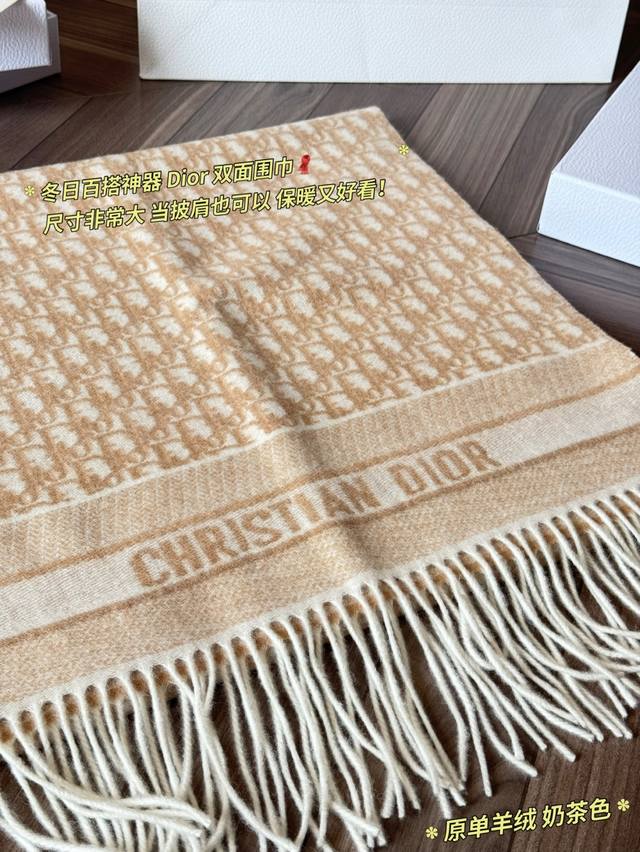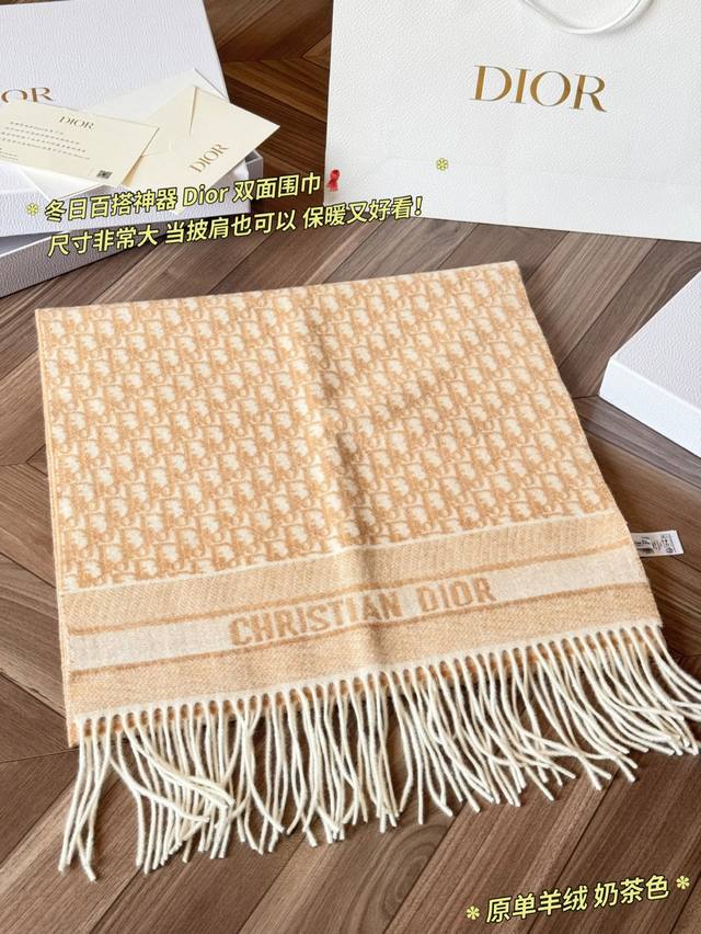 . Made with high-quality cashmere, this Dior Oblique cashmere scarf is soft and warm, a must-have for autumn and winter! It features a double-sided design: one side boasts the classic Oblique print, while the other is a solid color, offering exceptional versatility*. Long tassels and "Christiandior" jacquard details showcase impeccable craftsmanship. The beige and light brown color scheme is understated yet sophisticated, easily adaptable to both work and formal occasions