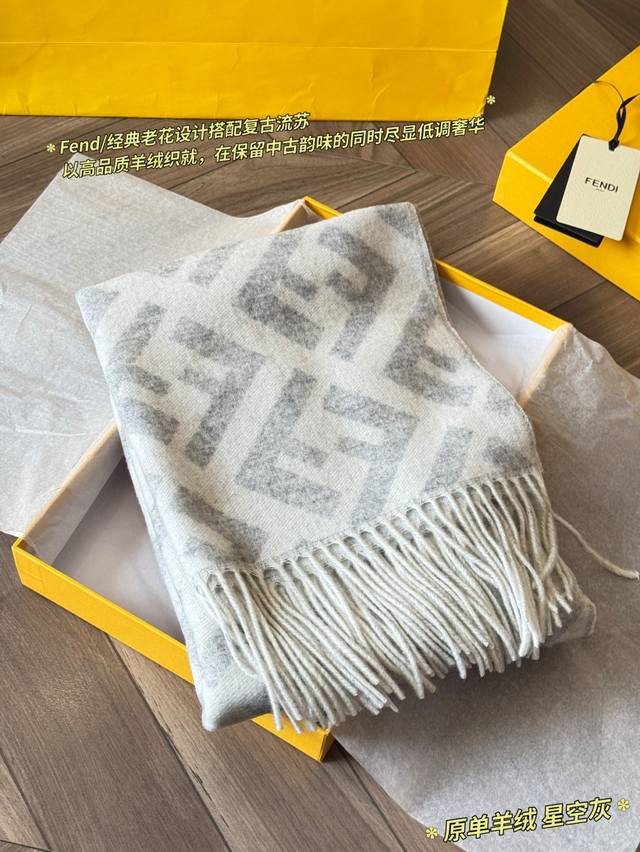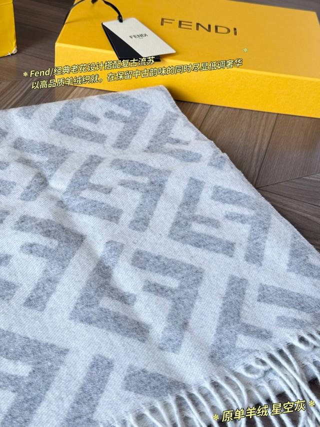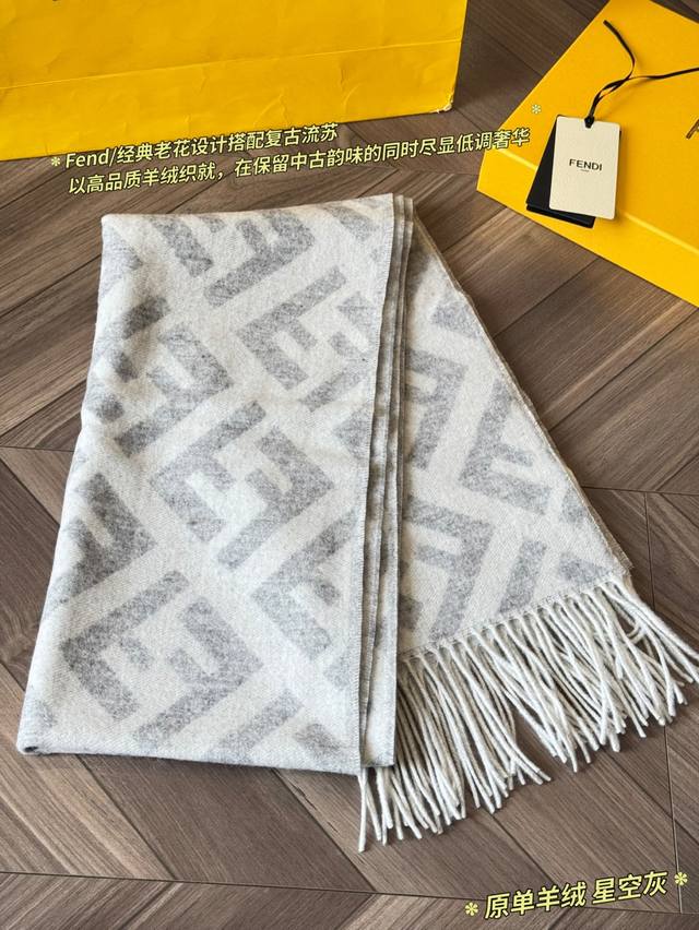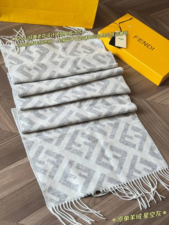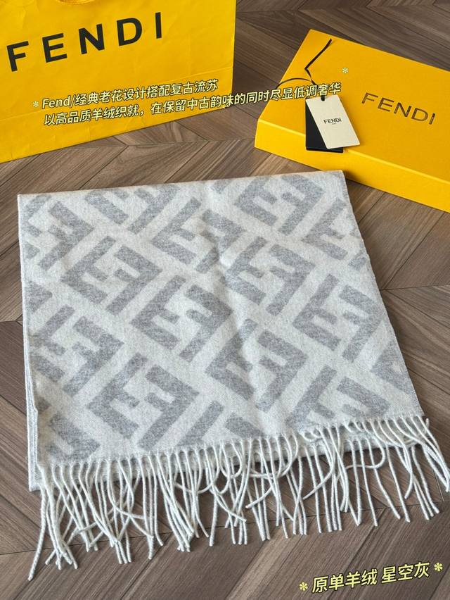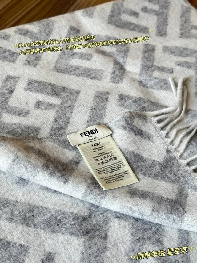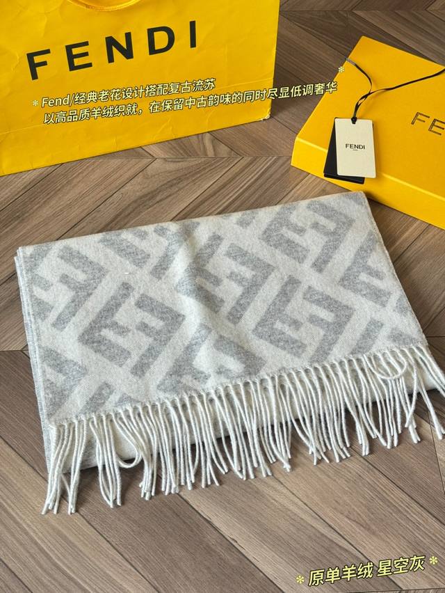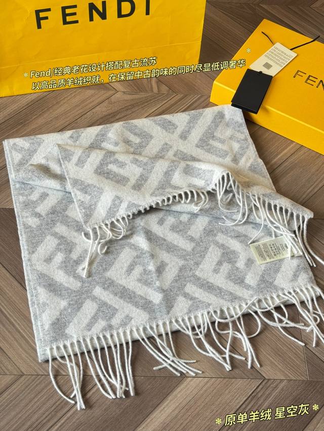 Fendi FF. Made of 100% cashmere, soft and skin-friendly, a must-have for autumn and winter! The light gray and creamy white color scheme is understated and elegant, with the classic FF monogram pattern that is highly recognizable. Size: 45X170Cm. The tassel design allows it to be worn as a scarf or shawl, versatile and practical. Lightweight and warm cashmere enhances the overall look, suitable for commuting or formal occasions. A must-have fashion item for autumn and winter!