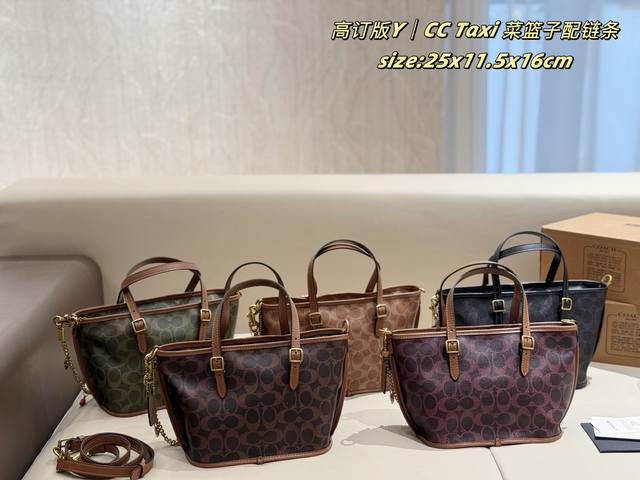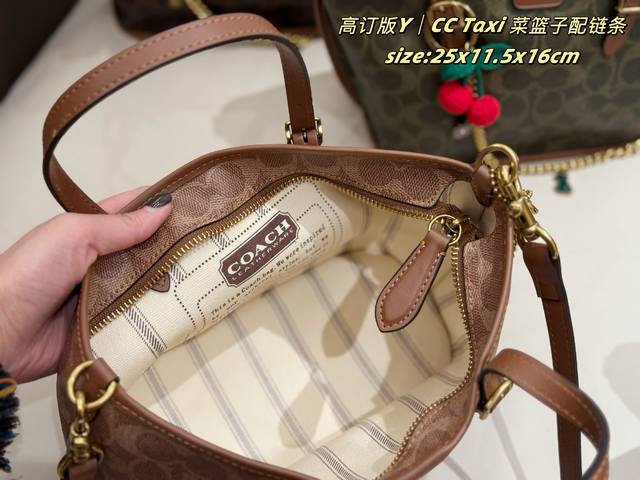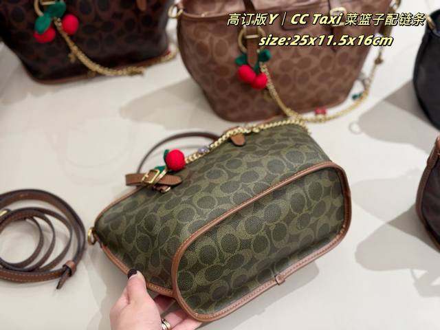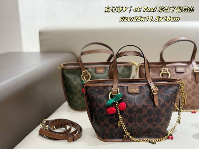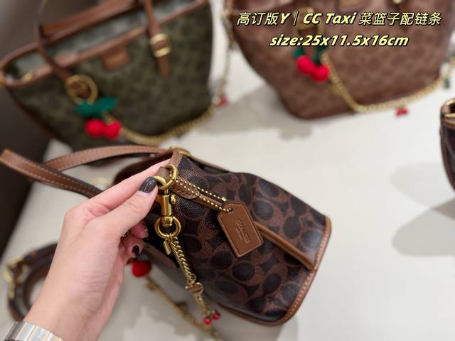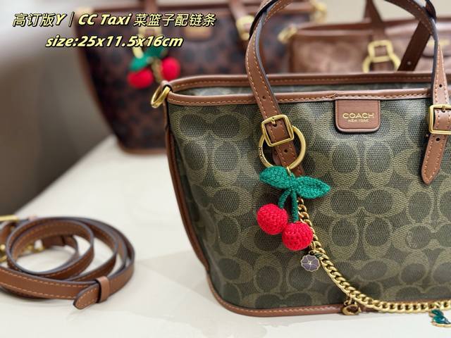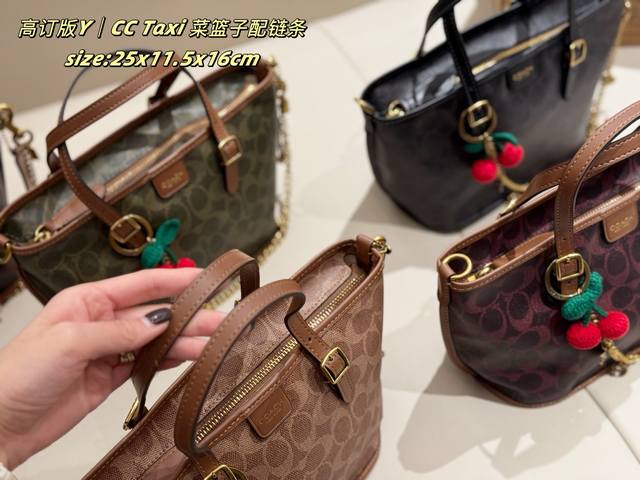Coach Taxi bag with cherry chain and airplane case. Compact size, but surprisingly spacious. It can easily hold a water bottle and umbrella, and the material is lightweight and durable. It's a bag that will last a long time. It looks great carried by hand or crossbody, and even better with a charm! DIY your own style! The top zipper design gives a sense of security. I love the black and gray C logo; it's understated yet stylish. Size: 25 x 11.5 x 16 cm.