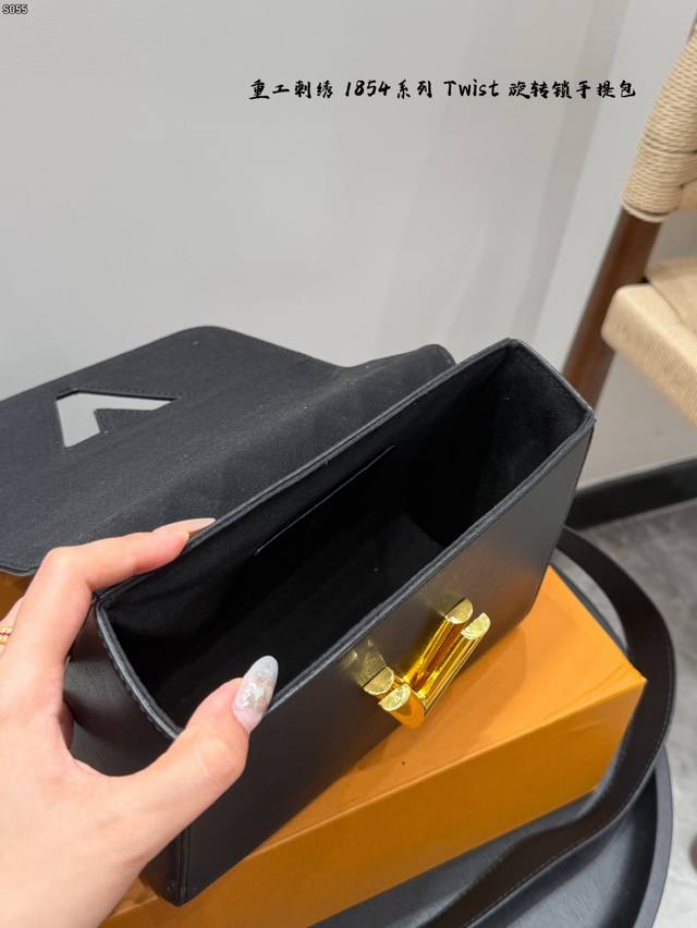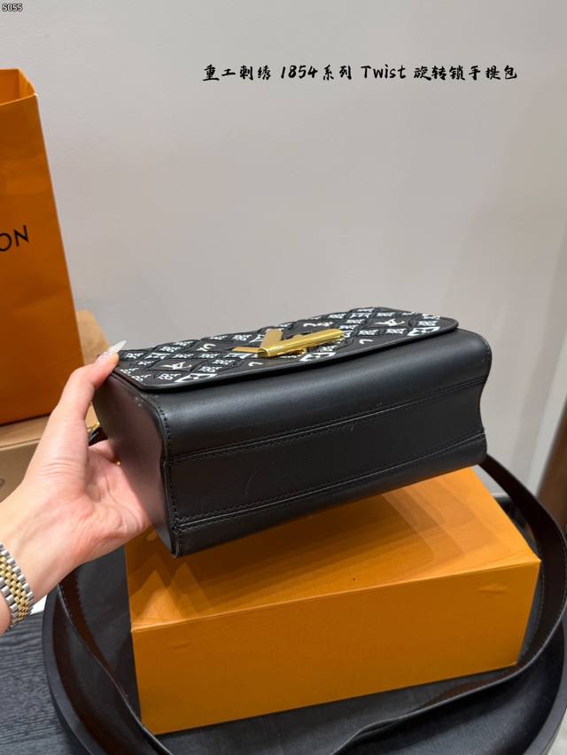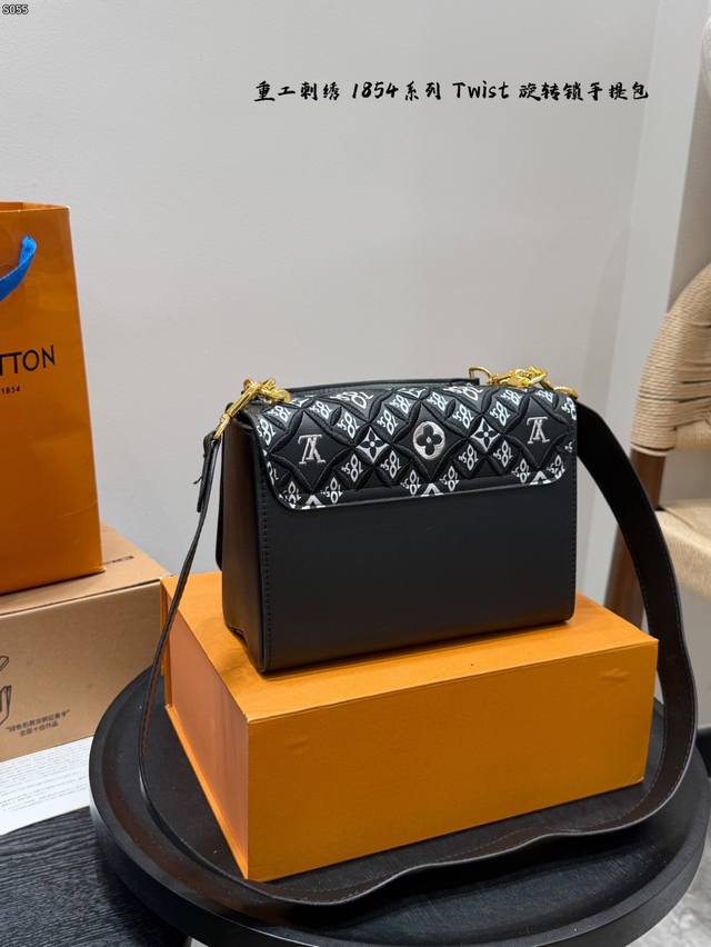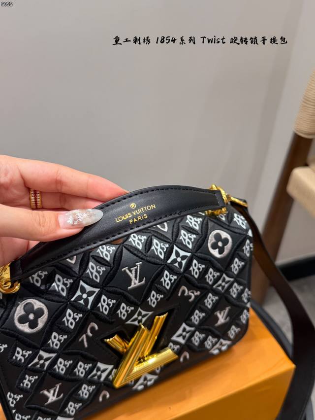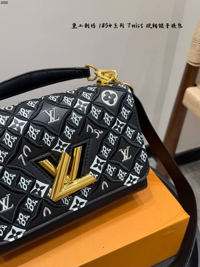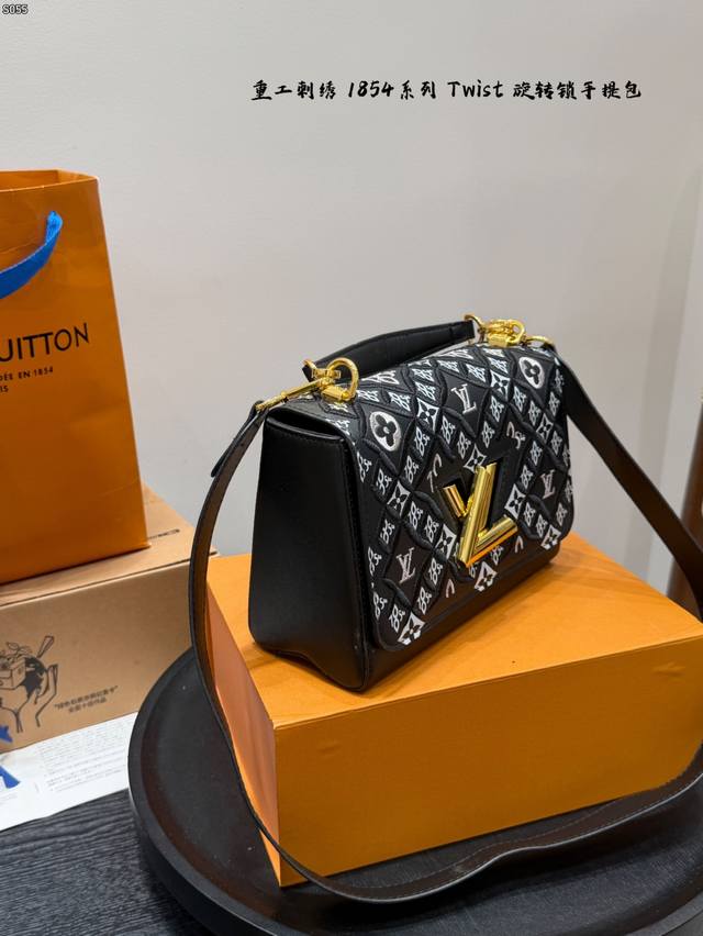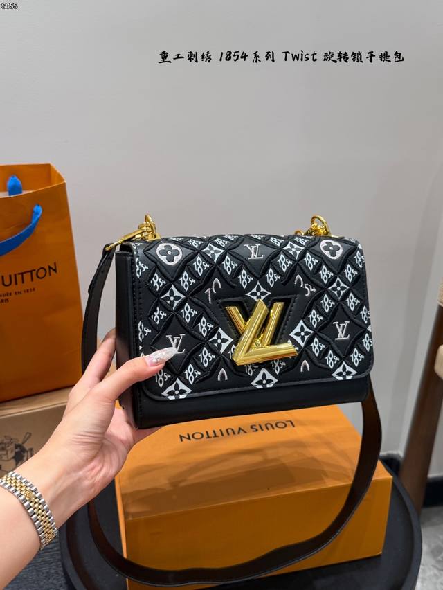 Comes with a folding box. Size 23.16. LV Twist New Heavy Embroidery 185 Series Twist Lock Closure Handbag/Crossbody Bag. The color is very fresh in person. The woven metal links add a touch of sophistication, and the unique curved base increases the bag's capacity.