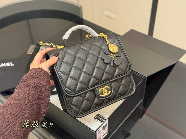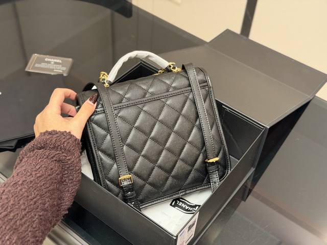 Comes with a folding box. The Chanel 25B four-leaf clover backpack is so charming in the sunlight! Featuring the classic Chanel four-leaf clover, gold coin, double C quilting, and black and gold color scheme, this backpack maintains its high popularity. It also has a very good capacity. Dimensions: 22.20cm.