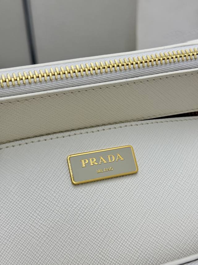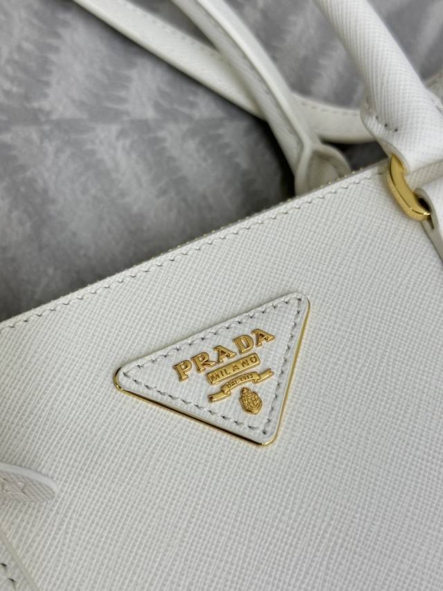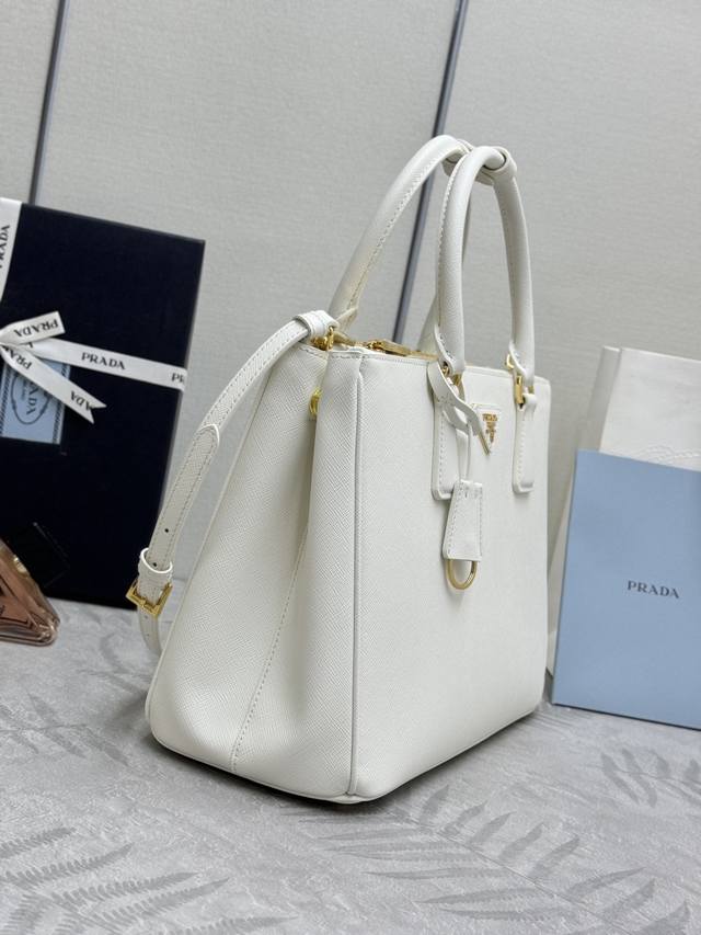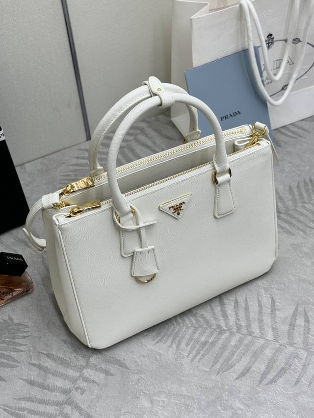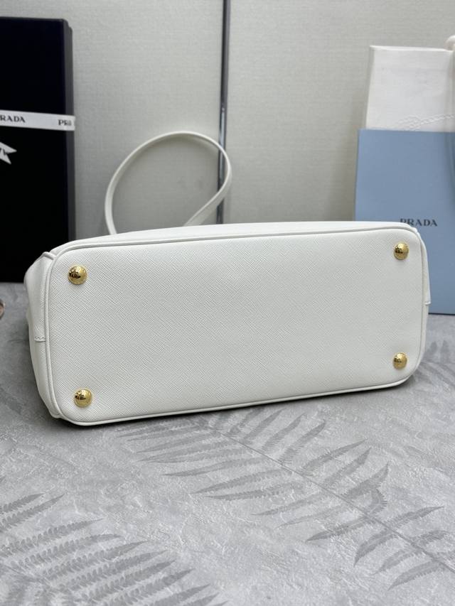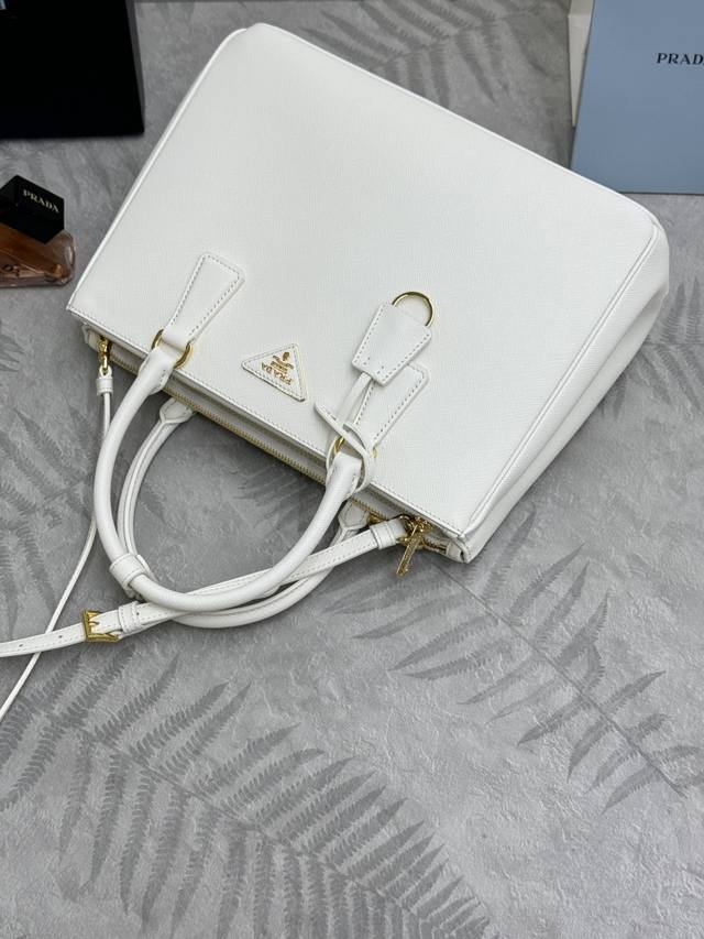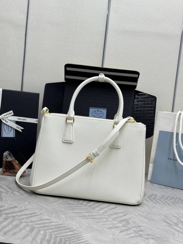 Comes with authentic boutique packaging, exclusively customized, large classic best-selling Saffiano leather bag, top quality leather double handles, detachable and adjustable leather shoulder strap, gold-plated hardware, triangular leather with metal engraved logo, side snap closure, two zippered exterior pockets, three interior pockets including one zippered pocket, Prad logo lining. Model: 1Ba274, Dimensions: 32