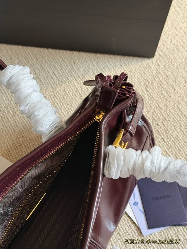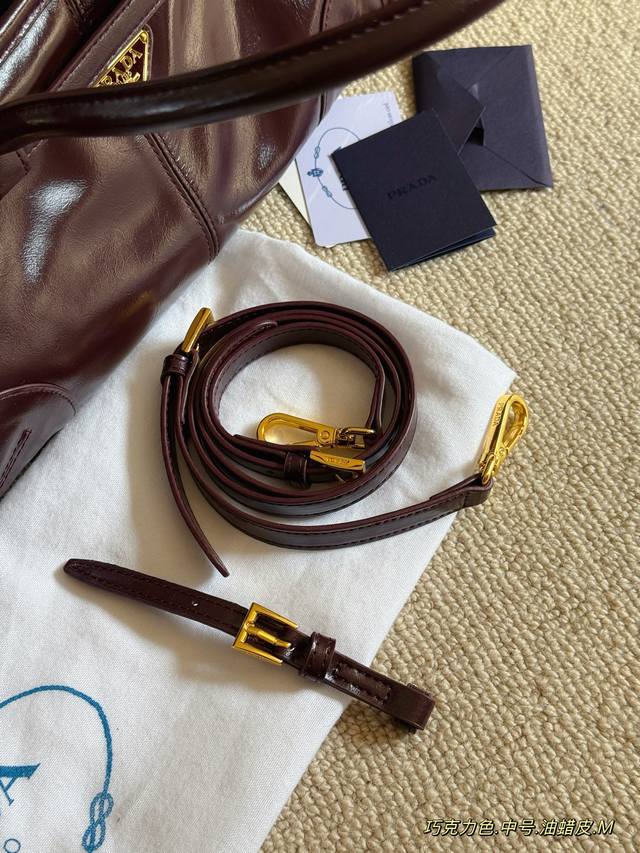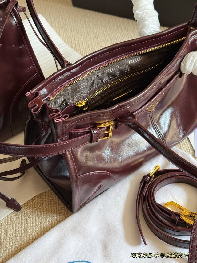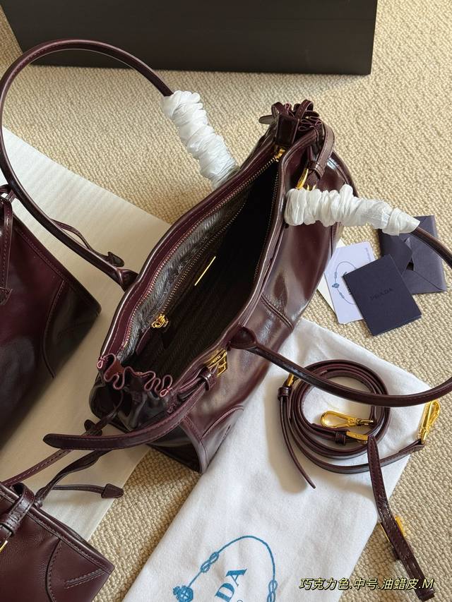 Comes with box. Size: 24*13cm (Small), 32*15cm (Medium), 38*24cm (Large). Prada Bonnie Soft Handbag~ Exquisite waxed leather! The leather and color are absolutely stunning! I love it! Available in tote and underarm styles to meet various needs! Made with the latest Soft Lux ultralight waxed leather for a high-gloss finish. Includes a long shoulder strap!