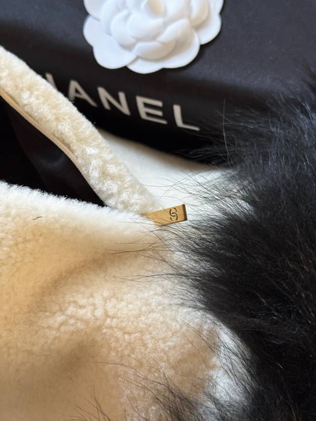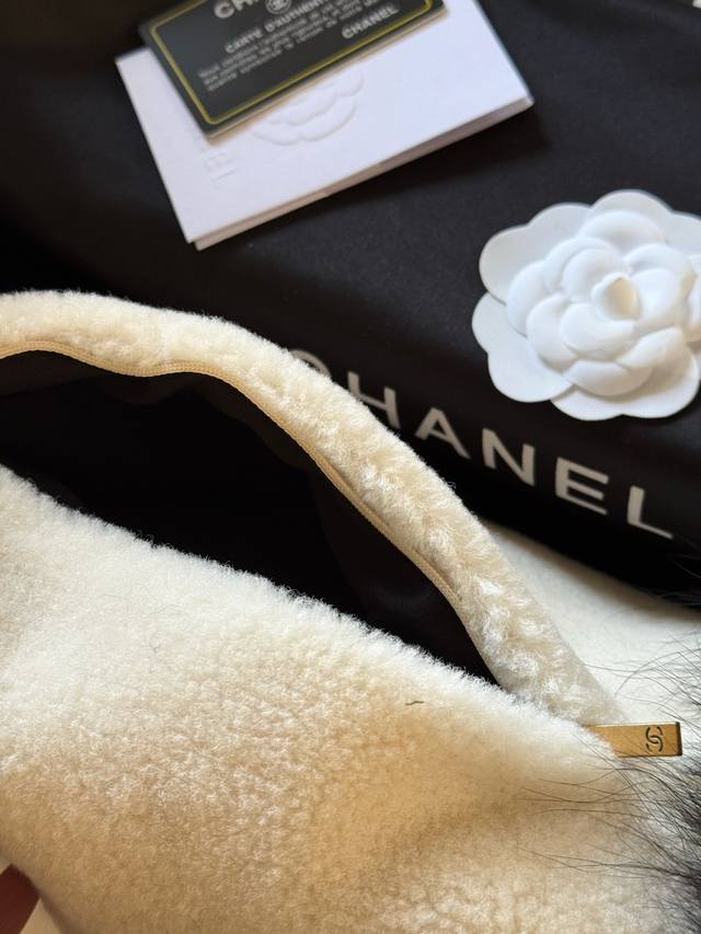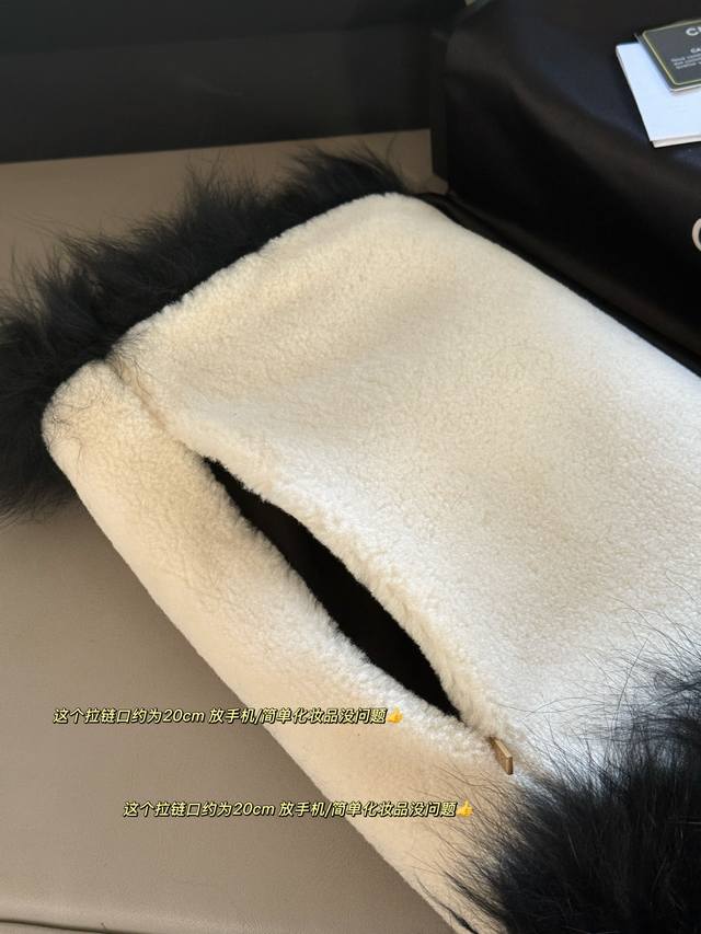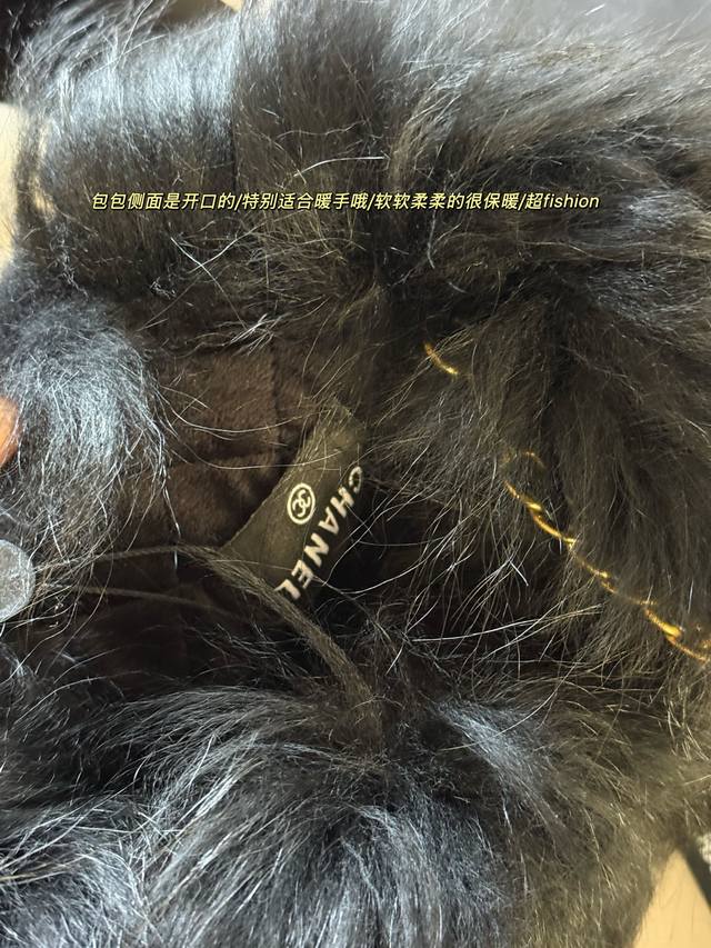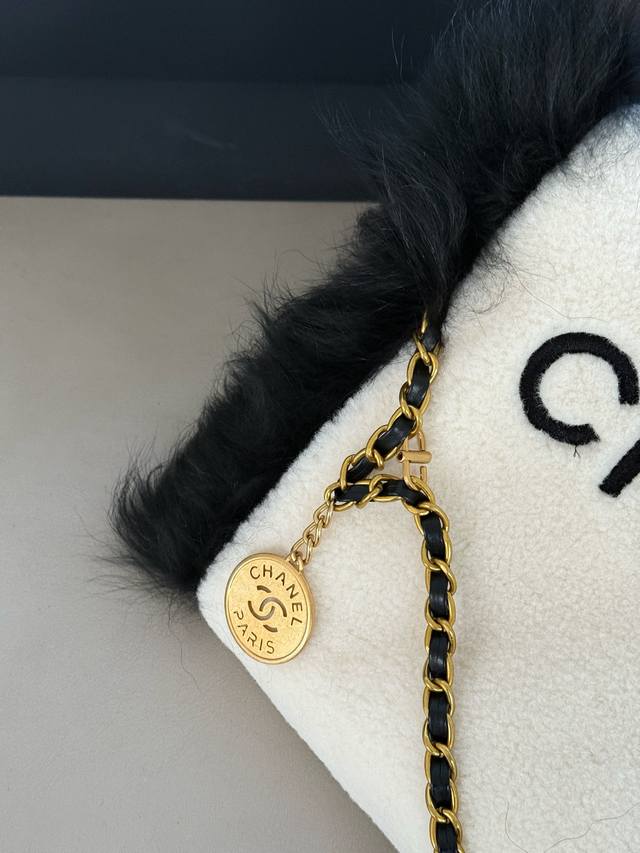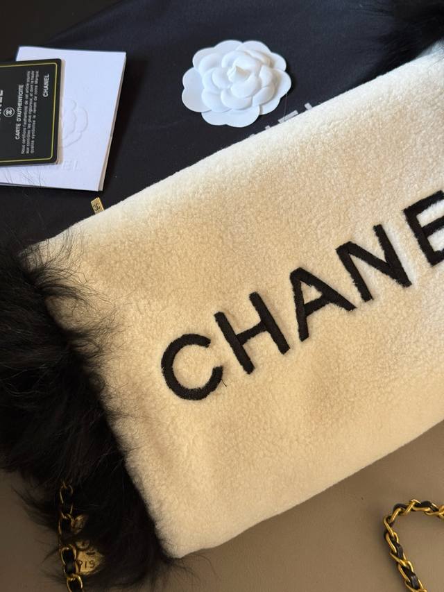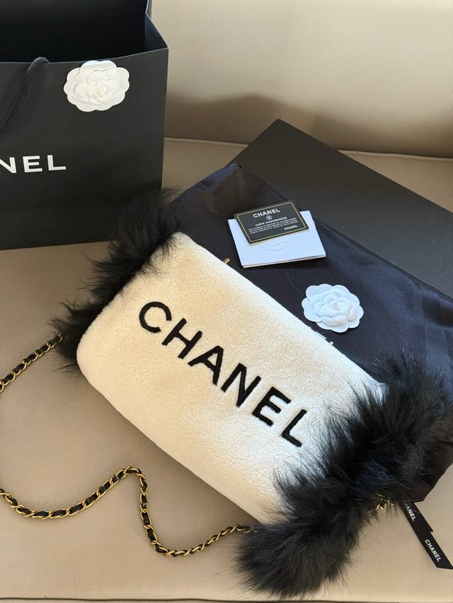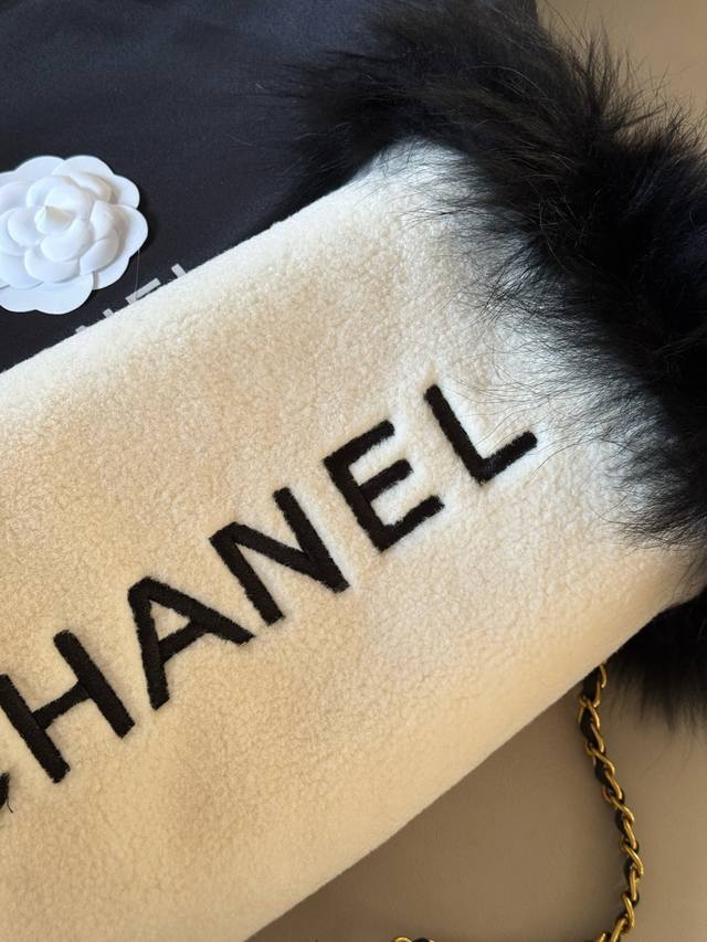 Comes with box. Size: 32*25cm. A premium Chanel black and white lettered fur chain bag, perfect for crossbody hand warmers. The fluffy texture adds a touch of sweetness and sophistication to any outfit!