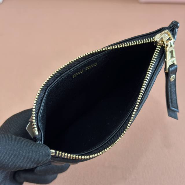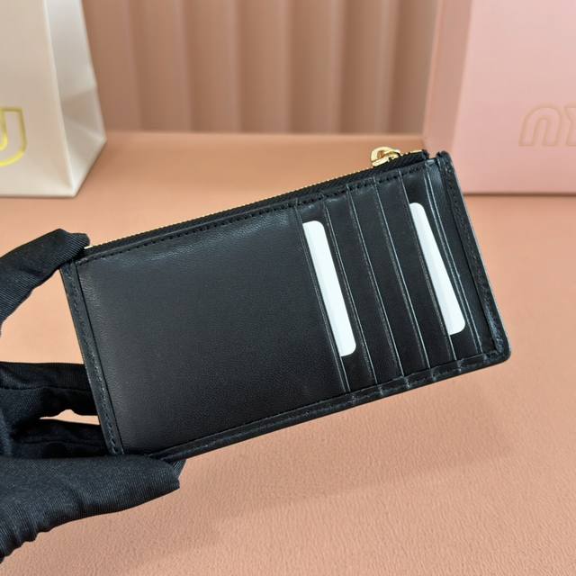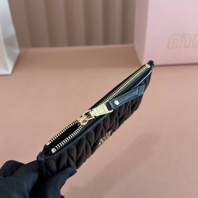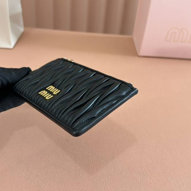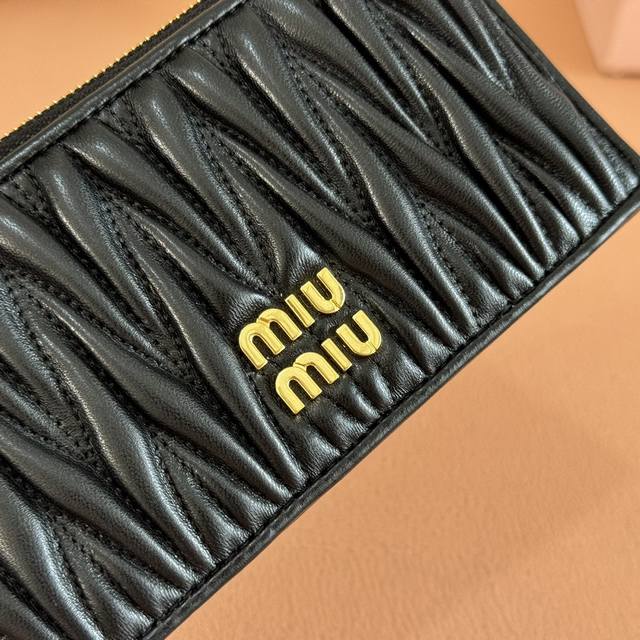 Comes with full boutique packaging. Mmpocket Wallet latest version card holder, model: 5Mb006g top-grade imported lambskin leather with Matelasse pattern, zip closure, Miu logo embossed inside, six card slots on the back, dimensions: 8X15. (
