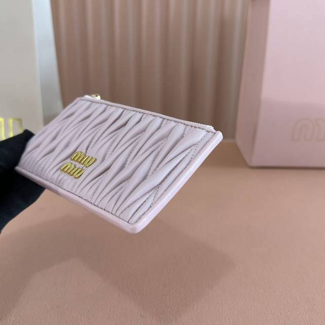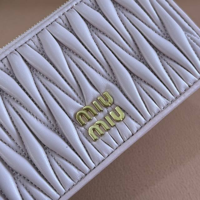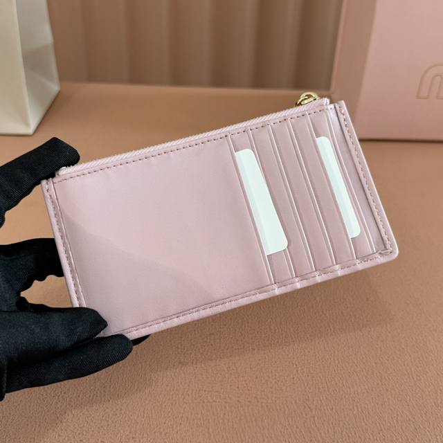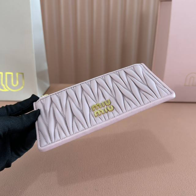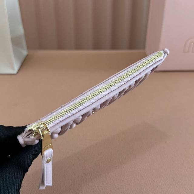 Comes with full boutique packaging. Mmpocket Wallet, latest version, model: 5Mb006, light pink top-grade imported lambskin leather with Matelasse pattern, zip closure, Miu logo embossed inside, six card slots on the back, dimensions: 8X15. (