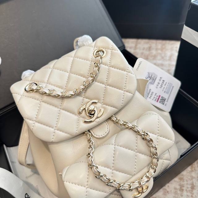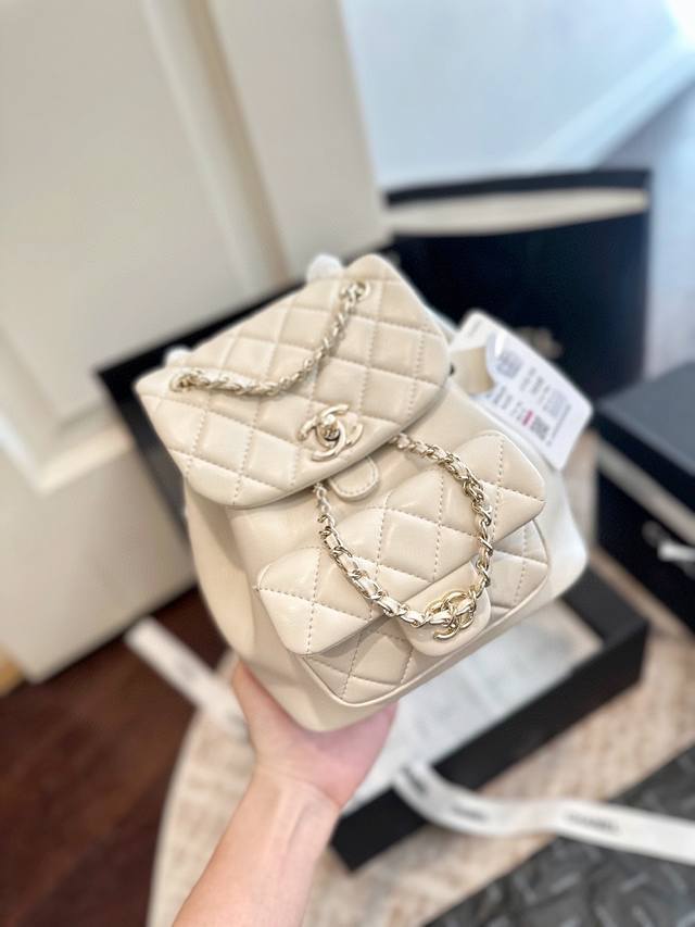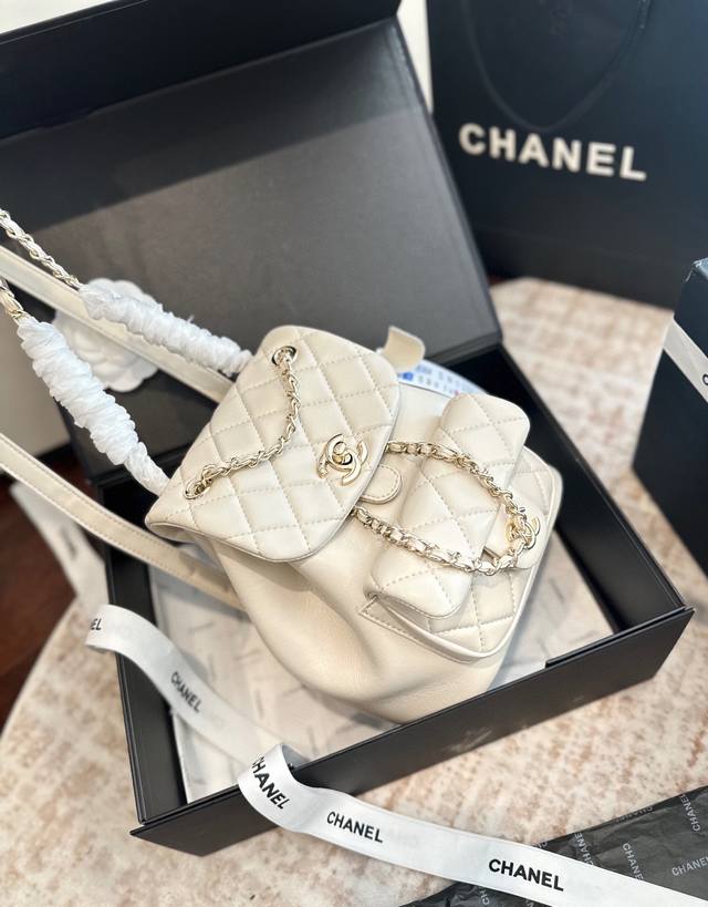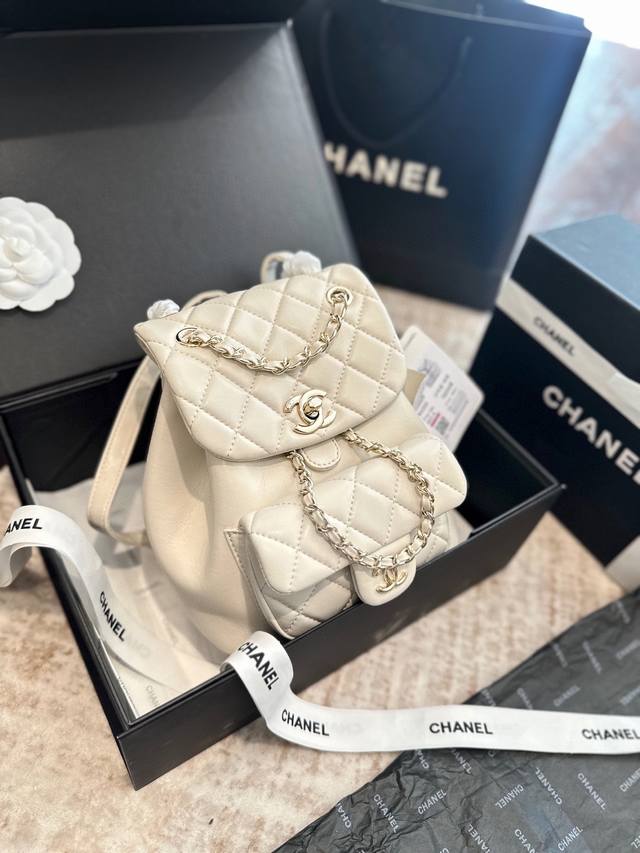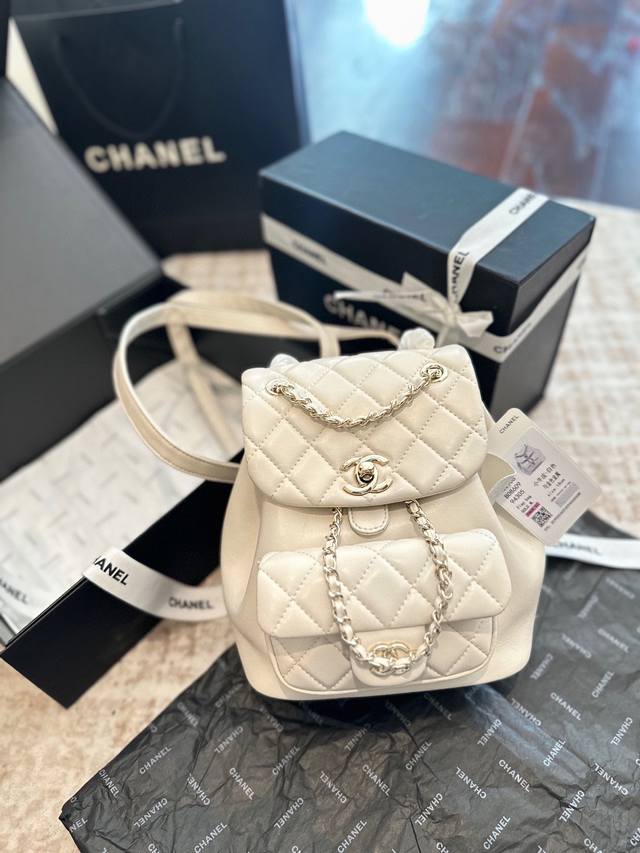 Cowhide leather Chanel 25P Duma backpack in folding gift box packaging. Features pocket design and two Chanel double C logos, giving the bag a structured and stylish look. Sizes 22-26.