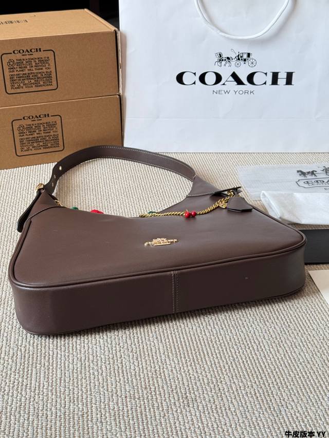 Cowhide Version Coach Ella Shoulder Bag. This Coach Ella shoulder bag is made of soft cowhide, offering a delicate texture and durability. The hobo style features a metal chain and cherry charm, giving it a retro yet fashionable look. The adjustable shoulder strap allows for underarm or crossbody wear. With a moderate capacity, it's practical for both commuting and everyday use! The dark brown color is incredibly versatile; pair it with a leather jacket or coat in autumn and winter for an effortlessly chic and relaxed look. Size: 35 x 25 cm.
