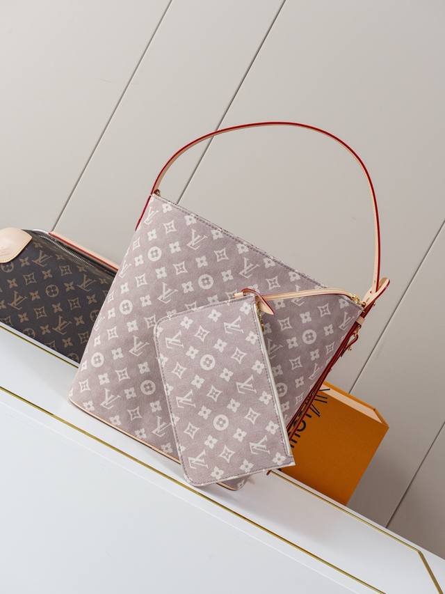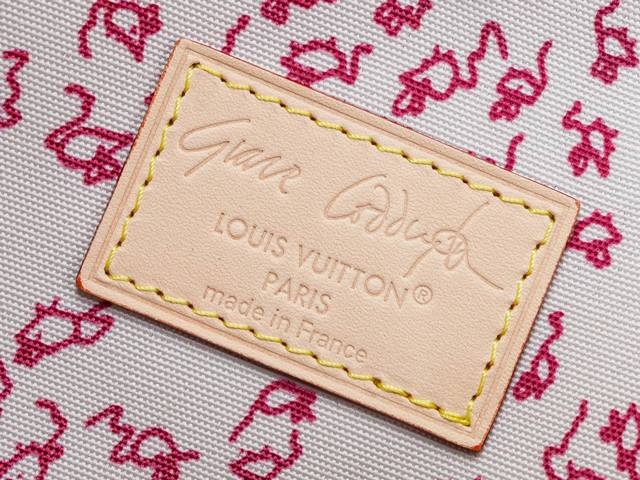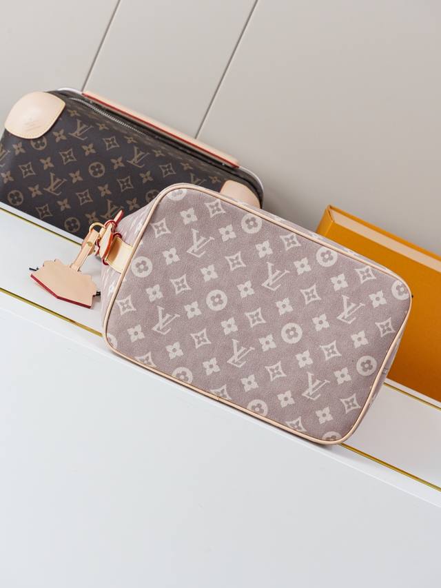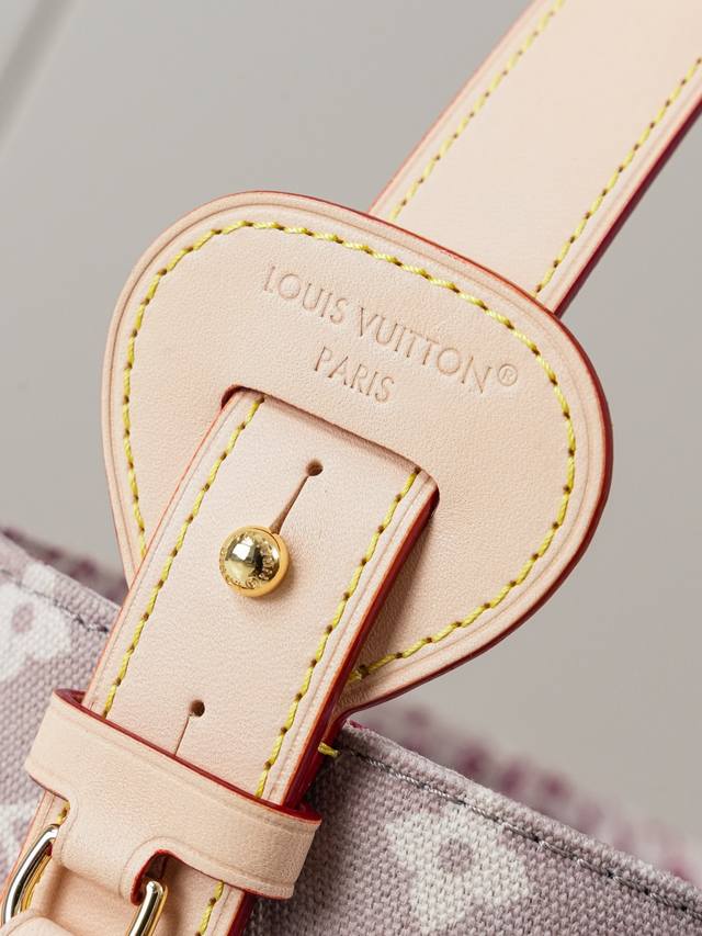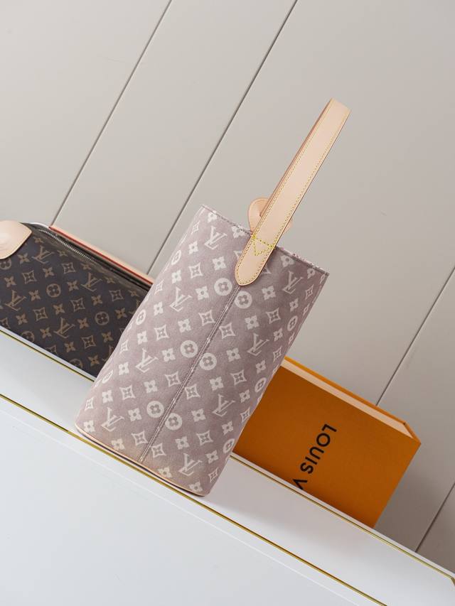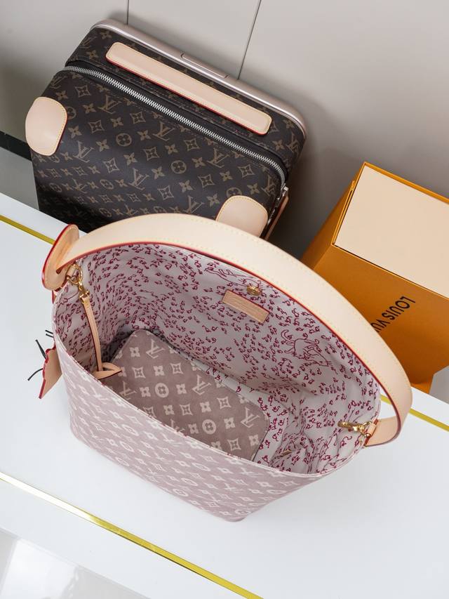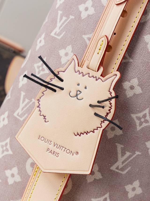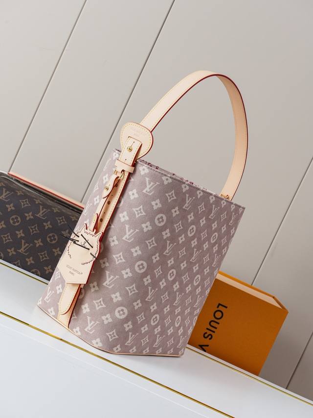 Dynamic 163C01 Chip M25727 White Floral Top-Tier Original Individual Background Real Shot. This All-In Large Handbag is from the LV Travels With series, showcasing the design aesthetics of fashion icon and artist Grace Coddington with the Meowgram pattern. The canvas body is paired with cowhide leather trim and a whimsical cat-shaped key pouch. The bucket shape easily accommodates everyday essentials such as a laptop, while a detachable zippered pocket adds to its functionality. Dimensions: 26 x 31 x 18 cm (Length x Height x Width). Material: Meowgram coated canvas, cowhide leather trim, fabric lining, metal hardware, magnetic and hook closure, detachable zippered interior pocket, detachable cat-shaped key pouch (can hold laptop, smartphone, earphones, Zippy wallet, and keys). Shoulder strap: Non-detachable, adjustable. Strap half-length: 21.0 cm. Strap half-length adjustable to: 34.0 cm. Handle: Single handle.