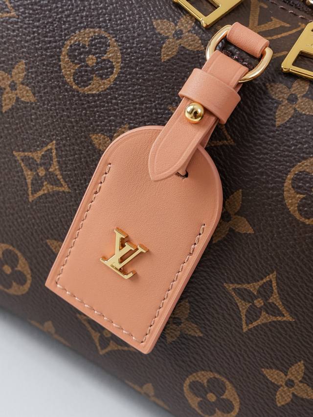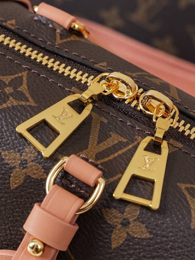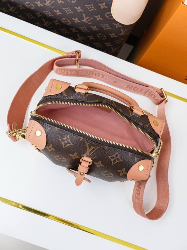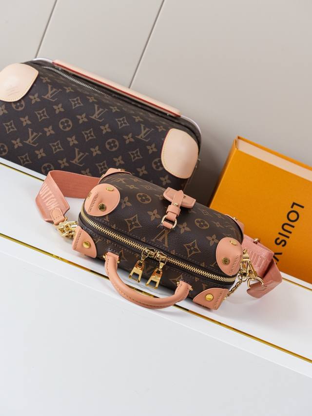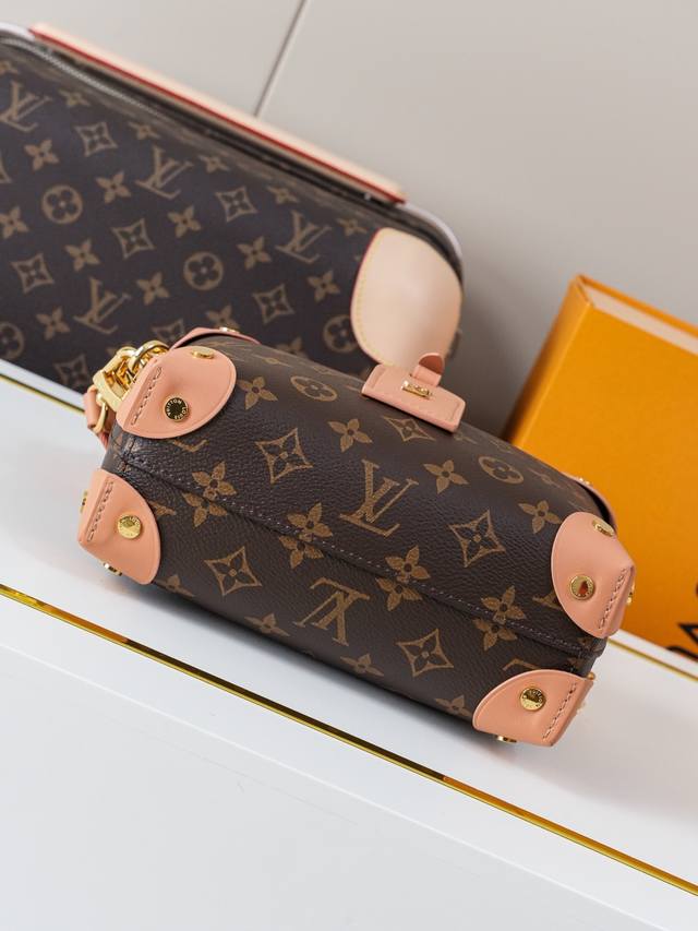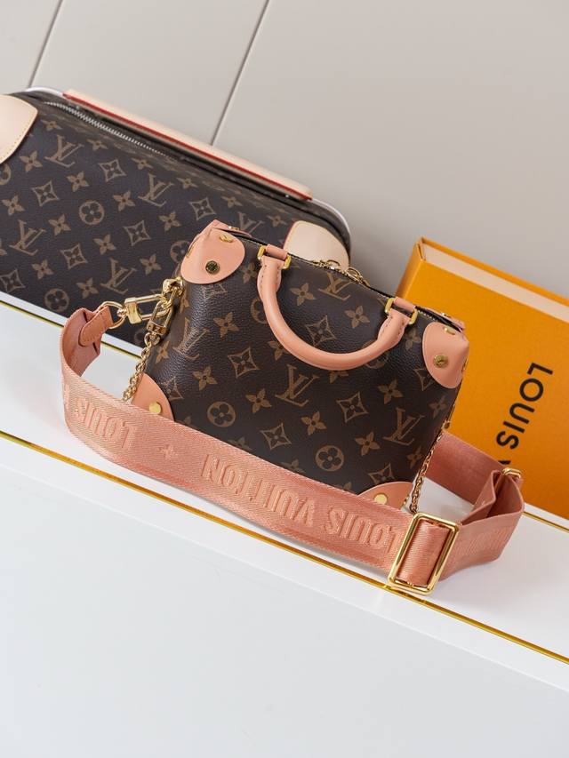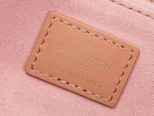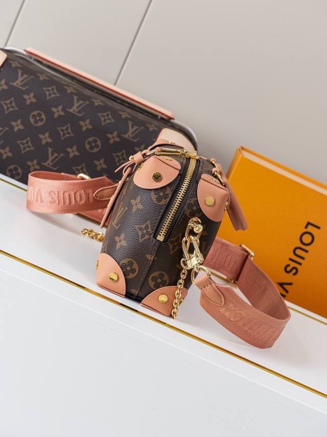 Dynamic 163C01 Chip M45531 Monogram Pink Top-Tier Original Individual Background Real Shot. This Petite Malle Souple handbag is crafted from Monogram canvas, incorporating studded leather corners and a leather nameplate, subtly narrating Louis Vuitton's trunk-making heritage. It features a nautical-style chain, Louis Vuitton Malletier embroidery, and a detachable wide shoulder strap. Monogram coated canvas