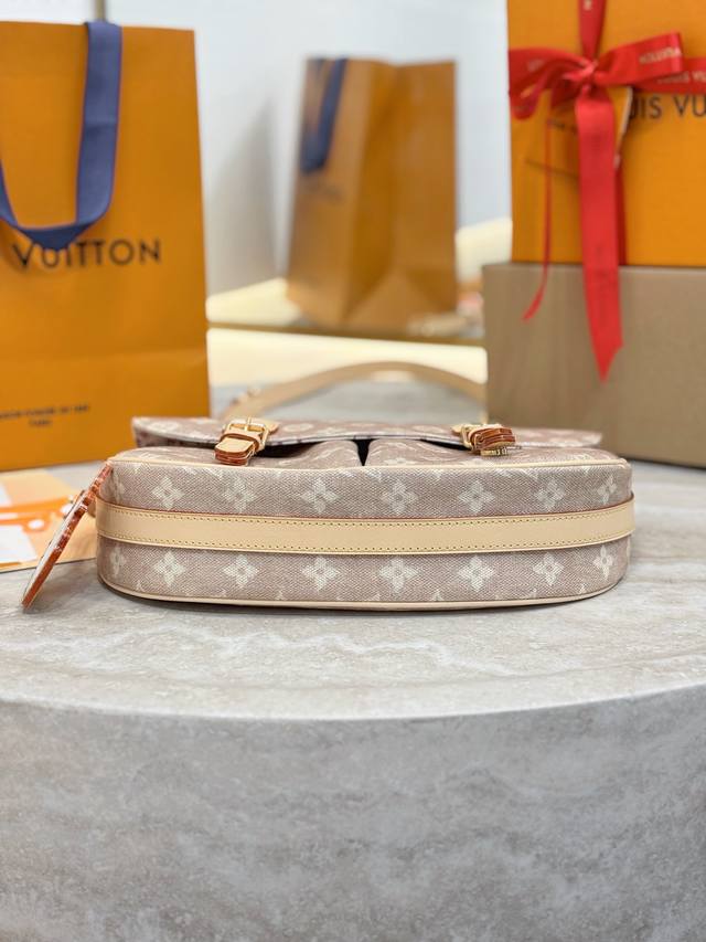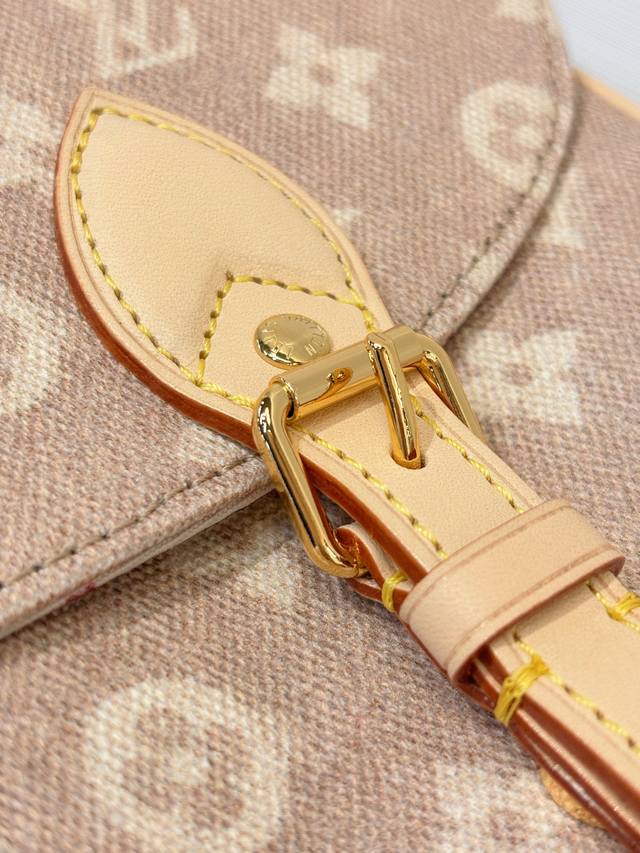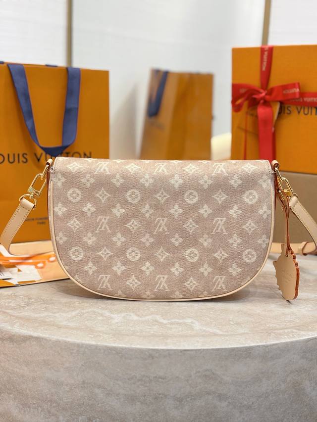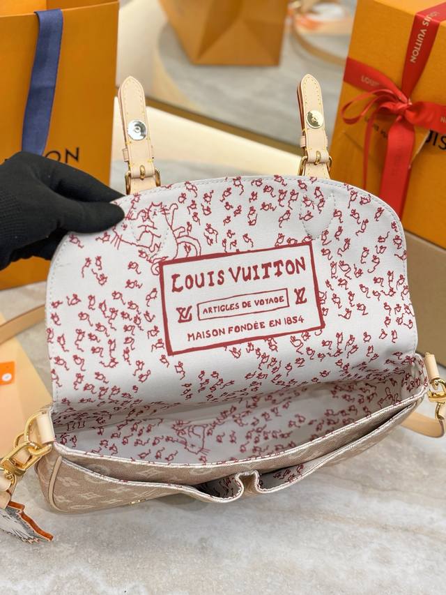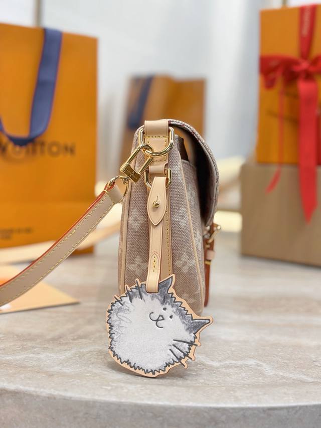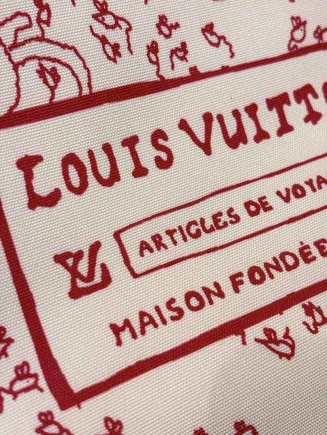 M15134) The Escape handbag makes a striking appearance in the Travels With Grace Coddington collection, featuring a canvas body adorned with a playful Meowgram pattern and leather trim in the shape of a cat, hand-painted by Coddington himself. Its versatile design offers multiple carrying options and easily accommodates various everyday essentials. (