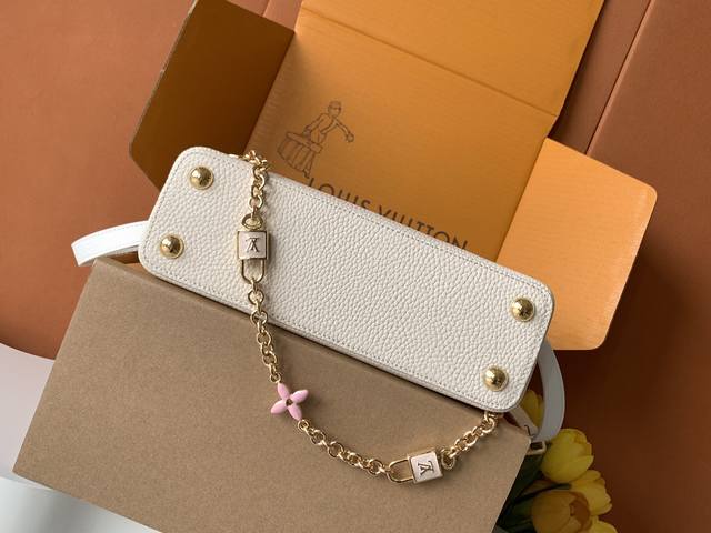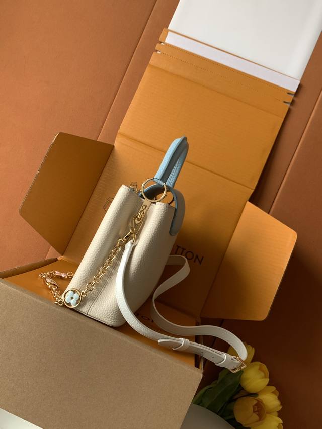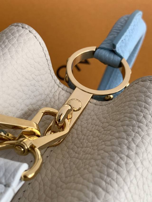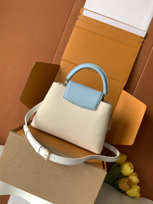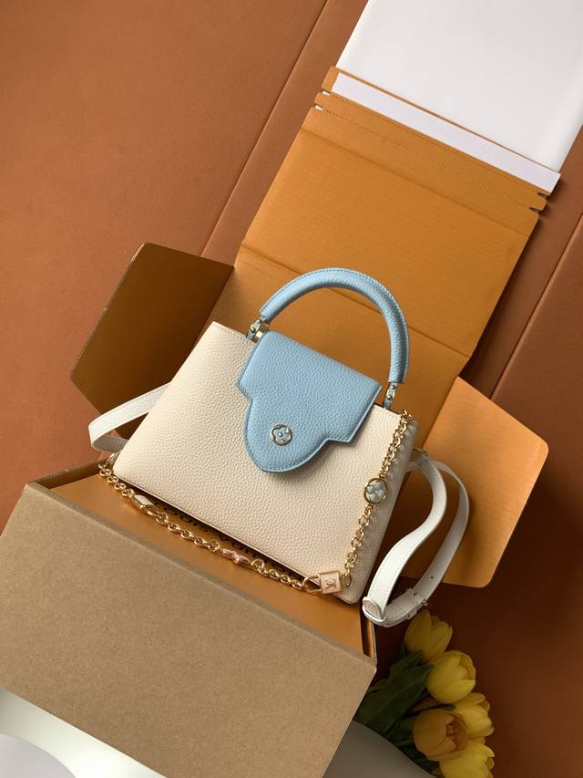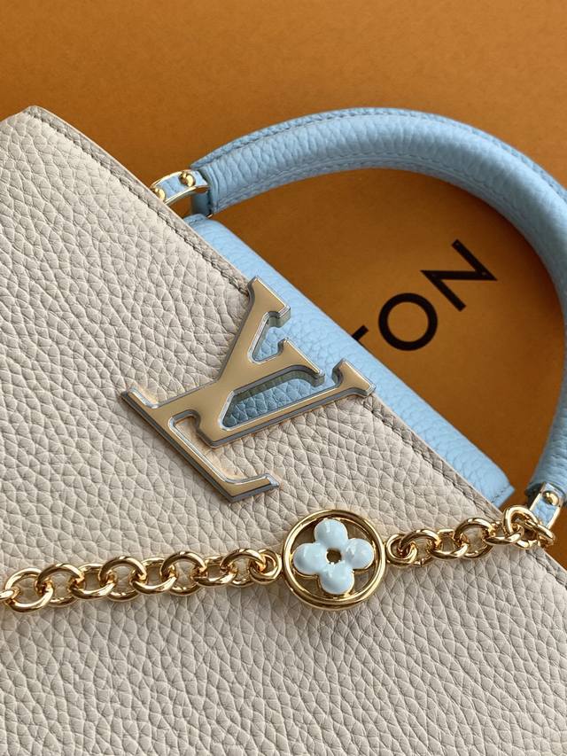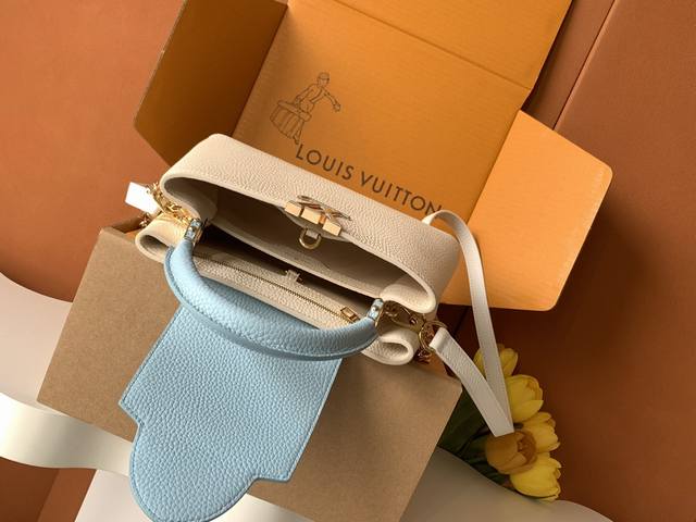 Factory Price P All-steel hardware, imported cowhide, pure handmade custom M23954 Pearl white with blue and gold 163C chip version. The leather is Italian A-grade leather, emphasizing quality. All-steel hardware, imported fabric, genuine leather inside and out, handmade, edge painted, A-grade product, picture matches the product, comes with full packaging. Size: 27X17.5X9Cm