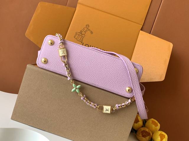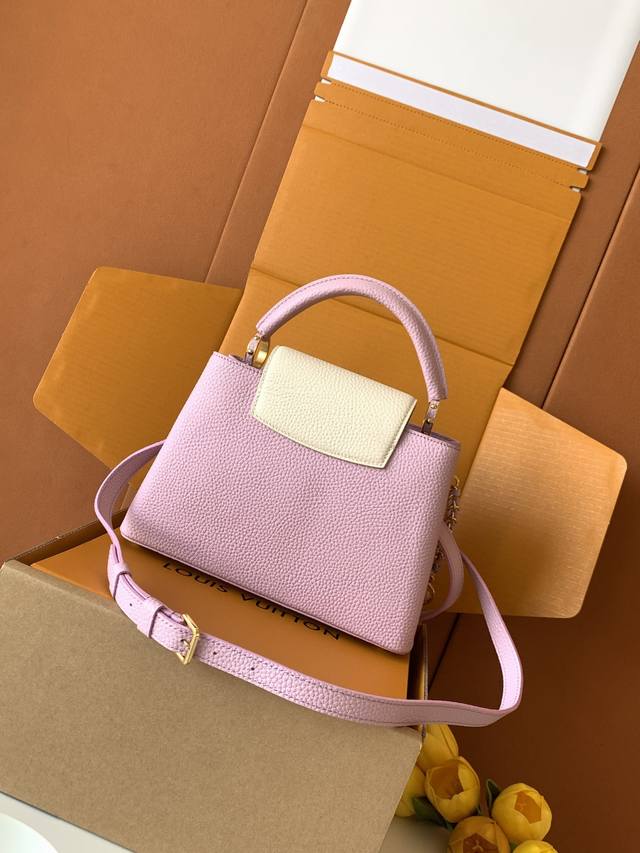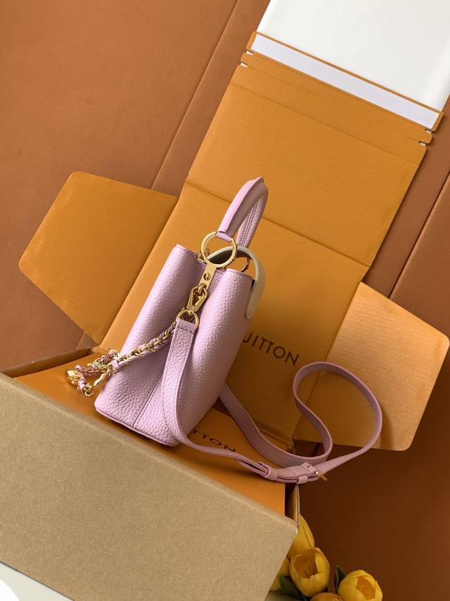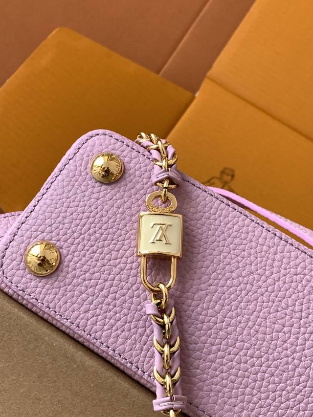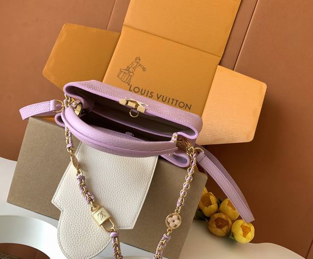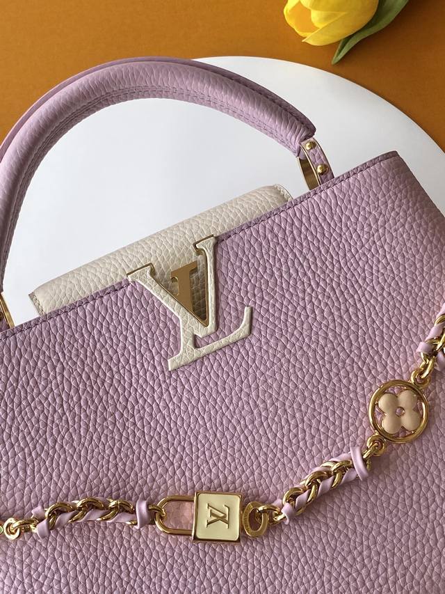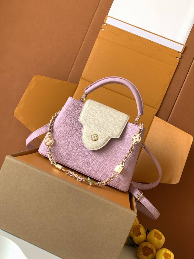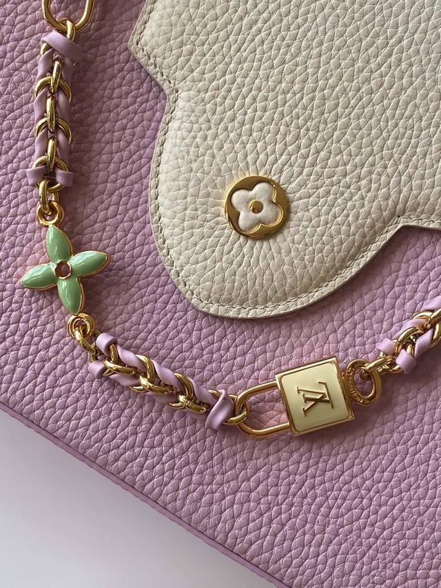 This Capucines mini handbag is crafted from Taurillon leather, featuring an enamel Monogram floral cluster and dazzling chain links. Each flower is hand-polished and enamelized, showcasing the brand's exquisite craftsmanship. Dimensions: 27 x 18 x 9 cm