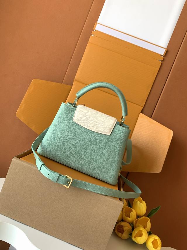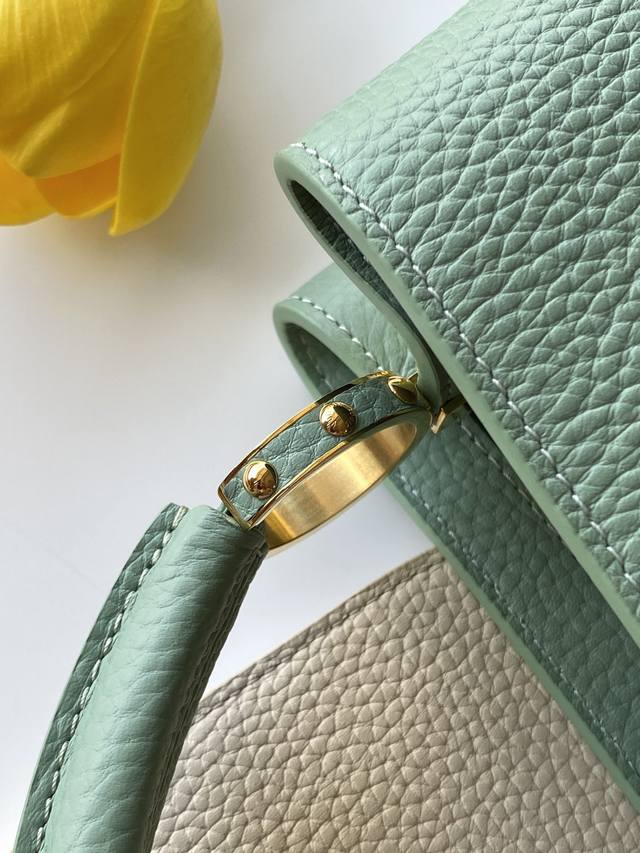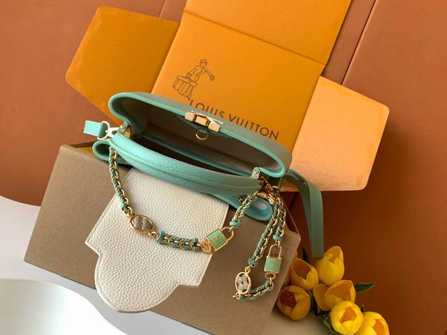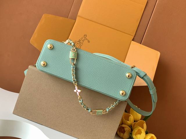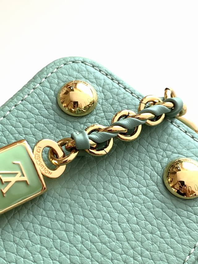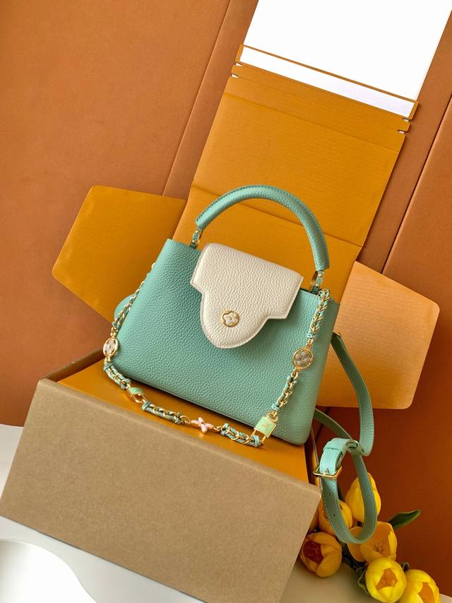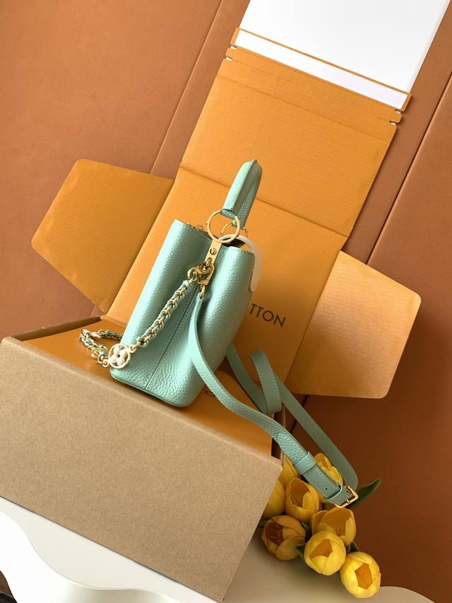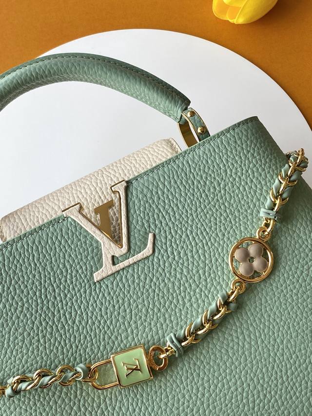 This Capucines mini handbag is crafted from Taurillon leather, featuring an enamel Monogram floral cluster and dazzling chain links. Each flower is hand-polished and enamelized, showcasing the brand's exquisite craftsmanship. Dimensions: 27 x 18 x 9 cm