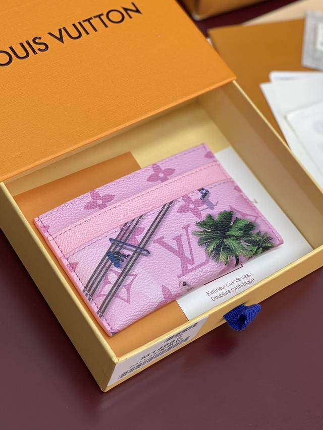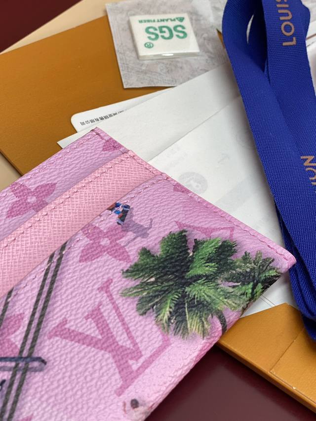Factory Price P M14862 Card Holder! Ski Pink! Double Card Holder. This Double Card Holder is from the Father's Day collection, featuring a Colored Monogram canvas with a miniature sports scene print, and a cowhide leather lining to complete the classic style. Card compartments and a central pocket allow for organized storage. Dimensions: 7 x 1.5 x 11 cm (H x W x Length).
