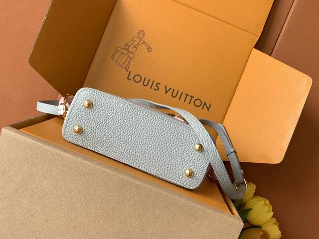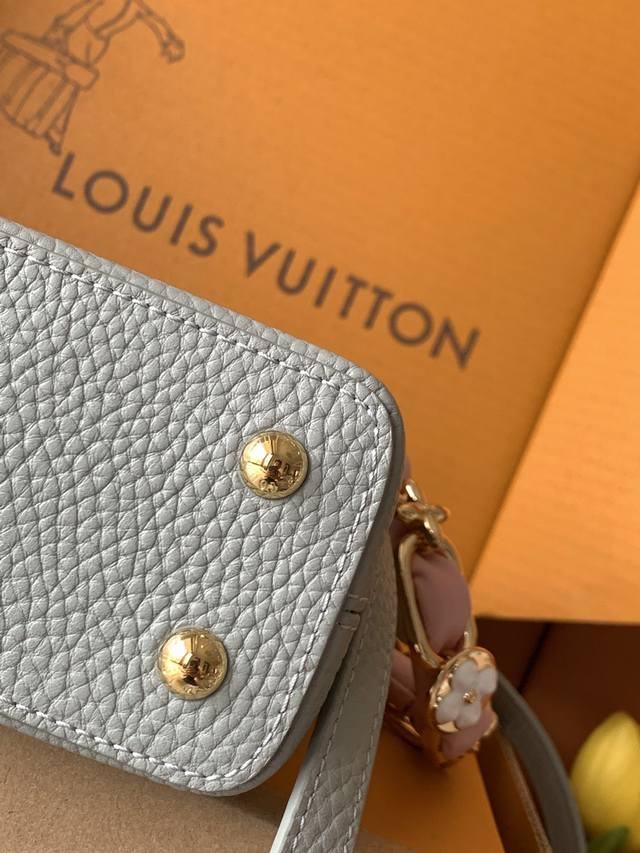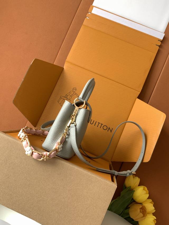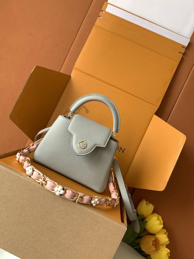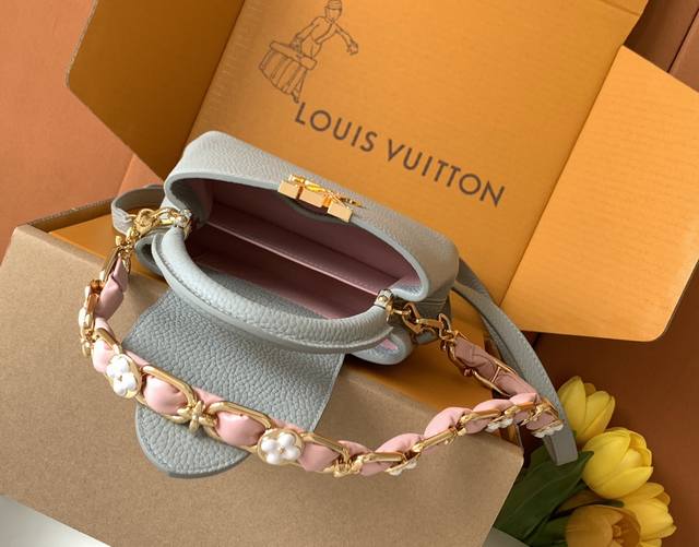 Na Ying Style Capucines Mini Handbag This season's new Capucines handbag exudes femininity. Metal links and soft, elegant cowhide leather are woven into a beautiful chain, adorned with enamel and Monogram Dhlo flowers. The enamel brand logo enhances the jewelry-like texture, making the handbag truly stunning. Dimensions: 21 x 14 x 8 cm