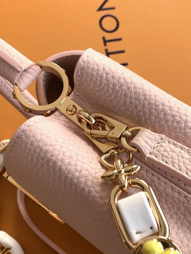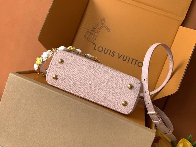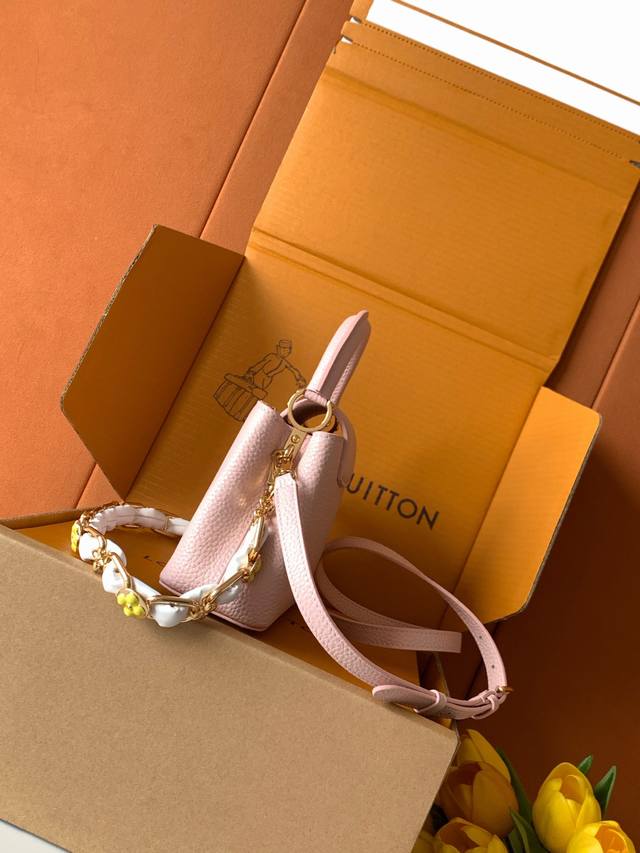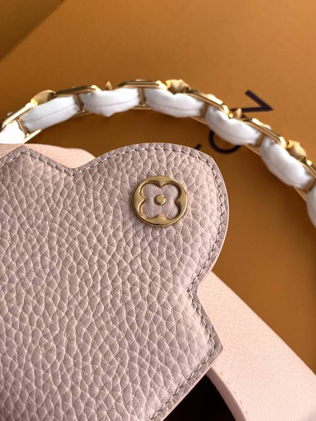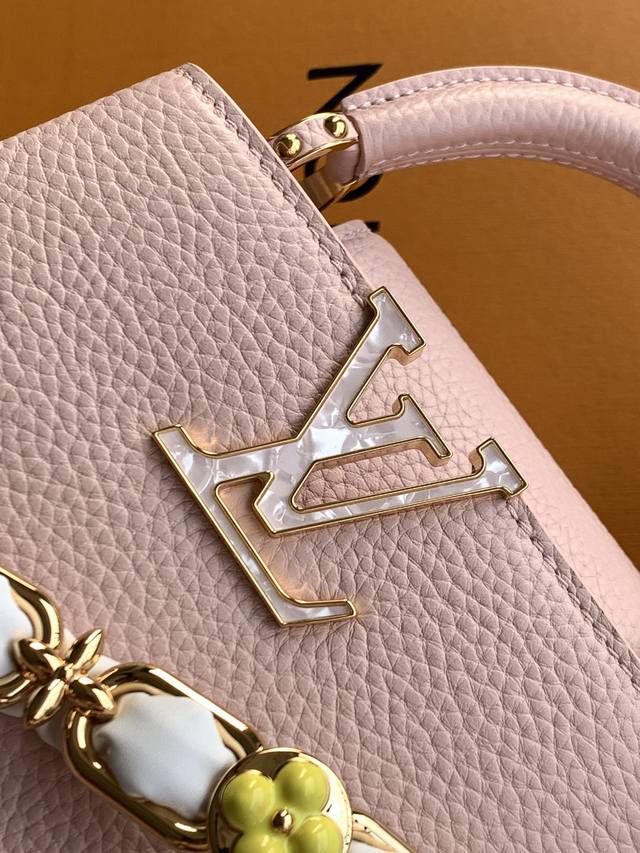 Na Ying Style Capucines Mini Handbag This season's new Capucines handbag exudes femininity. Metal links and soft, elegant cowhide leather are woven into a beautiful chain, adorned with enamel and Monogram Dhlo flowers. The enamel brand logo enhances the jewelry-like texture, making the handbag truly stunning. Dimensions: 21 x 14 x 8 cm