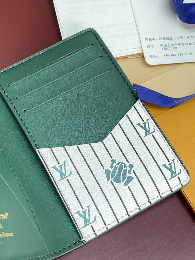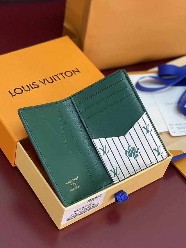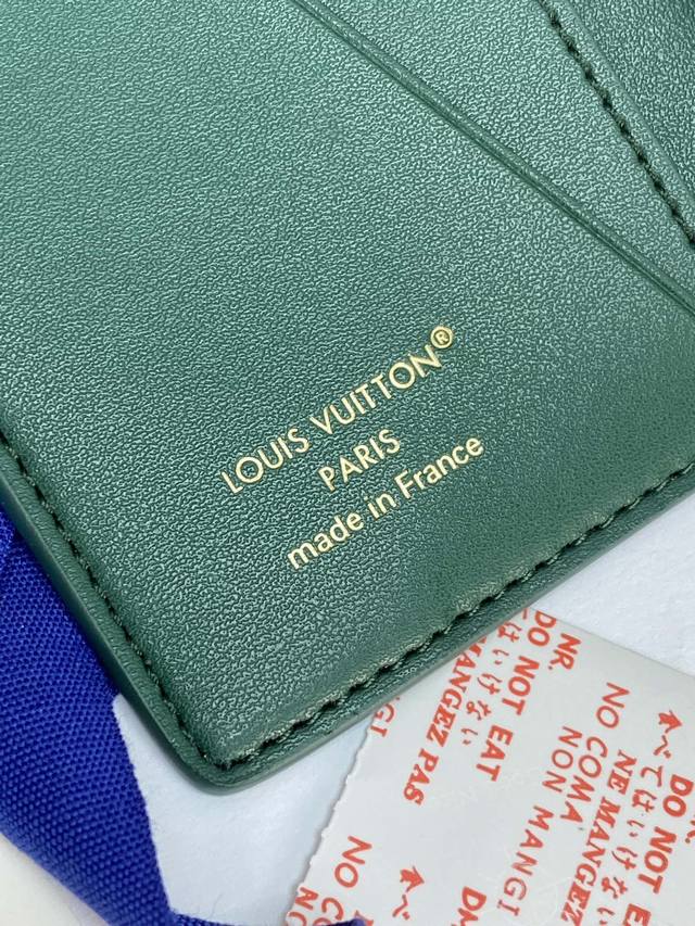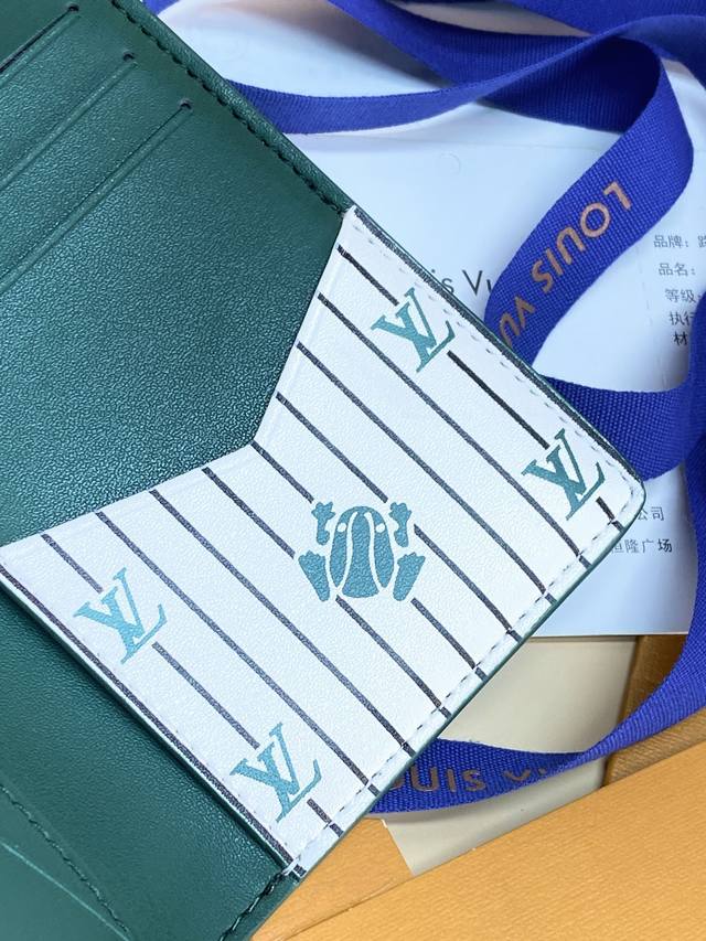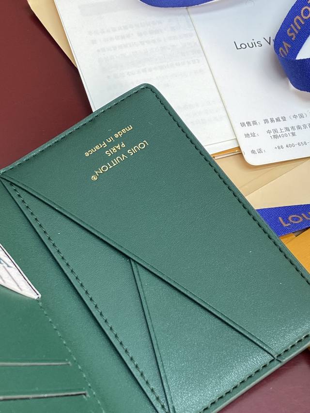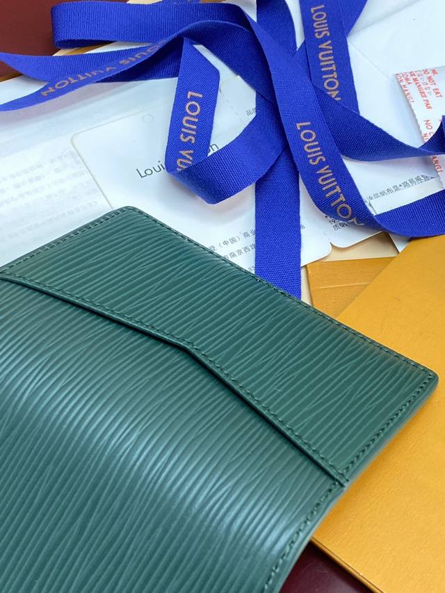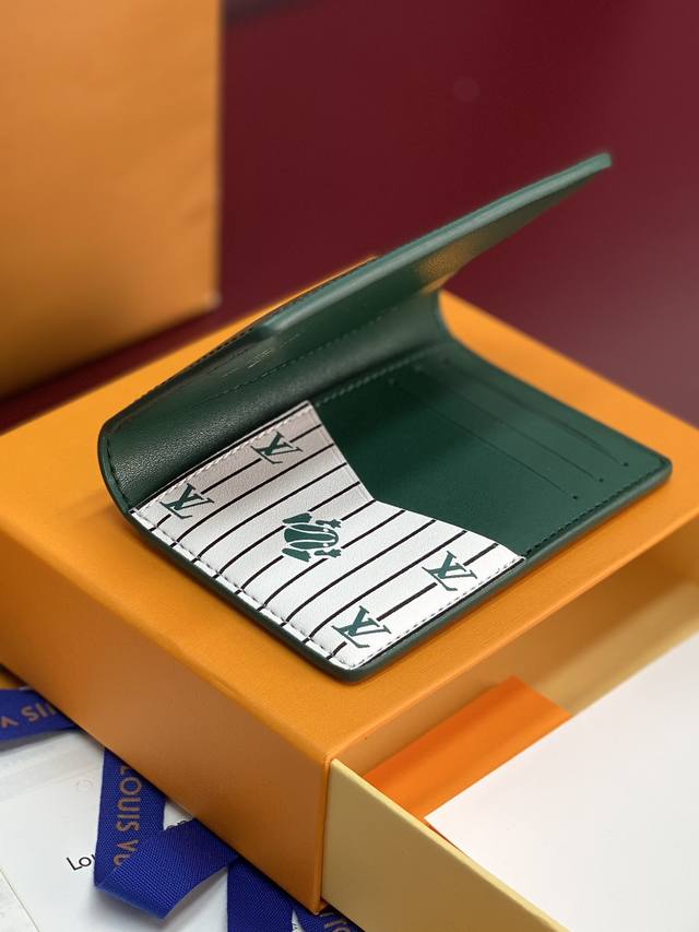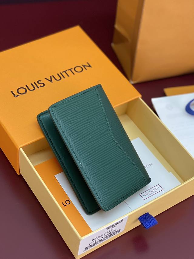 Factory Price P M25797 Green! Pocket Wallet. This pocket wallet is made of grained Epi leather with a bright, vibrant color. Its delicate embossing combines artistic beauty with a durable texture. The front features the lettering "LV" and the interior stripes add rich detail. Internal and external pockets and card slots ensure functionality. Dimensions: 11 x 1 x 8 cm (H x W x Length).