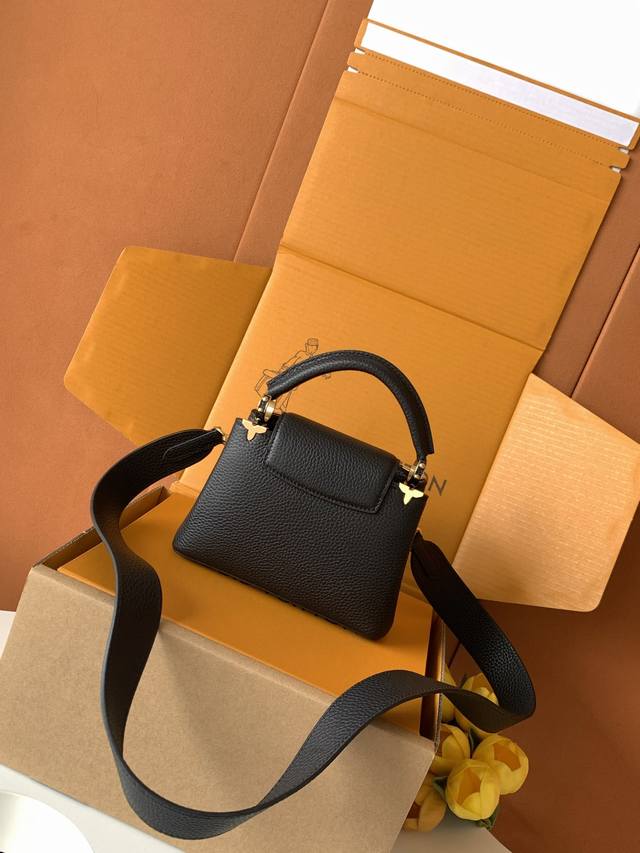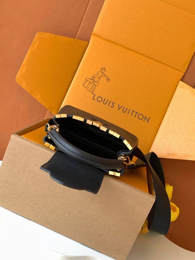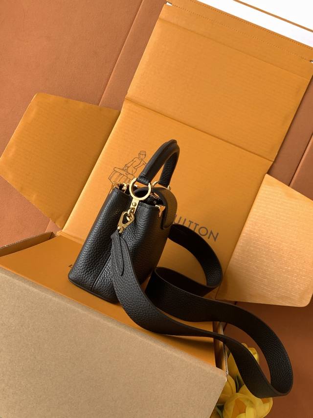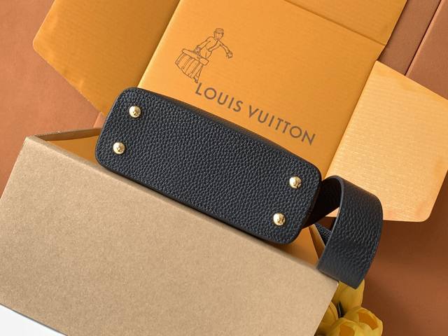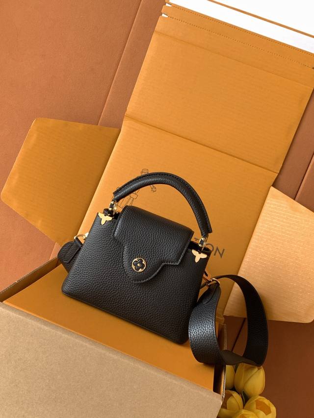 This Capucines mini handbag is made of Taurillon leather and topped with a Monogram floral "crown." The design is hand-stitched onto the leather. Its adorable mini size and delicate decorative floral pattern are charming, while the stylish detachable wide strap and top leather handle offer multiple carrying options.