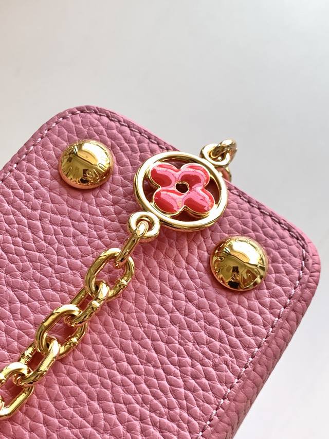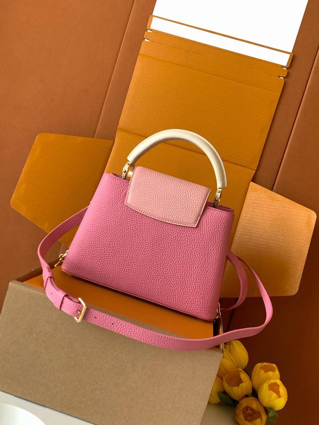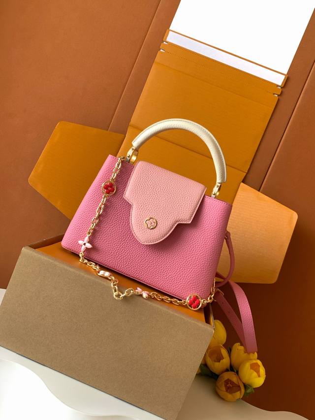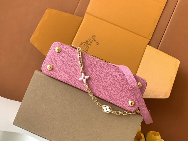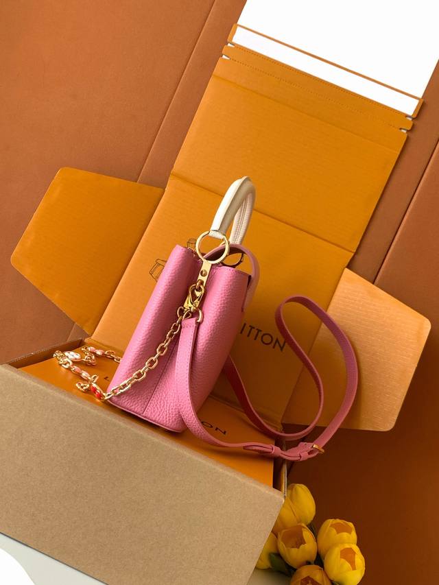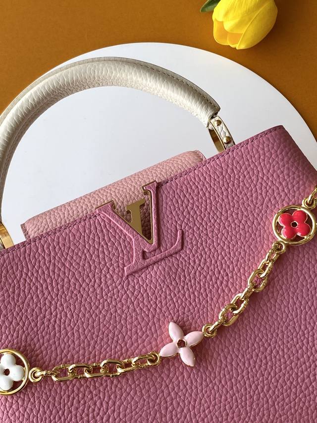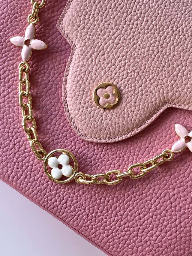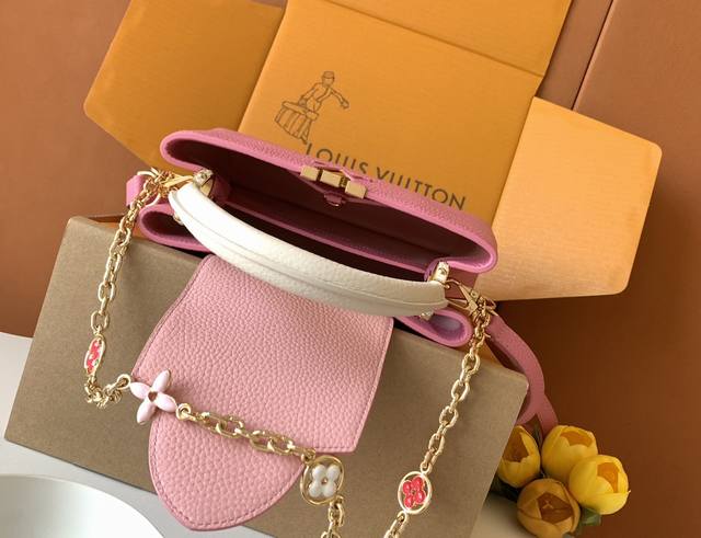 This Capucines BB handbag is crafted from imported Taurillon leather, subtly showcasing variations in shade within the same color, making the classic design even more striking. It features an enamel Monogram floral chain and can be carried by hand, on the elbow, or over the shoulder or crossbody with the shoulder strap.