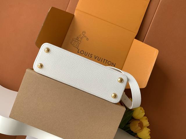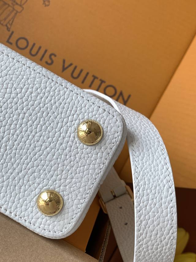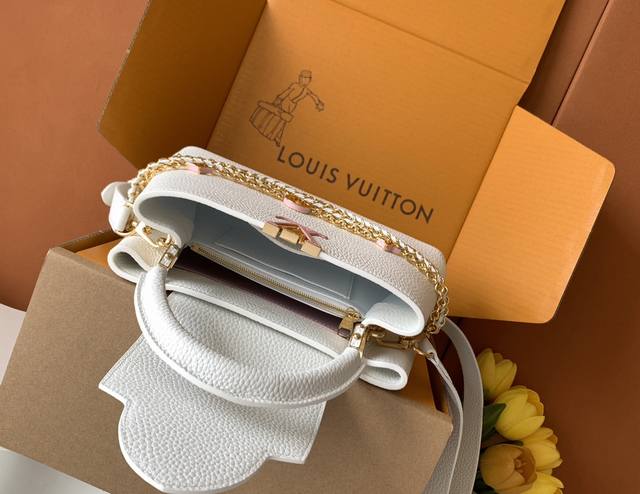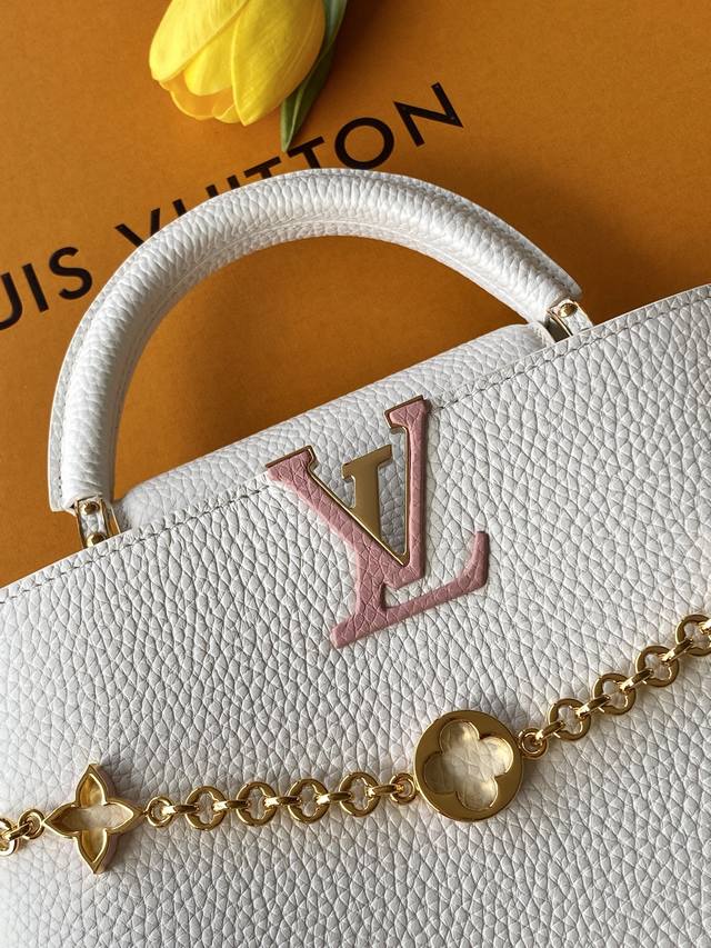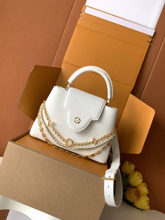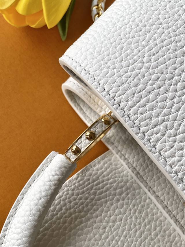 Factory Price P Premium All-Steel M12345 White Gold Imported Cowhide Dynamic Chip This Capucines BB handbag is from the Trilogy series, conveying an elegant style with Taurillon cowhide leather and dazzling metal hardware. A beautiful chain adorned with a mini padlock and enamel Monogram flowers, the flap can be opened externally or internally to reveal multiple pockets, and the sophisticated design allows for various carrying options. Dimensions: 27 x 18 x 9 cm (Length x Height x Width)