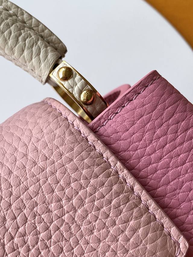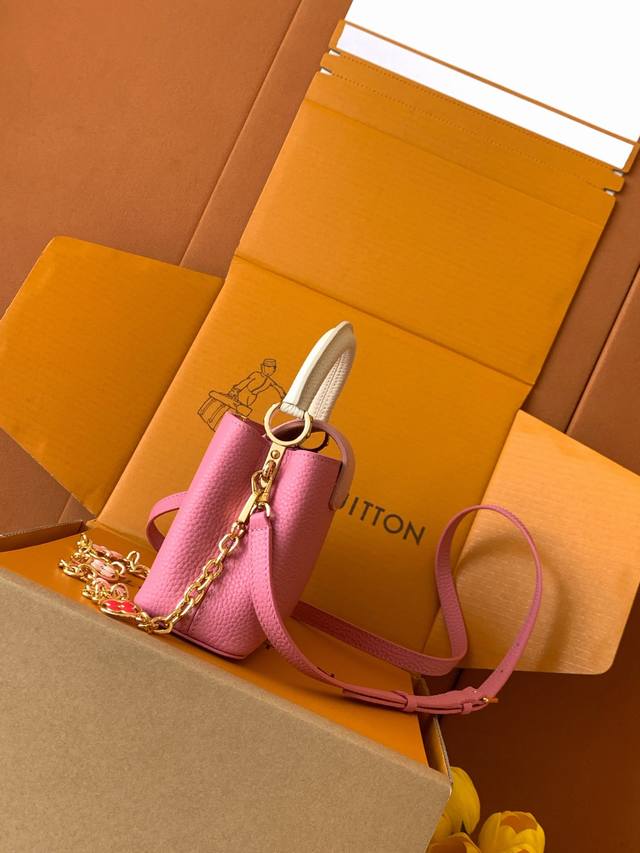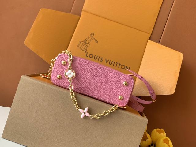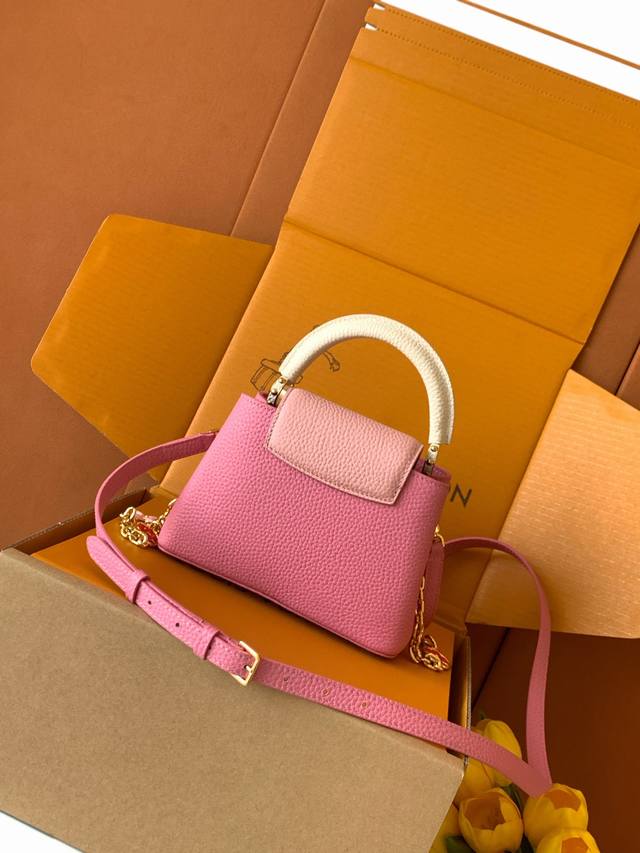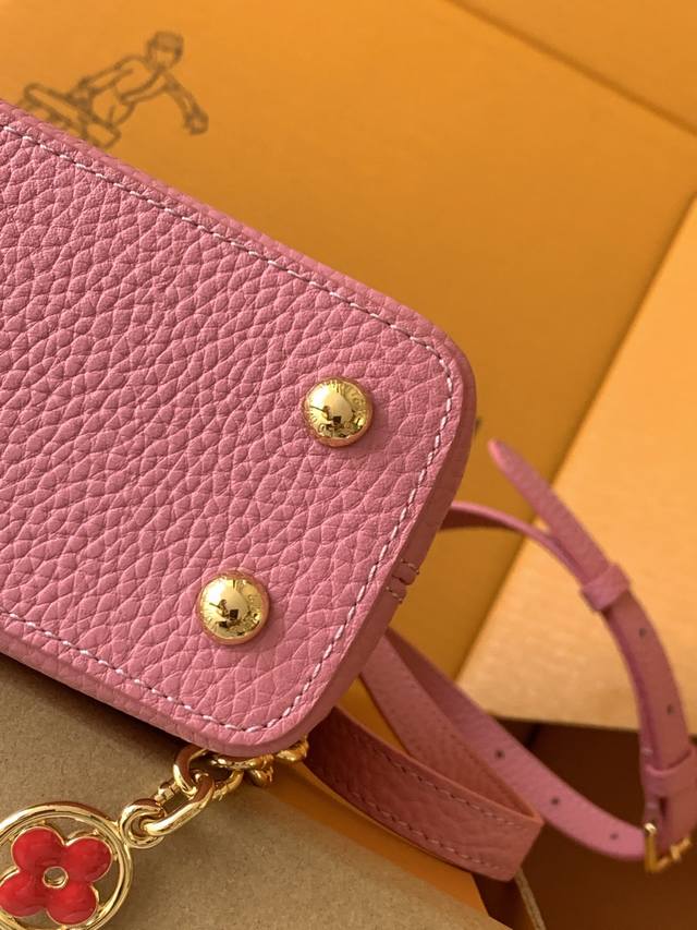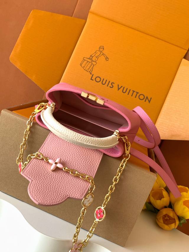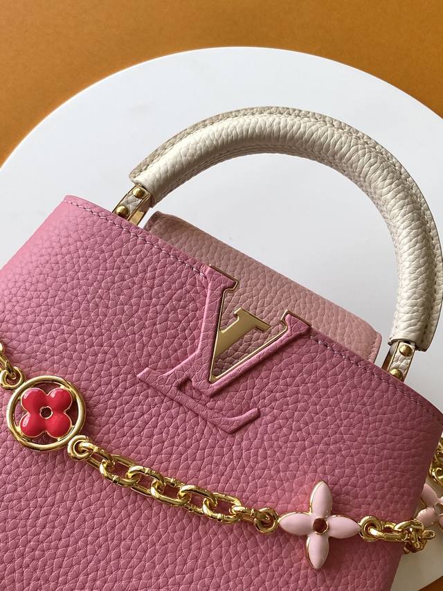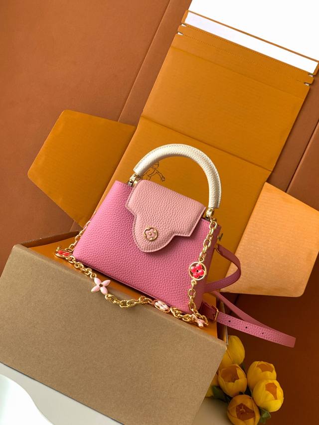 This Capucines mini handbag exudes feminine beauty: the Taurillon imported leather body is paired with a light-colored flap and top handle, and the enamel Monogram floral chain can also be worn over the shoulder. Attach the delicate leather shoulder strap to explore more styling possibilities.