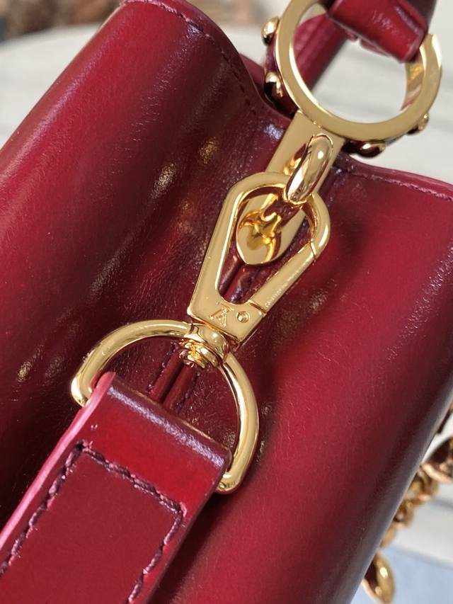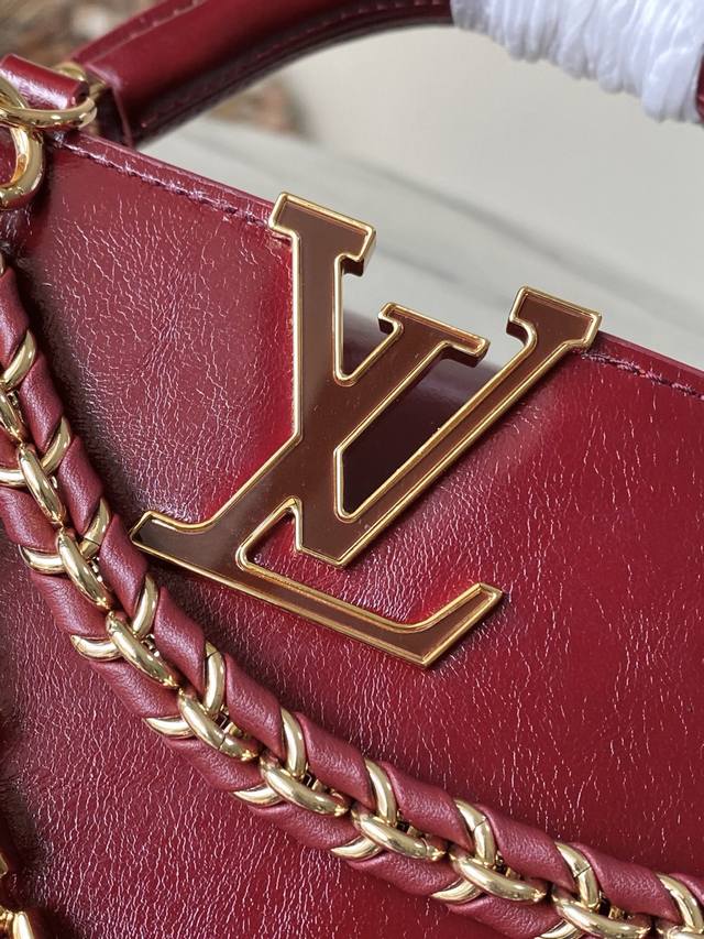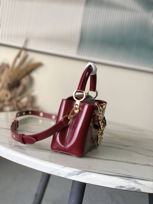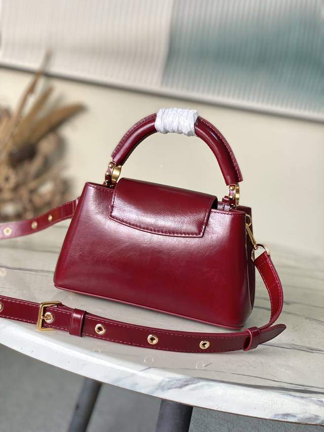 Factory Price P Premium Original Leather M25473 Burgundy Oil-Waxed Leather Mini Capucines East-West Mini Handbag. The leather subtly displays wrinkled texture, subtly conveying the new season's trendy style. Cow leather trim outlines smooth lines. The LV logo and detachable chain shimmer with metallic sheen. The spacious interior meets various storage needs. Multiple carrying options showcase its functional ingenuity. Size: 22 * 12 * 8 cm
