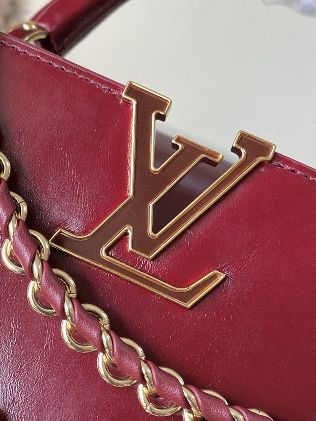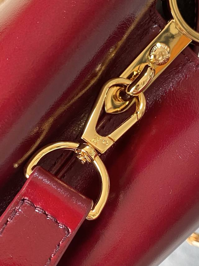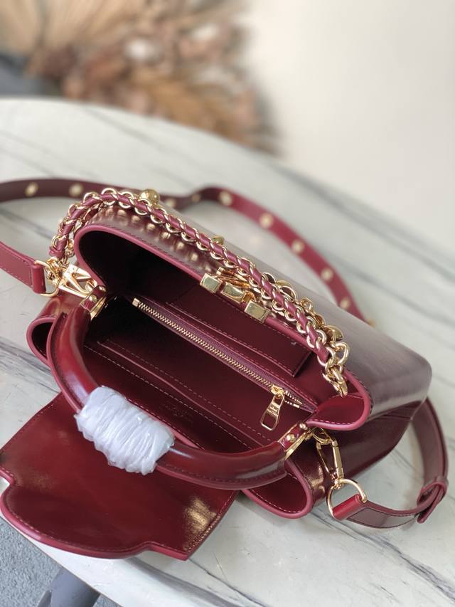 Factory Price P Premium Original Leather M25473 Burgundy Oil-Waxed Leather Small Capucines East-Westbb handbag. This Capucines East-Westbb handbag subtly showcases the leather's wrinkled texture, subtly conveying the new season's trendy style. The cowhide leather trim outlines smooth lines, and the LV logo and detachable chain shimmer with metallic sheen. The spacious interior meets various storage needs, and multiple carrying options demonstrate its functional ingenuity. Size: 26.5 * 14 * 8 cm