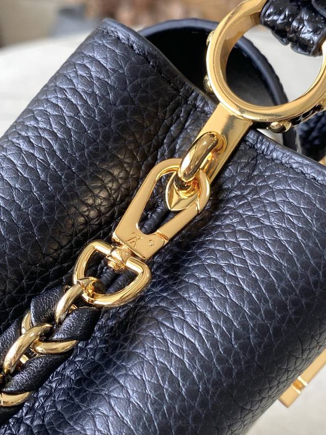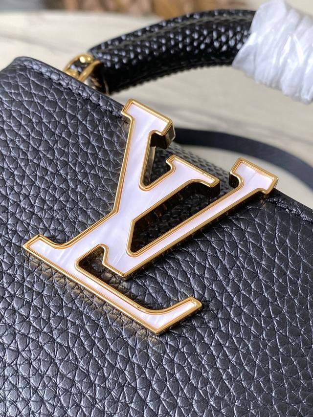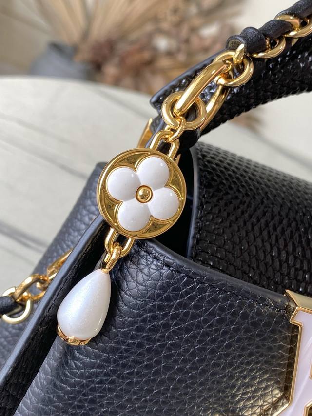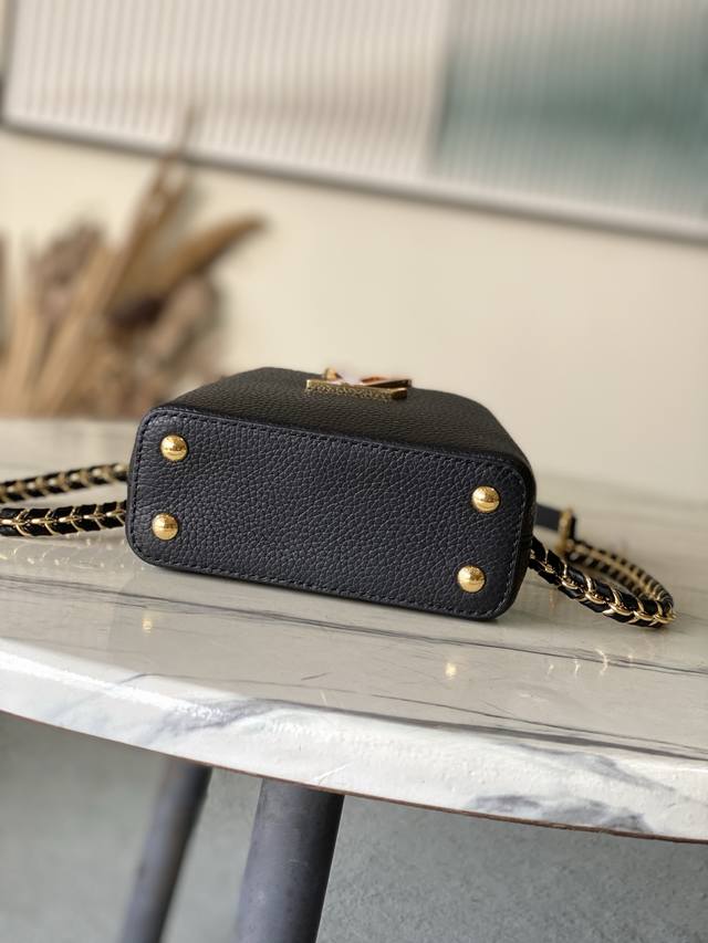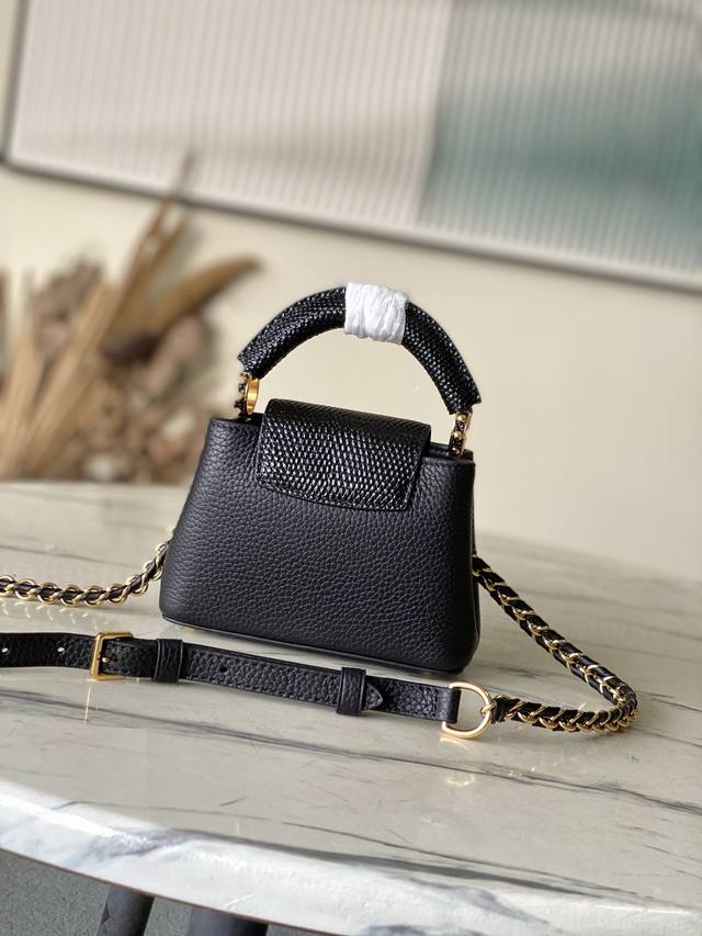 Factory Price P Premium Original Leather M25611 Black Lizard Mother-of-Pearl Chain Super Mini Handbag This handbag is from the Capucines Daydream series. It features Taurillon cowhide in a modern dyed hue, paired with shell-textured elements, the iconic LV logo, and a detachable woven chain. Cowhide and snakeskin trim create a contrasting effect. The flap offers two styles: external or internal. It easily accommodates a short wallet and small essentials. Size: 16 * 11 * 6 cm