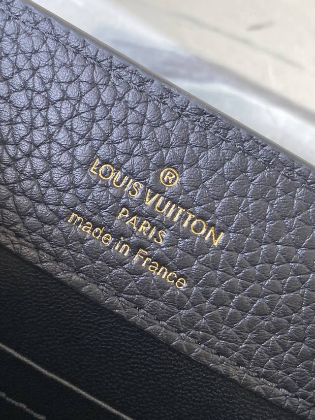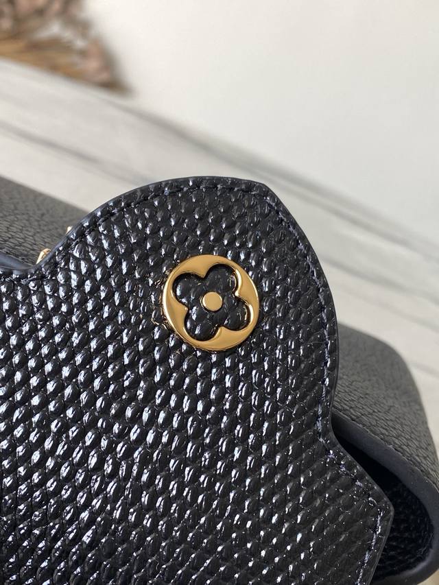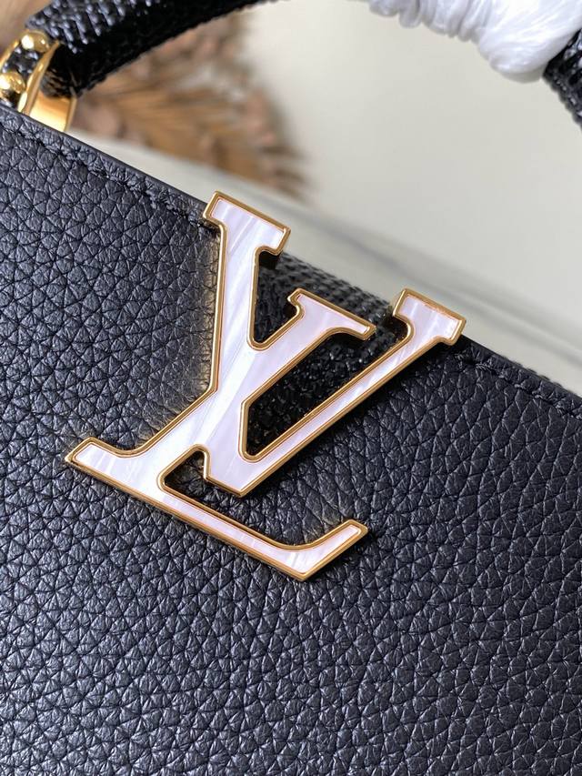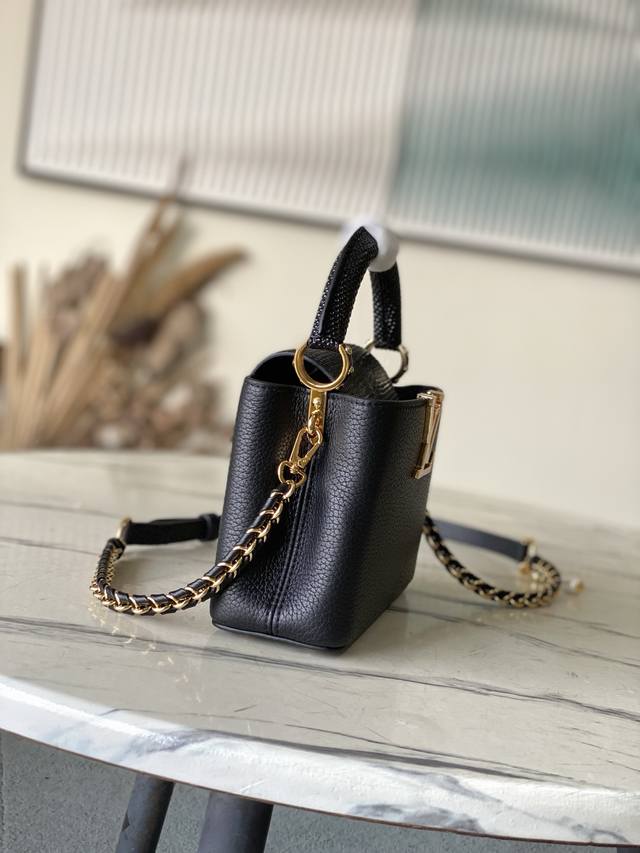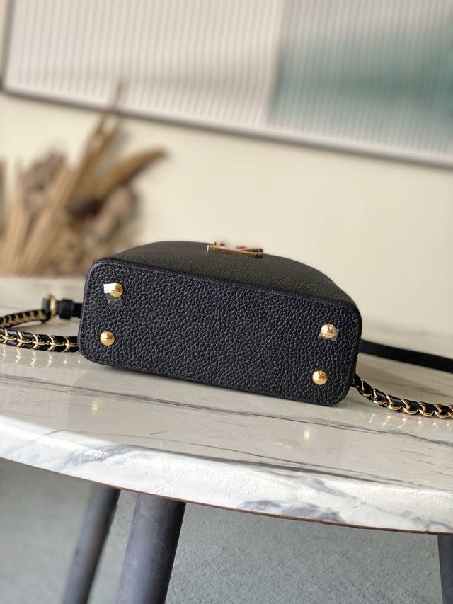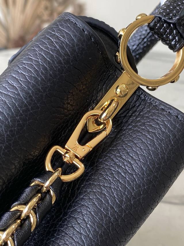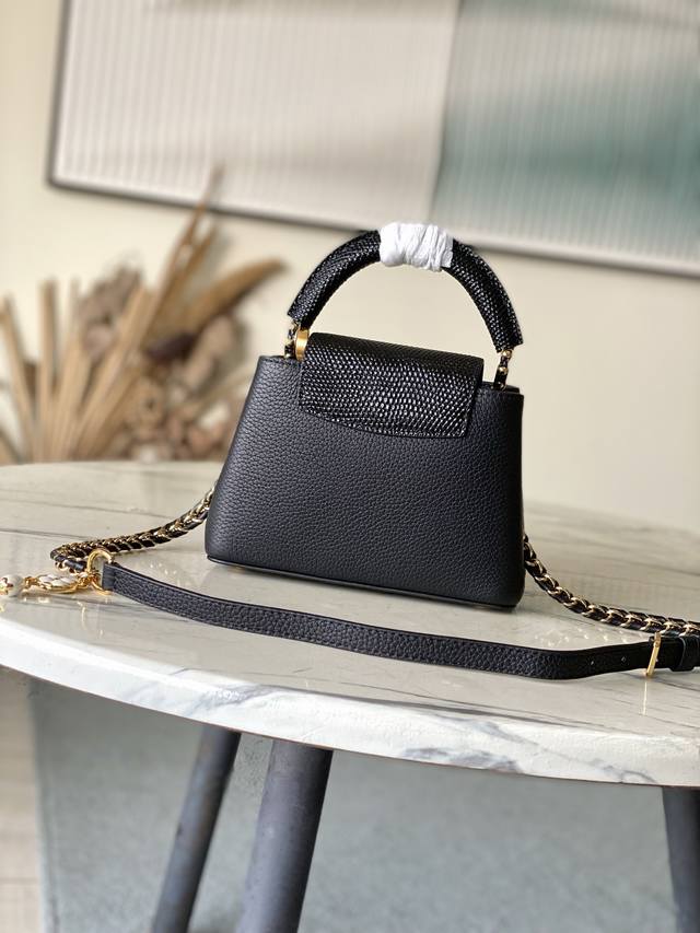 Factory Price P Premium Original Leather M25611 Black Lizard Mother-of-Pearl Chain Mini Handbag. This handbag is from the Capucines Daydream series. It features Taurillon cowhide in a modern dyed hue, paired with shell-textured elements, the iconic LV logo, and a detachable woven chain. Cowhide and snakeskin trim create a contrasting effect. The flap offers two styles: external or internal. It easily accommodates a short wallet and small essentials. Size: 21 * 14 * 8 cm.