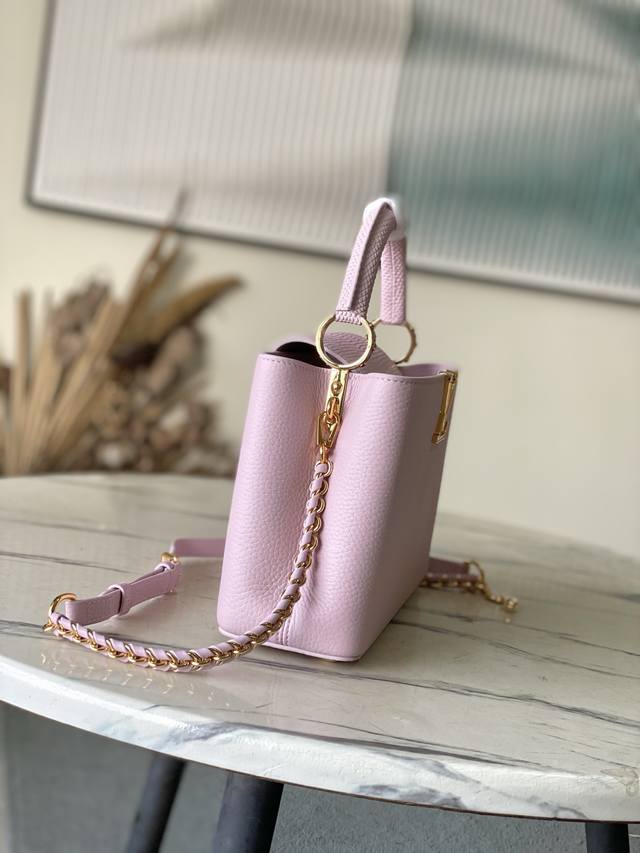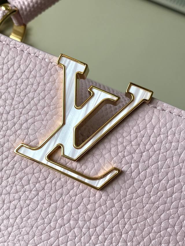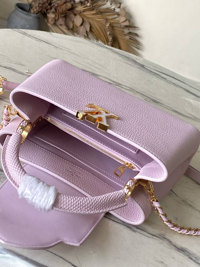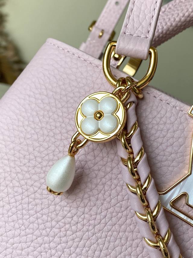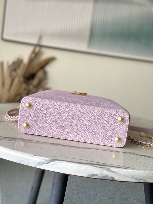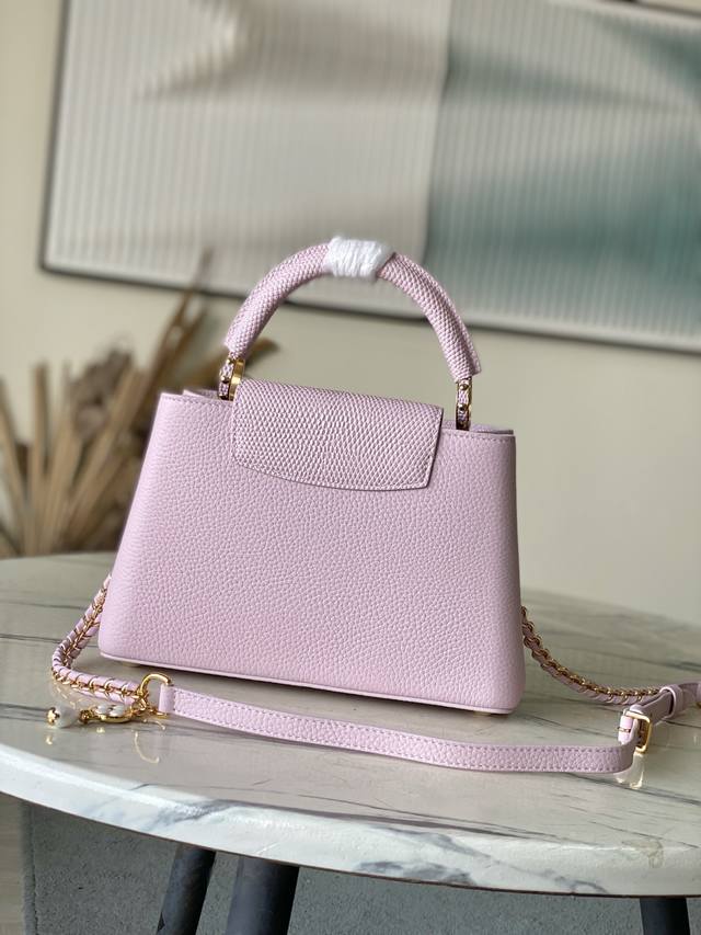 Factory Price P Premium Original Leather M25611 Pink Lizard Mother-of-Pearl Chain Small This handbag is from the Capucines Daydream series. It features Taurillon cowhide in a modern dyed hue, paired with shell-textured elements, the iconic LV logo, and a detachable woven chain. Cowhide and snakeskin trim create a contrasting effect. The flap offers both external and internal styles, easily accommodating a short wallet and small essentials. Size: 27 * 18 * 9 cm