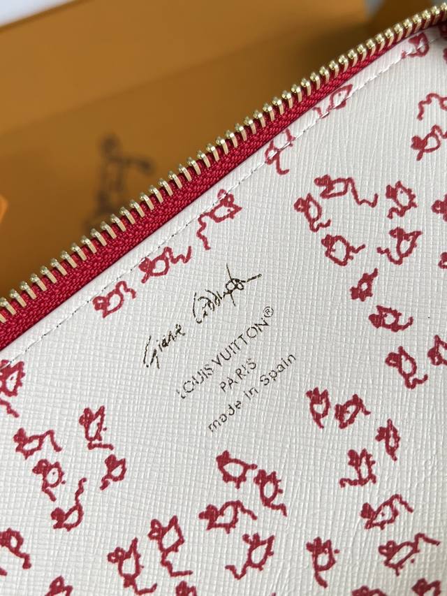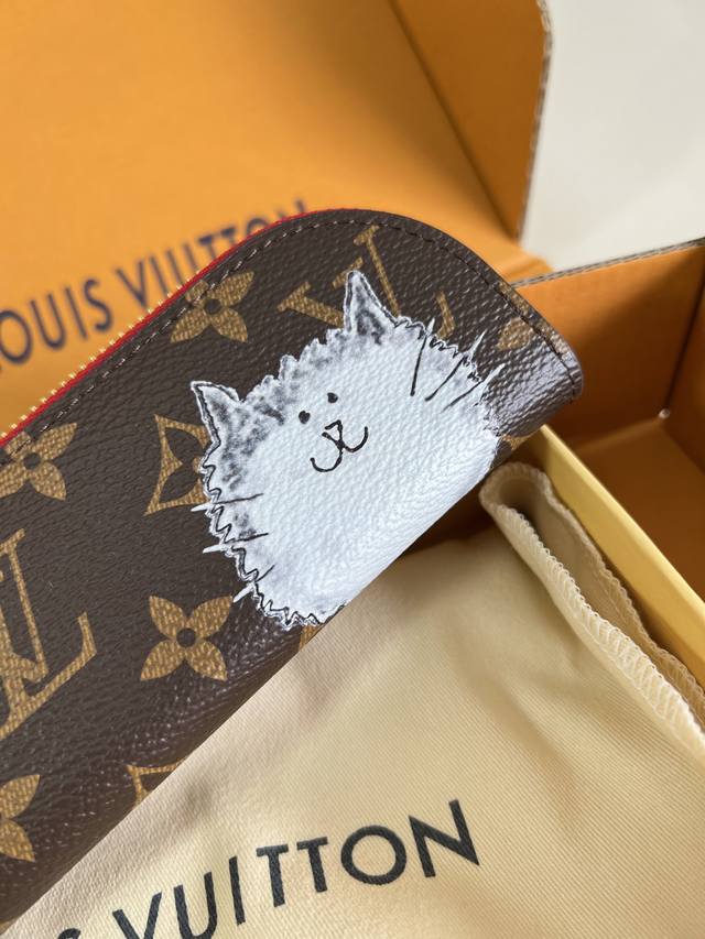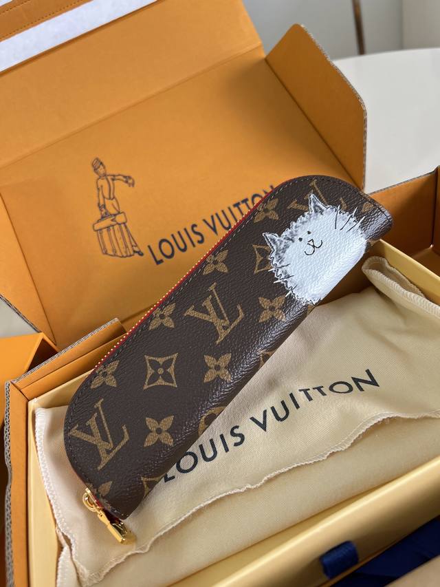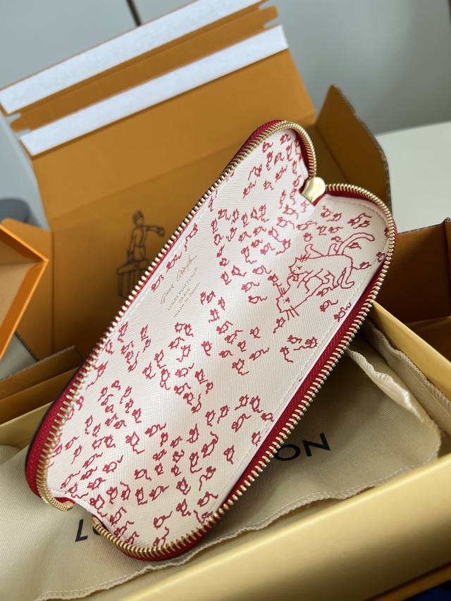 Factory Price P Top-Tier Original Item Gl1396 This Charlotte pencil case features exquisite illustrations by Grace Coddington, adding a touch of sophistication to classic elements. The outer Monogram coated canvas is adorned with a smiling cat pattern, while the inner leather features more cat patterns surrounded by mice. The pencil case is finished with a gold zipper and striking red stripes, highlighting its elegant style. 20X7X2Cm