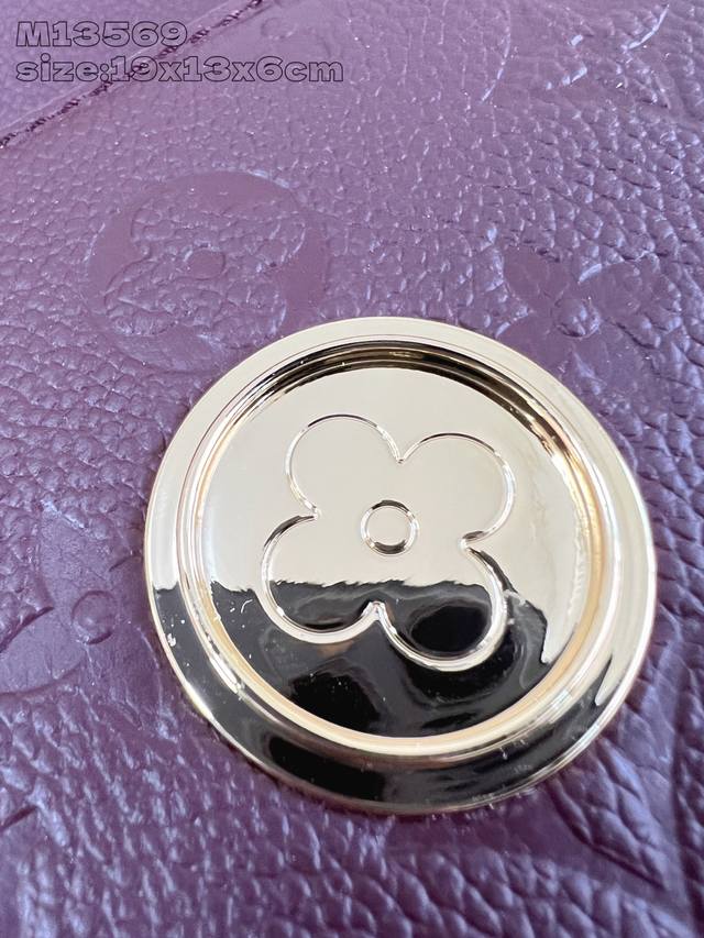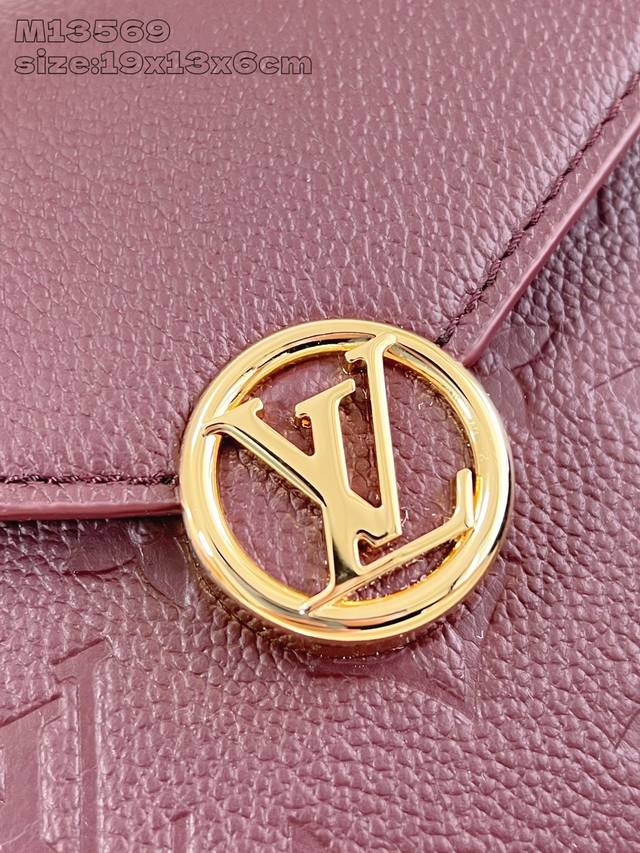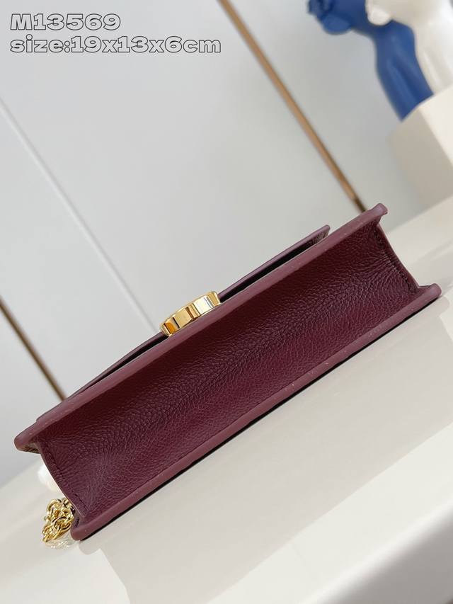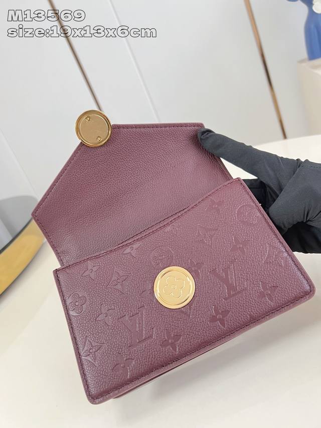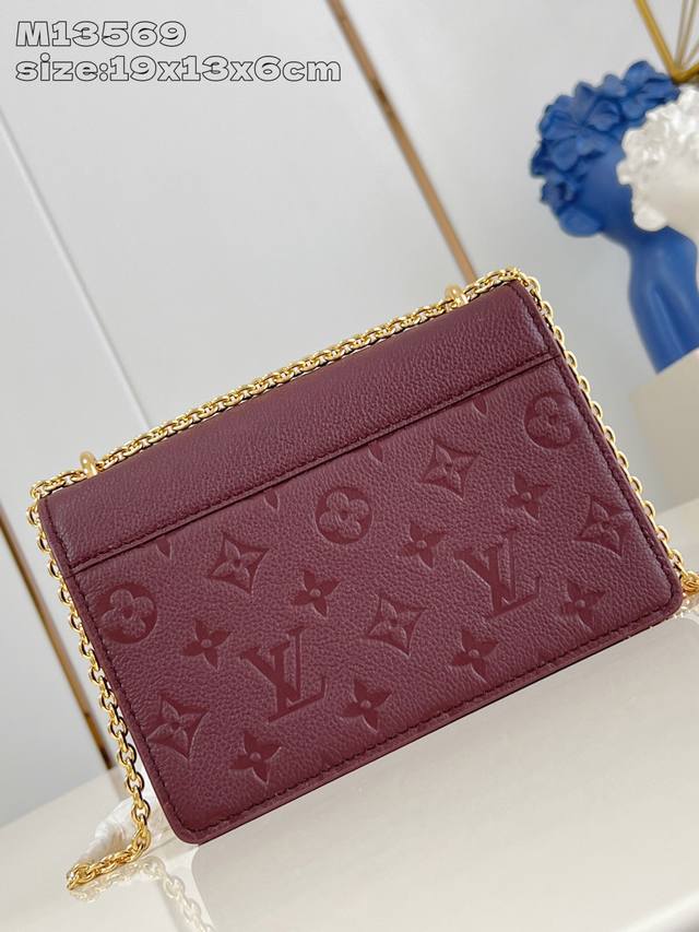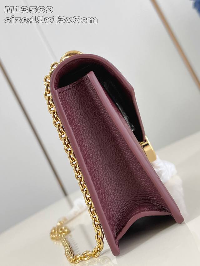 Factory Price P Top-Tier Original M13569 Purple Red M25814 This Wallet On Chain Rosy combines practicality and style, infusing the Monogram Empreinte collection with a modern feel. Adorned with Louis Vuitton's iconic symbols, including the elegant LV Circle logo and a flowing V-shaped flap, the bag reveals a stunning Monogram floral pattern when the magnetic closure is opened. It features three cardholders and one interior slip pocket, and a sliding chain strap for crossbody or shoulder carrying. 19.5 x 13.5 x 6.5 cm Length x Height x Width