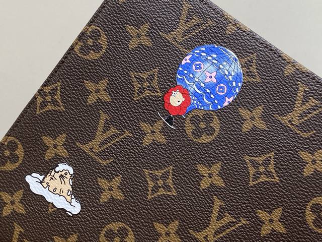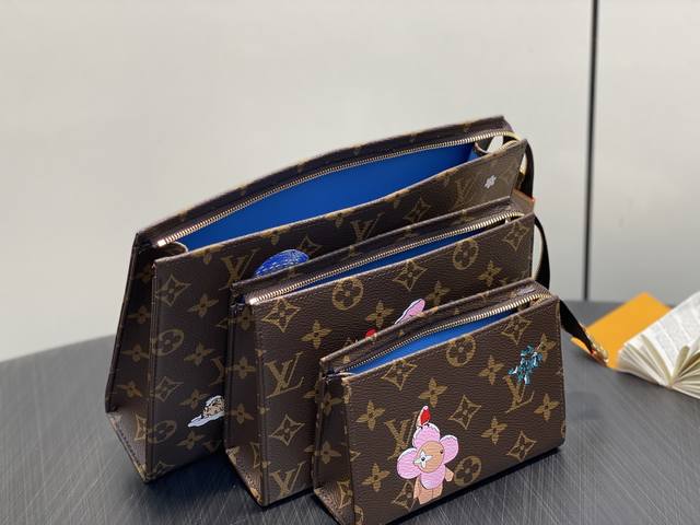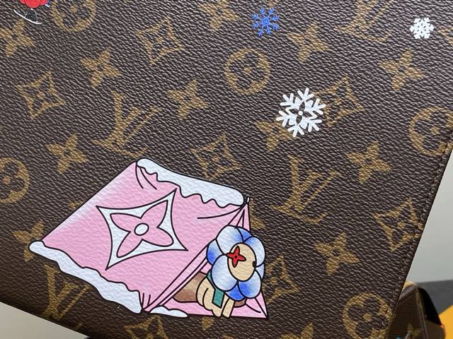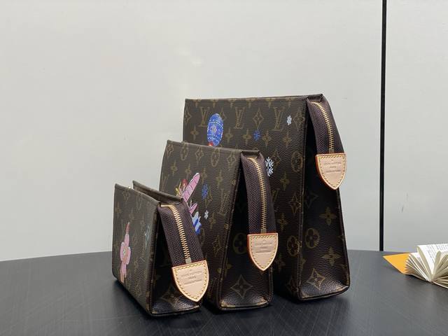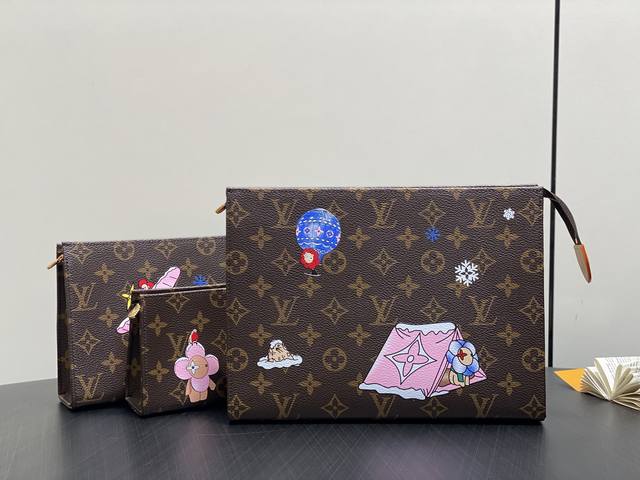 Factory Price P Top-Tier Original M15357 Silkscreen Christmas Three-Piece Set, New Seasonal Trio Toilet Bag. This toilet bag is made of Monogram coated canvas, cleverly presenting the brand's mascot's fantastical adventure. Vivienne travels by train, bike, hike, and even soars through the sky in a hot air balloon, encountering adorable winter animals. The washable fabric lining is convenient for storing cosmetics and other personal care items. 20 x 5.5 x 25 cm.