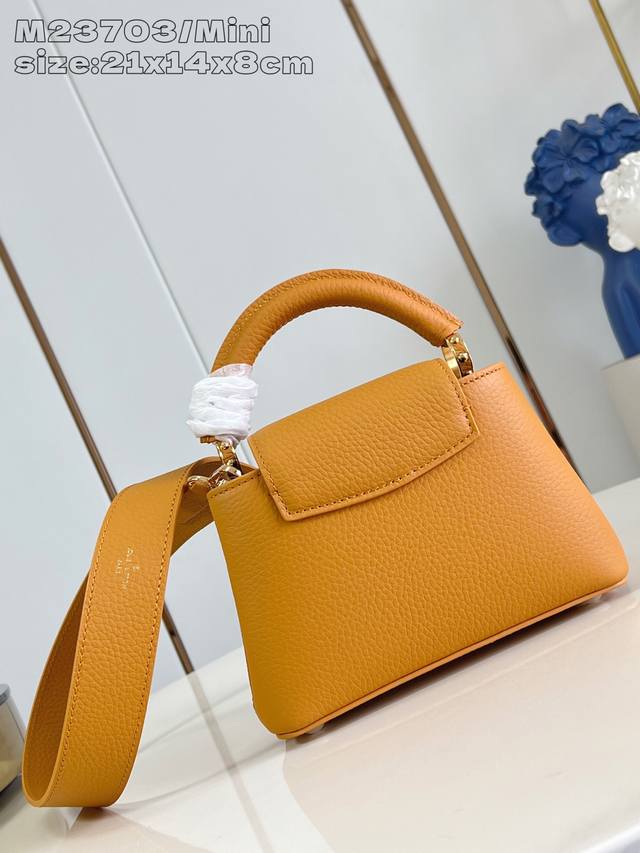 Factory Price P Top-Tier Original M23703 Orange Mini Capucines Handbag. This mini handbag is crafted from Taurillon calfskin in a rich hue, accented with a handle loop and LV lettering for a striking design. Its compact size encapsulates a classic silhouette, and the detachable shoulder strap allows for comfortable shoulder or crossbody wear. 13.6 x 8 x 21 cm (H x W x Length)