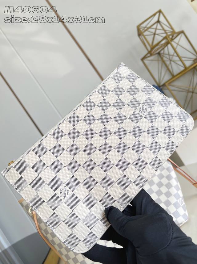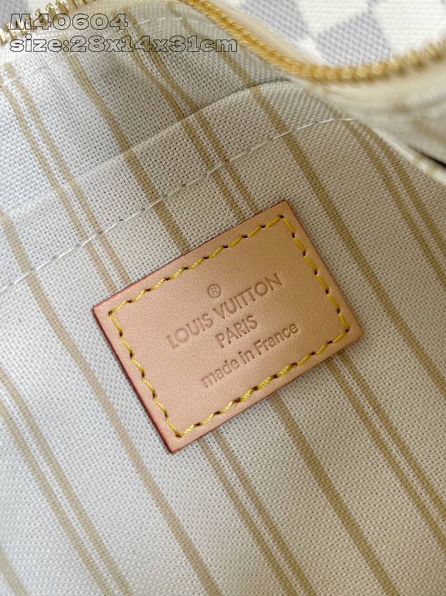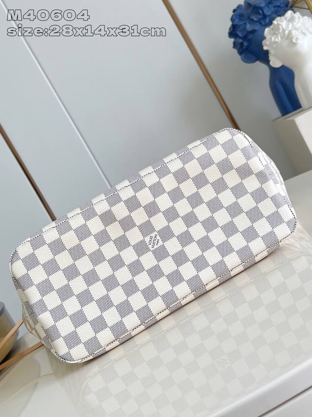 Factory Price P Top-Tier Original M40604 This Neverfull medium tote bag features Damier Azur canvas outlined with cowhide leather trim, and a vibrant fabric lining integrated into its spacious design. The side straps offer different styles whether tightened or loose. The slim leather handles are convenient for shoulder or elbow carrying, and the detachable zip pocket can be used as a clutch or pocket. 28 x 14 x 31 cm (H x W x Length)
