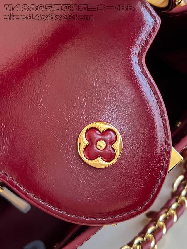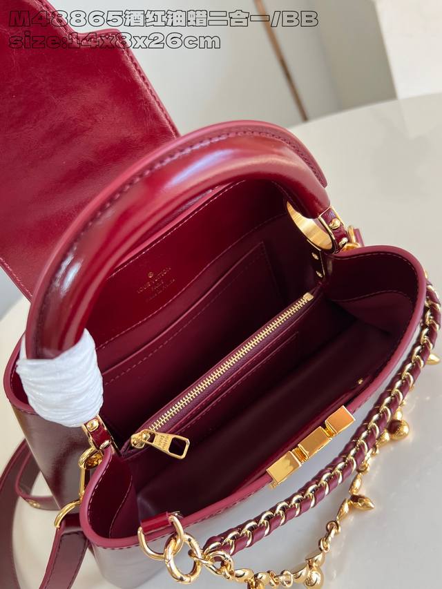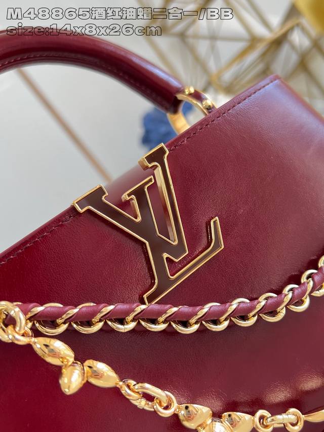 Factory Price P Top-Tier Original M48865 Burgundy Oil-Wax Two-in-One Small Capucines East-West BB Handbag. This Capucines East-West BB handbag subtly reveals the textured folds of the leather, eloquently narrating the new season's trendy style. Cow leather trim outlines smooth lines, while the LV logo and detachable chain shimmer with metallic luster. The spacious interior accommodates various storage needs, and multiple carrying options showcase its functional ingenuity. 14 x 8 x 26.5 cm (H x W x Length)