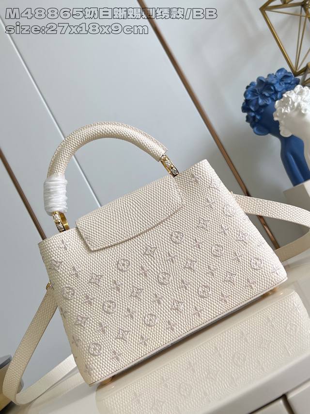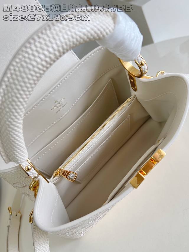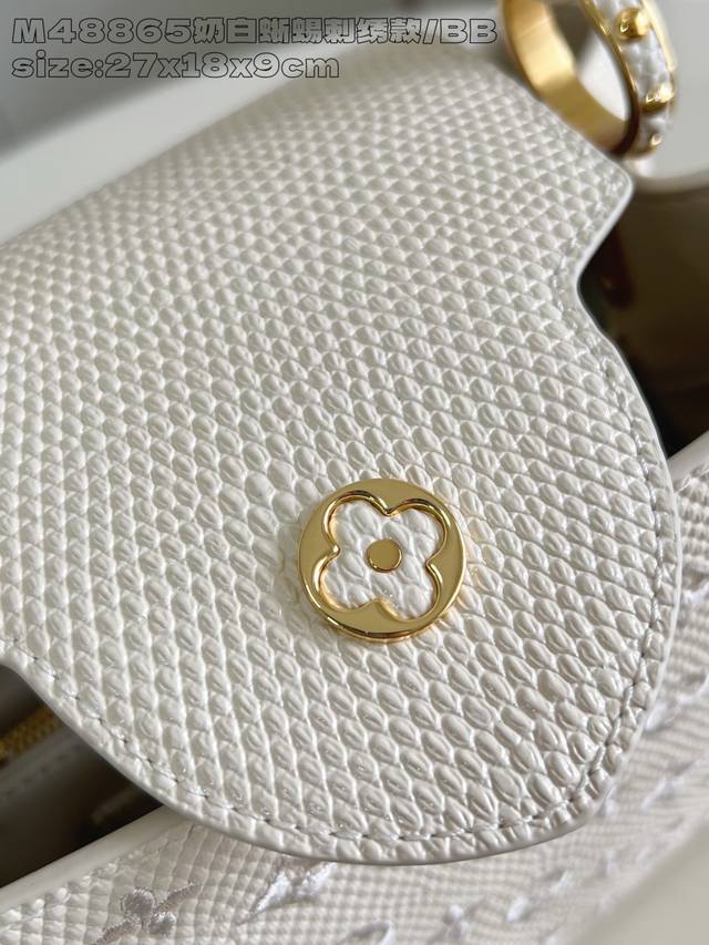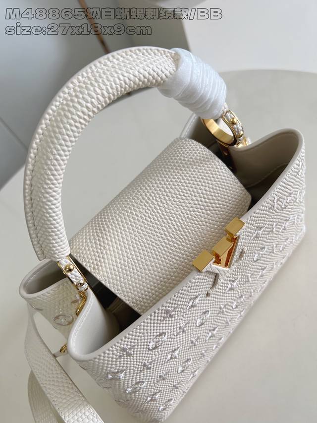 Factory Price P Top-Tier Original M48865 Milk White Lizard Embroidery Small Capucines BB Handbag This Capucines BB handbag features a delicate design crafted from Taurillon leather, with the flap, handles, and LV logo wrapped in lizard leather. The flap can be worn open or closed to read the LV logo, and the detachable wide leather shoulder strap exudes modern style. 27 x 9 x 18 cm (H x W x Length)