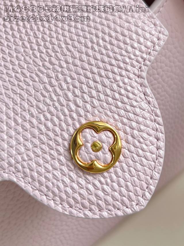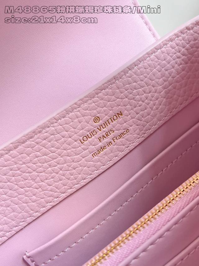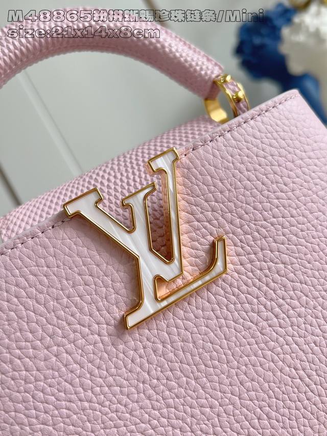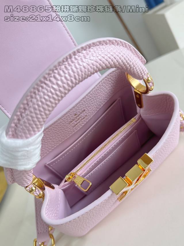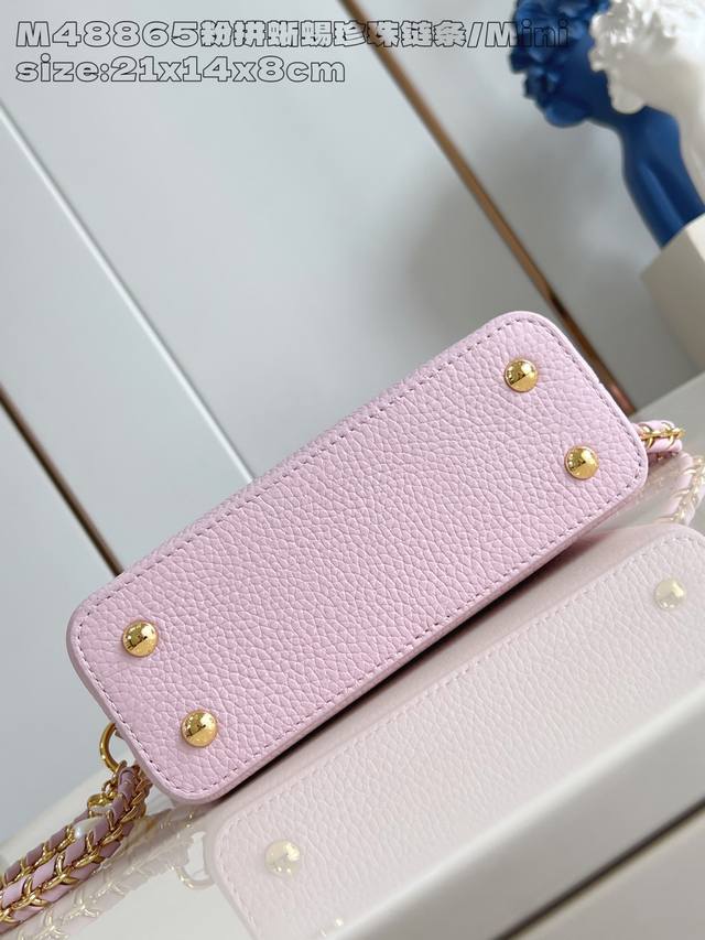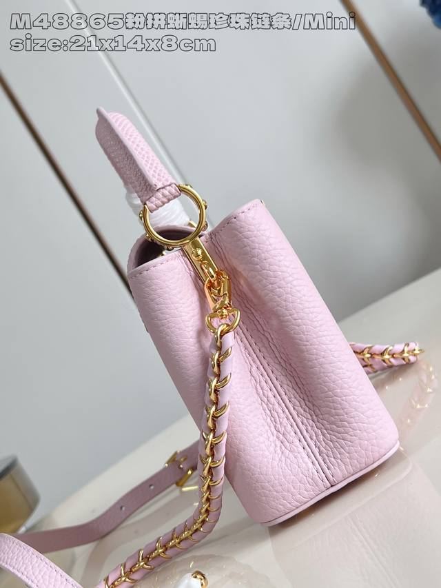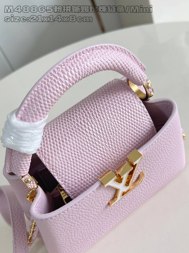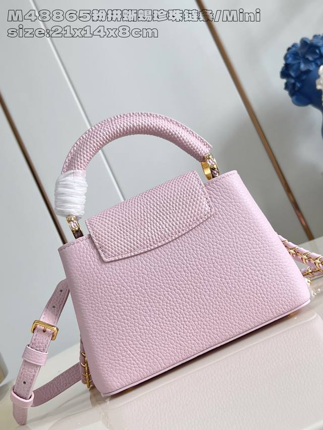 Factory Price P Top-Tier Original M48865 Pink Lizard Pearl Chain Mini Capucines Mini handbag. This Capucines Mini handbag features a delicate design crafted from Taurillon leather, with the flap, handles, and LV logo wrapped in lizard leather. The flap can be opened or closed to read the LV logo, and the detachable wide leather shoulder strap exudes modern style. Size: 21X14X8Cm